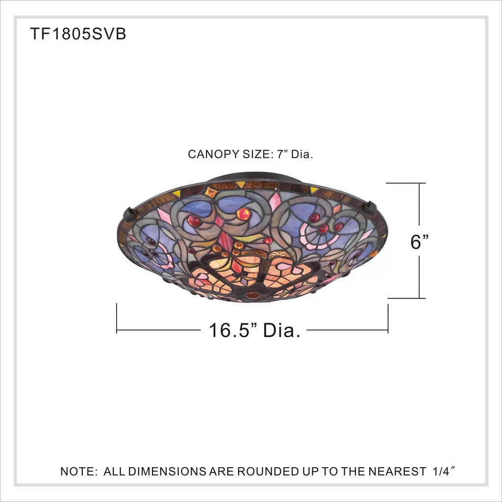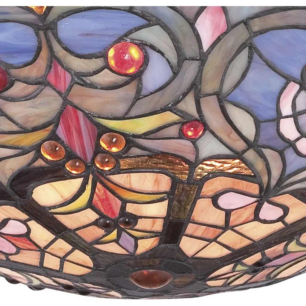 A staple of stained glass that will forever be in style this statement flush mount features an arrangement of art glass that evokes a heart pattern accented with jewels in red and amber. The Vintage Bronze finish completes the look.