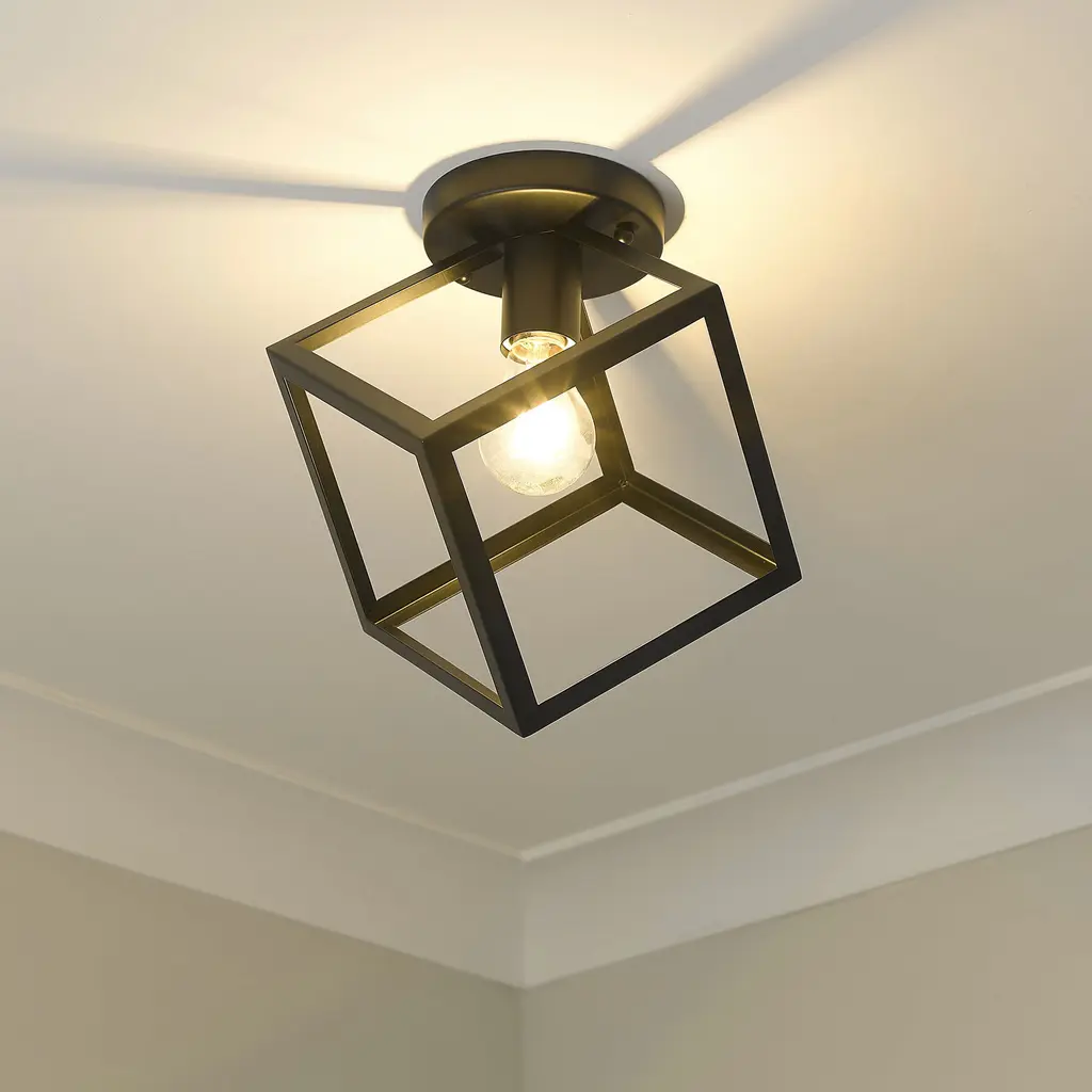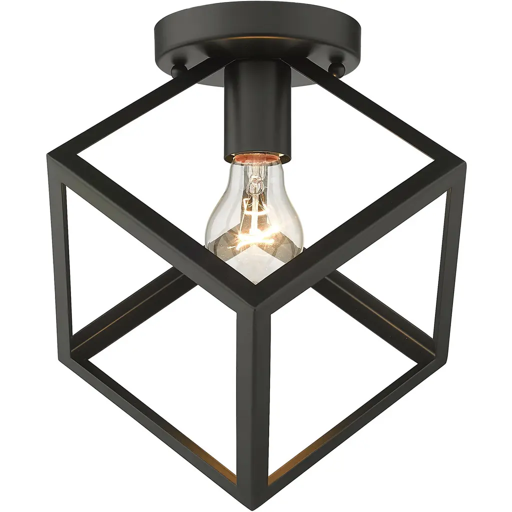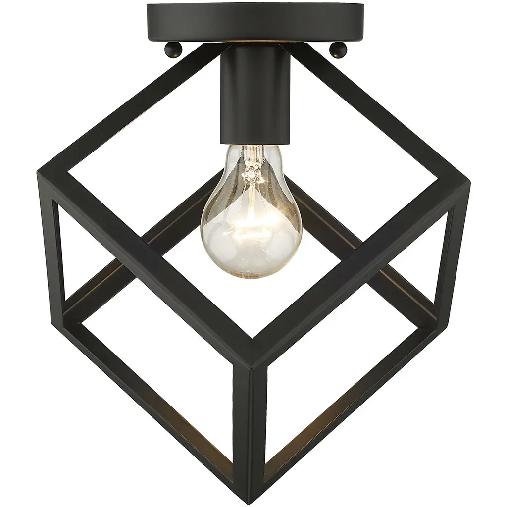 Bring industrial elegance into your home with the Golden Lighting Cassio 1-light Flush Mount. Featuring a metal shade and a matte black frame, it creates a welcoming atmosphere. The open-frame cage design and exposed bulbs highlight this fixture's raw metal texture, adding bold character to your space. Our matte black finish is both timeless and versatile, offering a smooth touch and understated elegance that complements various decors. Ideal for hallways, closets, and bathrooms, this damp location rated fixture suits covered spaces with occasional moisture. It requires 1 E26 medium base bulb (not included) with a max wattage of 60. Overall dimensions are 11.25"W x 11"H x 9.25"D, providing compact yet wide illumination. Embrace quality craftsmanship and a stylish aesthetic with the Golden Lighting Cassio.