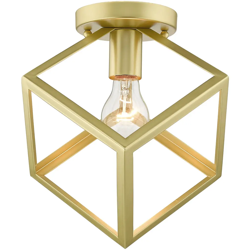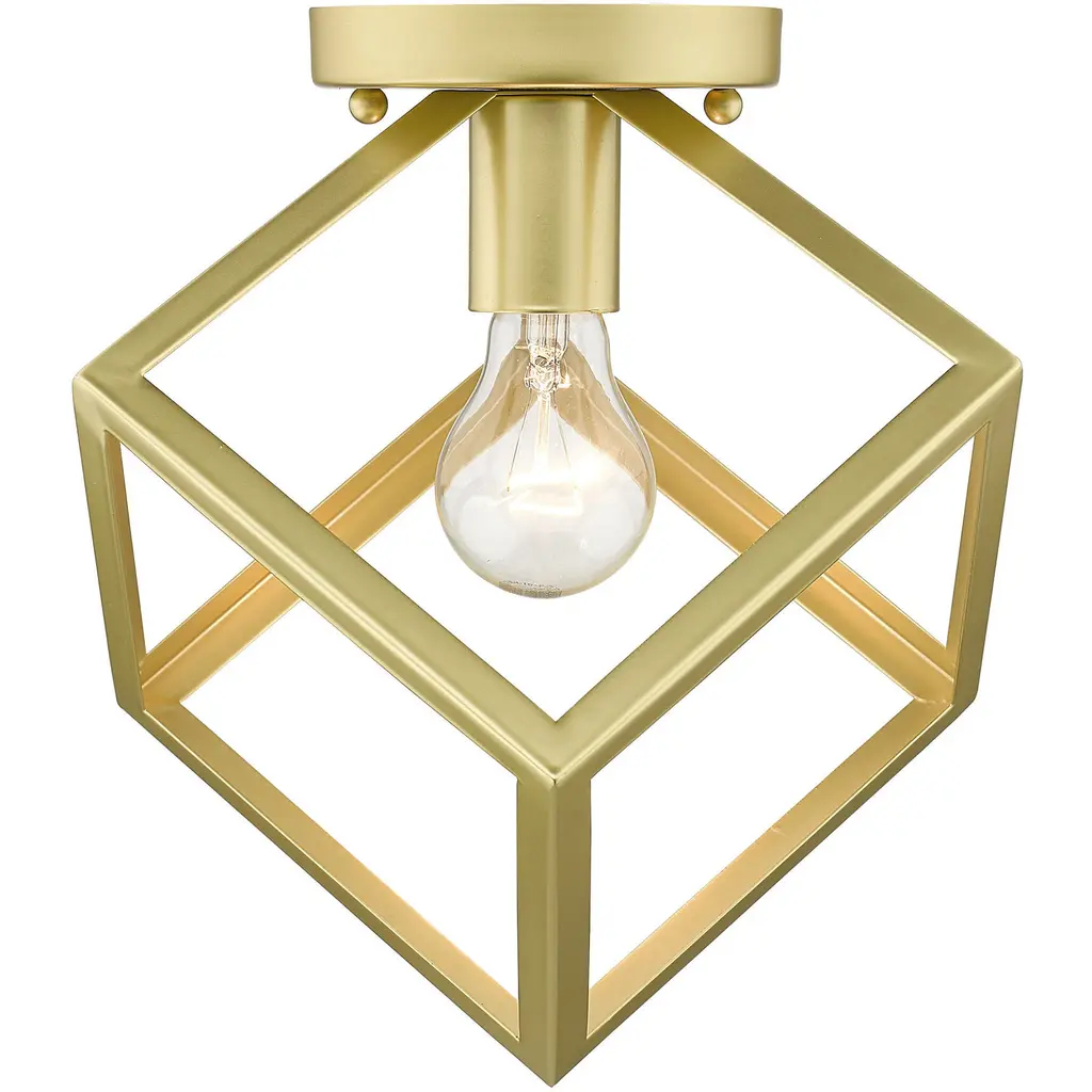 Bring industrial elegance into your home with the Golden Lighting Cassio 1-light Flush Mount. Featuring a metal shade and an Olympic gold frame, it creates a welcoming atmosphere. The open-frame cage design and exposed bulbs highlight this fixture's raw metal texture, adding bold character to your space. Our Olympic gold finish is a chic, understated take on metallics, offering a creamy and luminous quality that beautifully diffuses light. Ideal for hallways, closets, and bathrooms, this damp location rated fixture suits covered spaces with occasional moisture. It requires 1 E26 medium base bulb (not included) with a max wattage of 60. Overall dimensions are 11.25"W x 11"H x 9.25"D, providing compact yet wide illumination. Embrace quality craftsmanship and a stylish aesthetic with the Golden Lighting Cassio.
