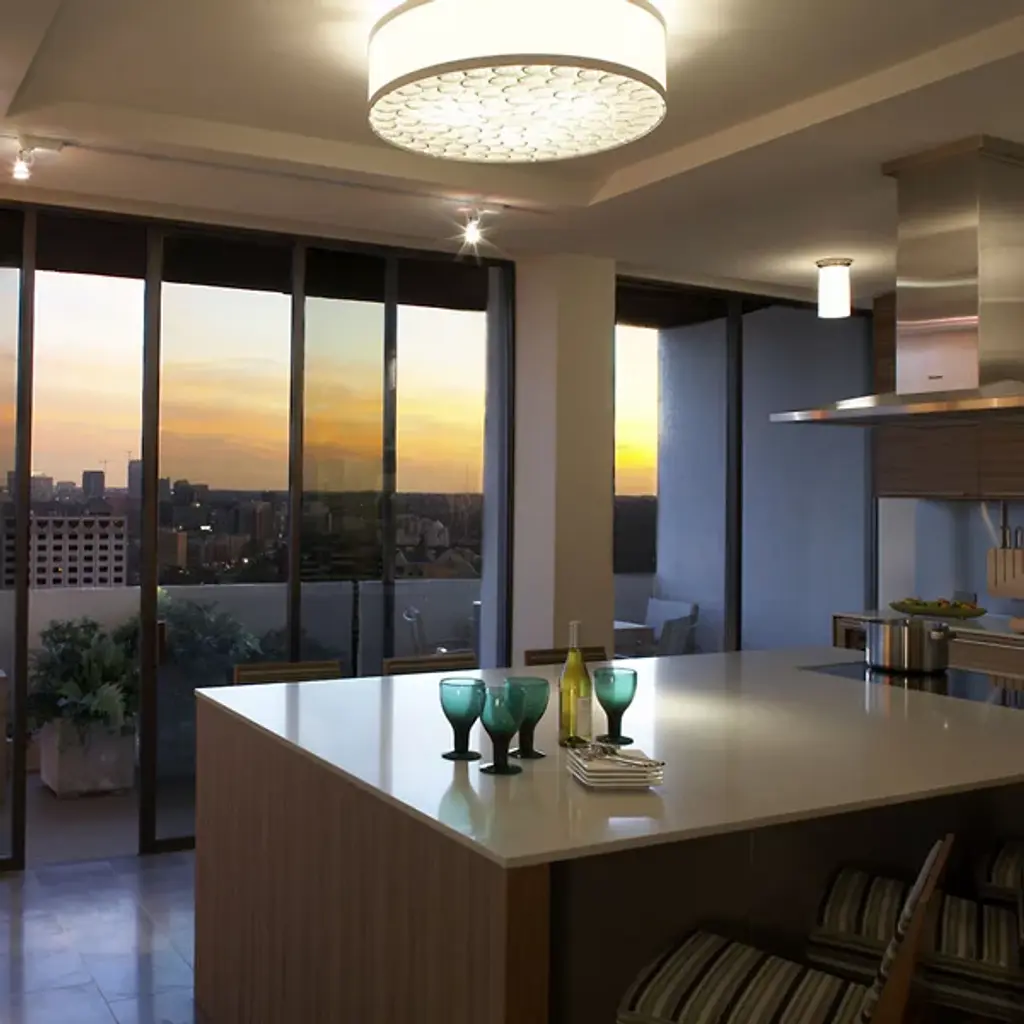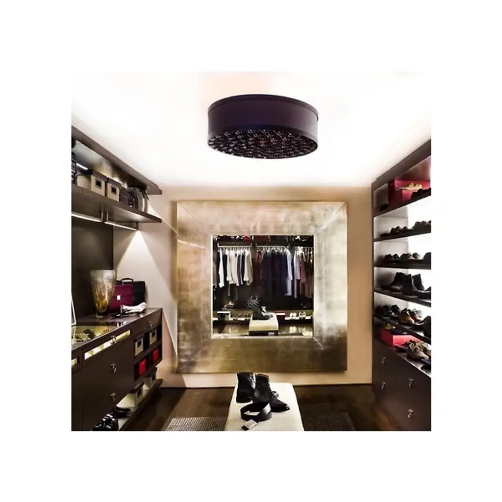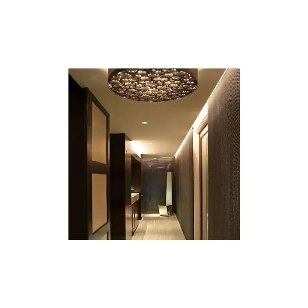 Patterned with tightly coiled rings, the Boyd Lighting Catacaos Flushmount undertakes traditional methods of metalworking within a broad fabric shade. Based on handcrafted metal filigree, the rippling apertures screen a hidden interior diffuser, diminishing direct glare below with spiraling shadows. The wide drum shade suspends slightly below the ceiling, spreading a concentrated halo of light against the ceiling as well.