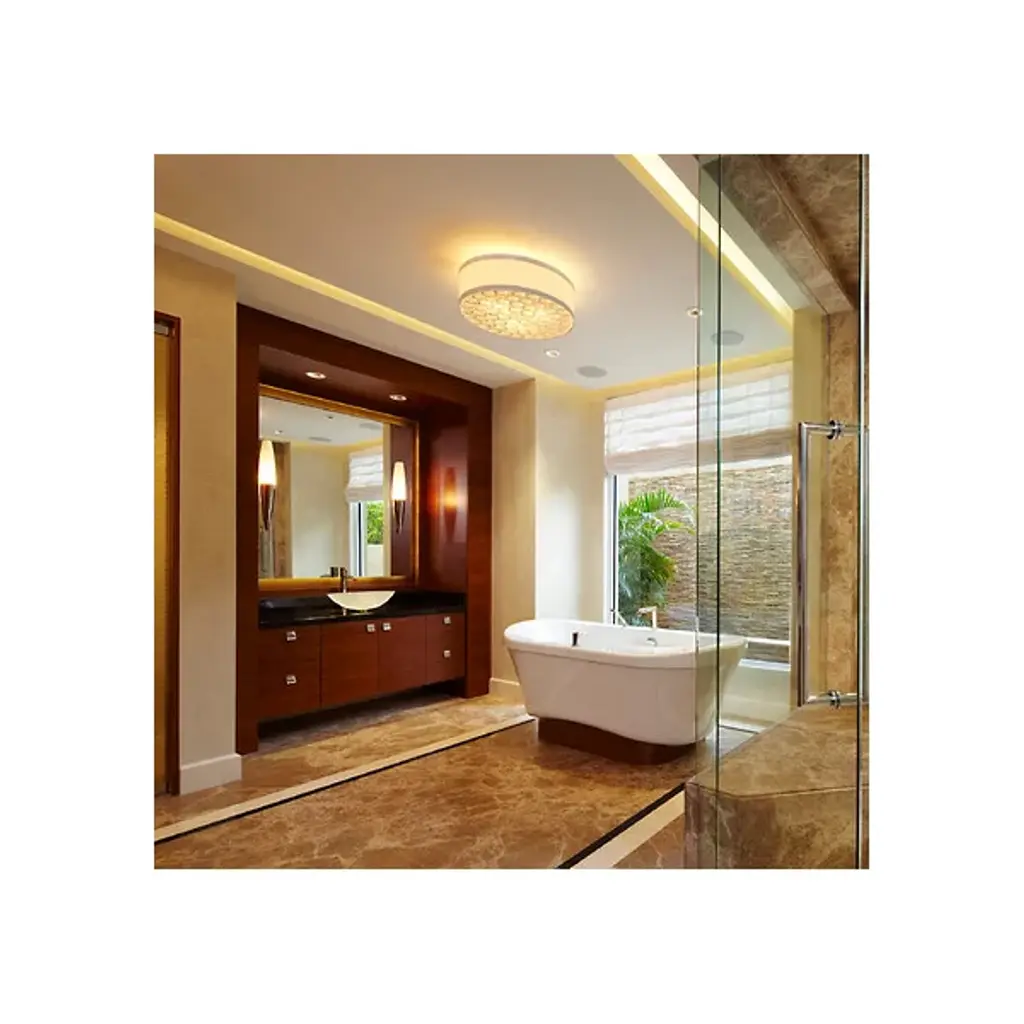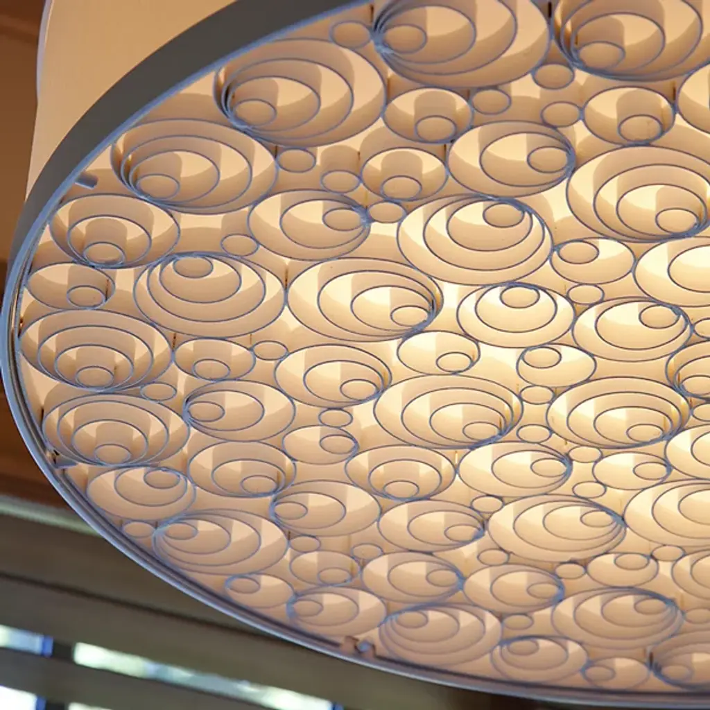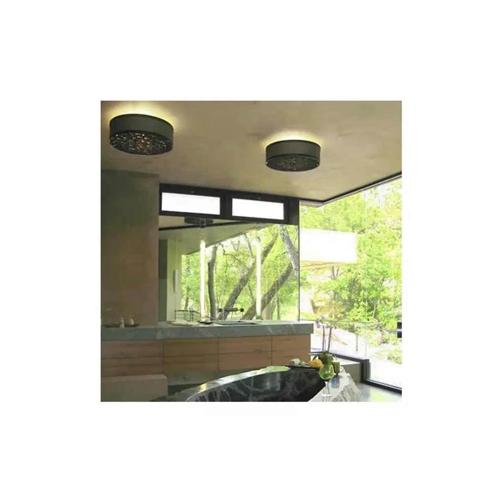 Patterned with tightly coiled rings, the Boyd Lighting Catacaos Flushmount undertakes traditional methods of metalworking within a broad fabric shade. Based on handcrafted metal filigree, the rippling apertures screen a hidden interior diffuser, diminishing direct glare below with spiraling shadows. The wide drum shade suspends slightly below the ceiling, spreading a concentrated halo of light against the ceiling as well.