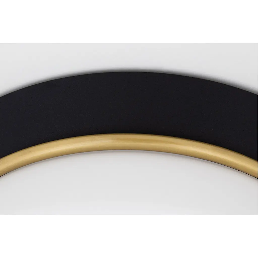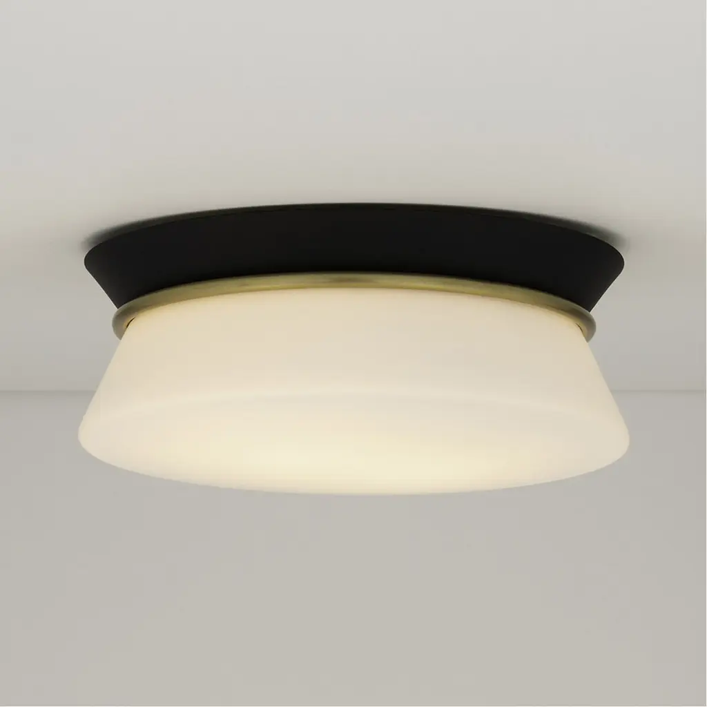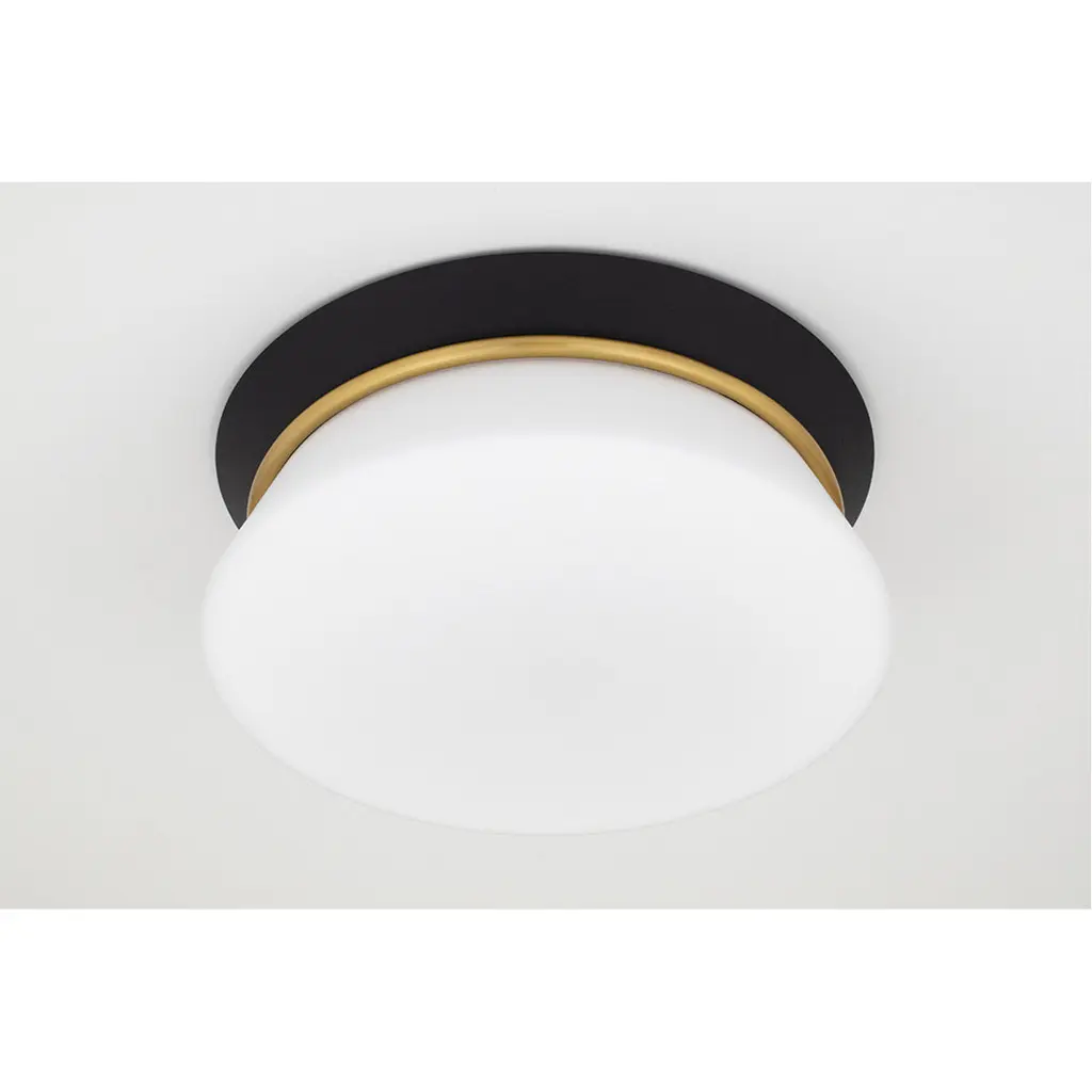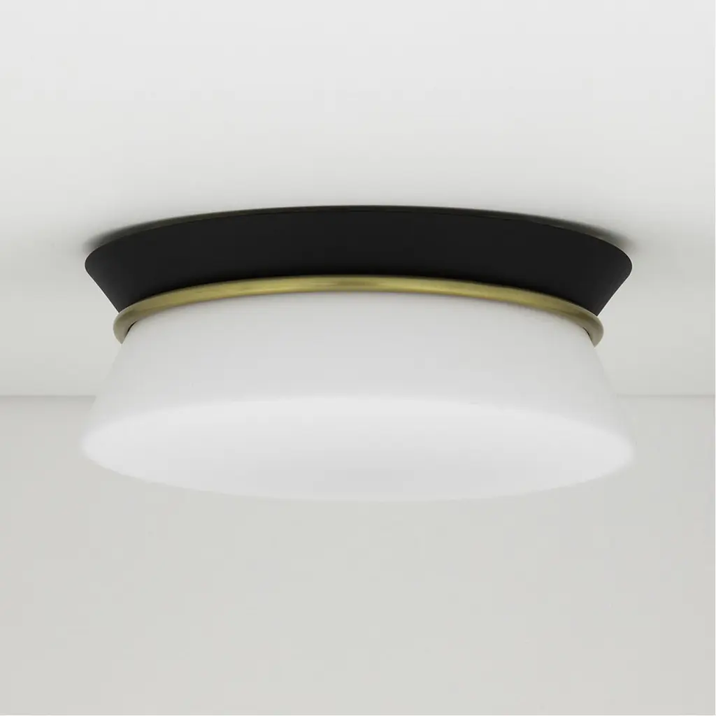 Elevate your ceiling's style with this simple yet sophisticated flush mount. A ribbon of metal separates the black canopy from the opal glass shade for a triple color effect that gives this circular fixture three times the style. Choose from Polished Nickel/Black or Aged Brass/Black.