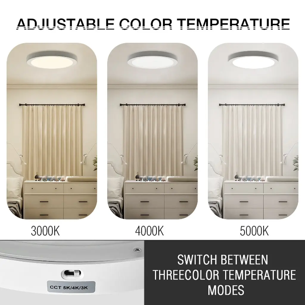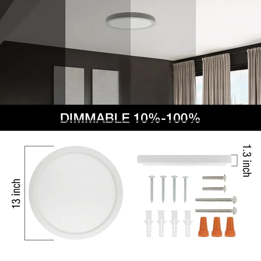 The 13-inch LED flush mount ceiling light is designed to fit seamlessly into various spaces, making it suitable for small to medium-sized rooms or areas. With a high lumen output of 2400lm, this ceiling light delivers ample brightness to illuminate the room effectively. The integrated night light feature adds an additional layer of convenience and versatility to the ceiling light. It provides a subtle and gentle glow during nighttime hours, allowing for enhanced visibility without disturbing sleep or creating harsh lighting conditions.