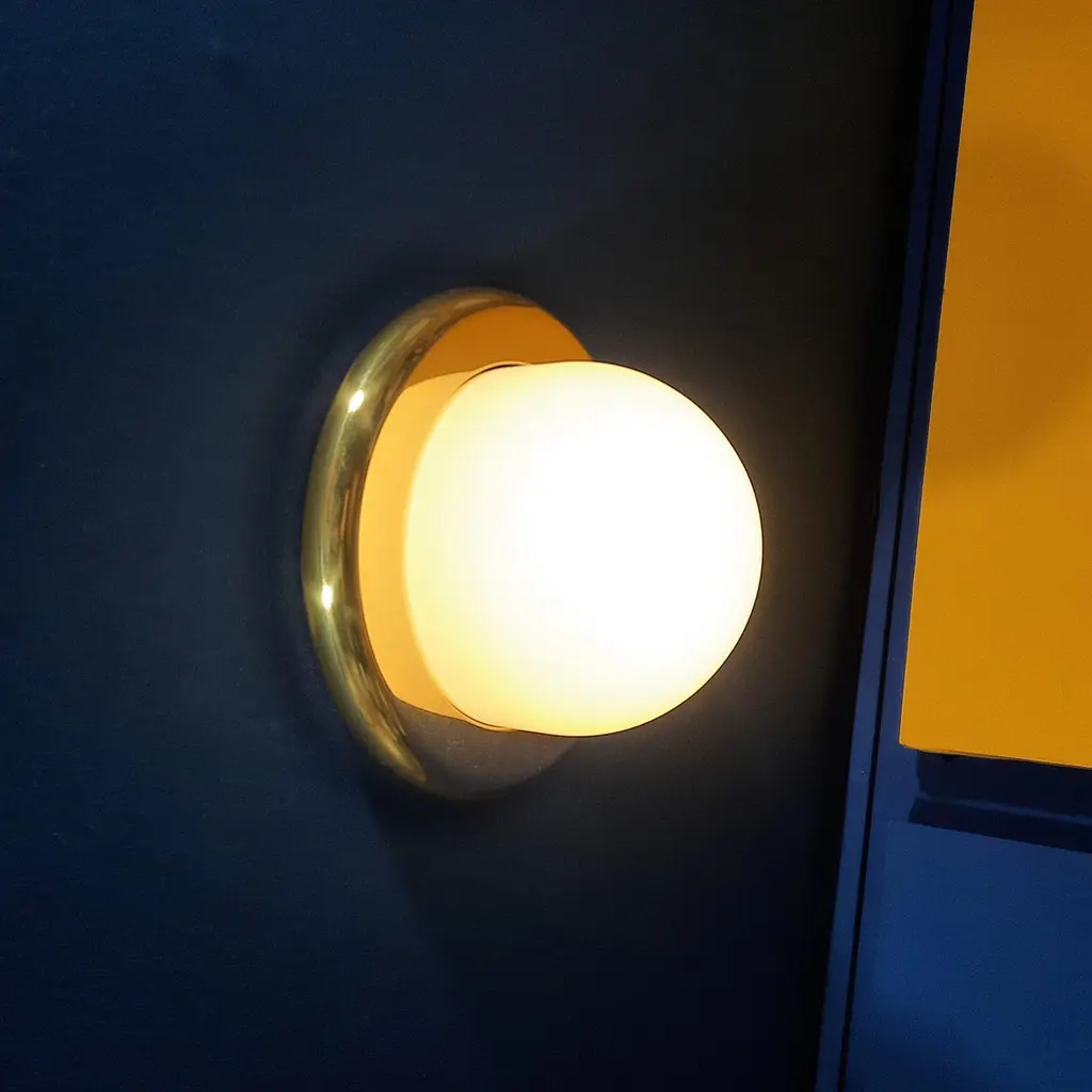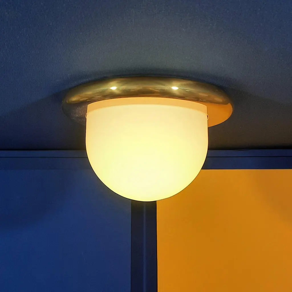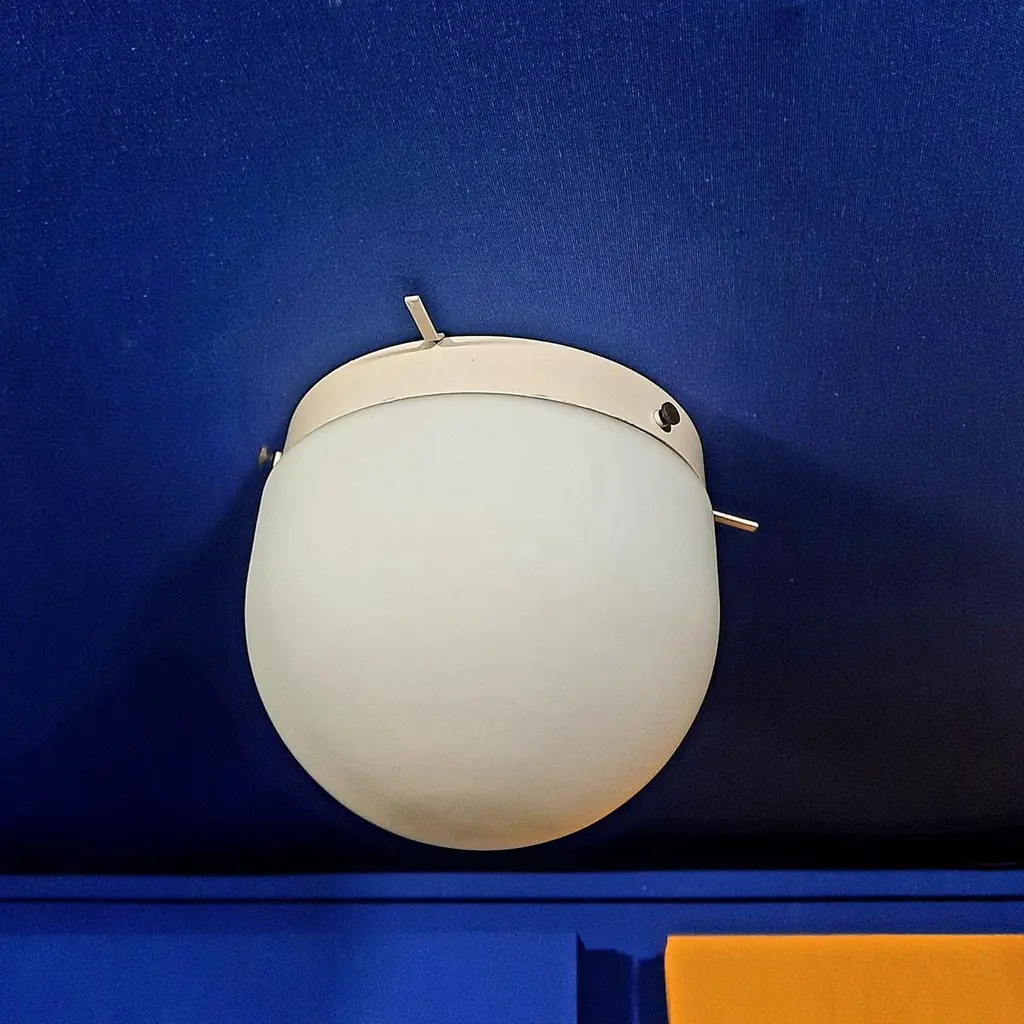 This plafonnier is in the style of Luigi Caccia Dominioni, Jean Perzel or Valenti Luce and is probably from the end of the 1960's.The globe is a white opaline with a mat finish blown and made by hand. The collar is made out of brass and the finish is varnished.Some of the globes still has the original "Made in Murano" sticker.Dimensions:Hight: 20cm / 7,87In.Diameter: 32cm / 12,60In.These pieces are made by hand, each piece is unique and its dimensions may vary. Electric cables has been replaced and socket has been changed.It is rewired for 110V-150v to 220V-240V (US and UE Norms).Bulb light not included as it depends on the voltage of your country.You have a large-scale project ?Please contact us through our contact chip on 1stdibs, we can look for special pieces, numbers of pieces and custom services. We are specialised in italian brand lightings as A.V.Mazzega, Leucos, Venini, Martinelli Luce, La Murrina, Lumenform, Stilnovo, Esperia Luce, Flos, Artemide (and so on) and designers like Aldo and Carlo Nason, Pier Giacomo and Achille Castiglioni, Toso family, Roberto Pamio, Angelo Brotto, Gae Aulenti beside many others.