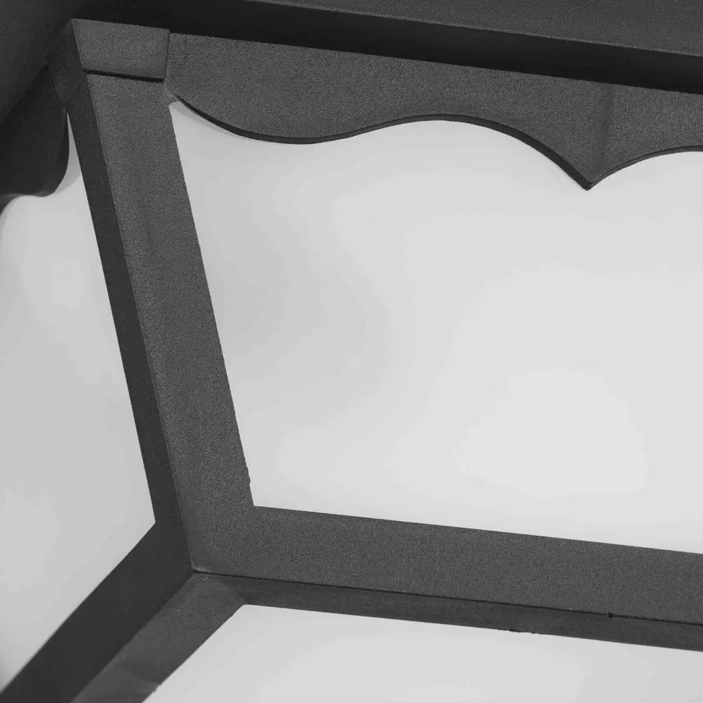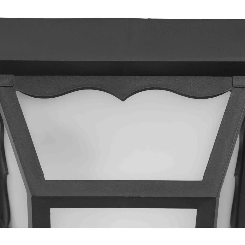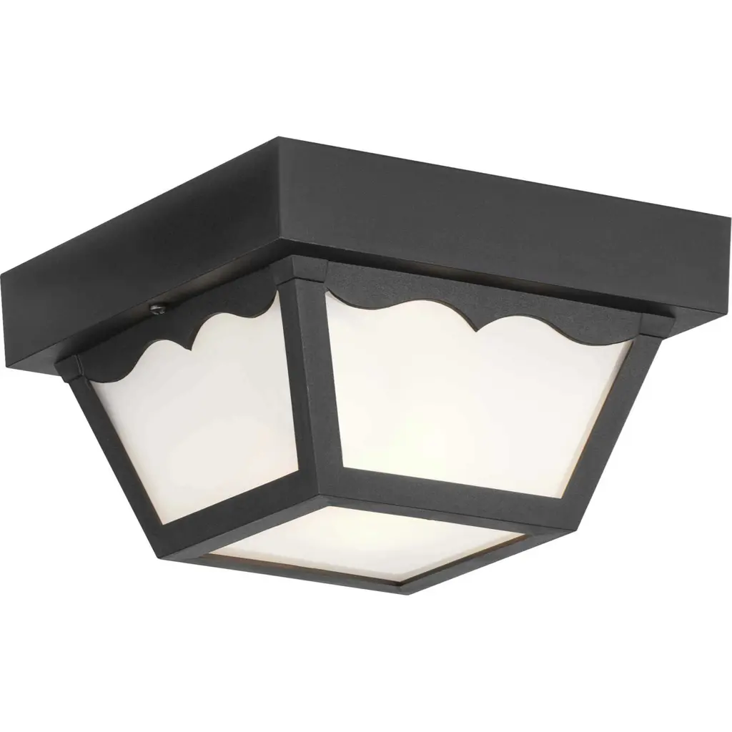 One-light non-metallic ceiling light with one-piece white acrylic diffuser and scalloped detail. Black finish.