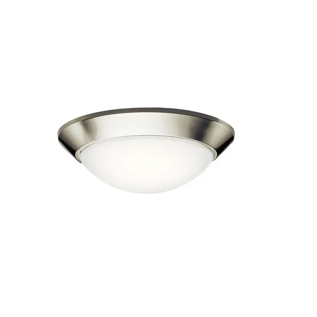 The simplicity of this flush mount fixture makes it an easy match for any decor. It features a 10in.in. diameter, Brushed Nickel finish, Satin-etched cased opal twist-on glass, and 1-light design that uses a 75-watt (max.) bulb. It is U.L. listed for damp applications.