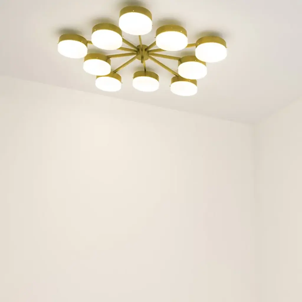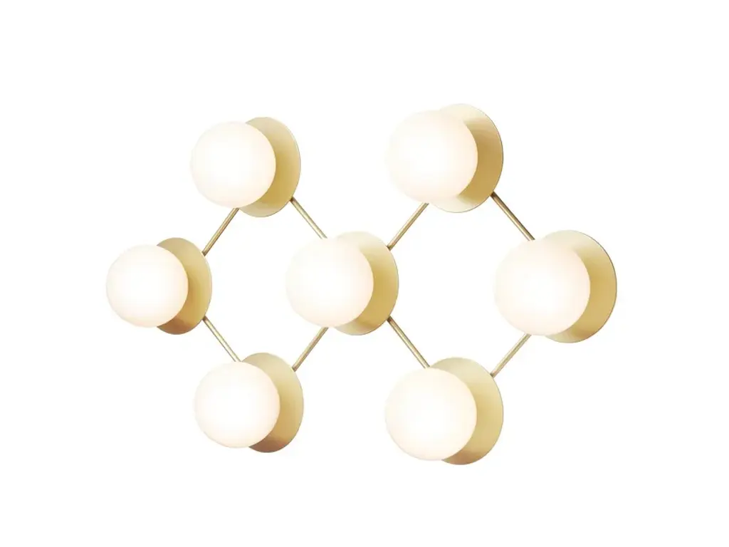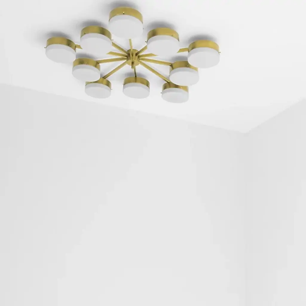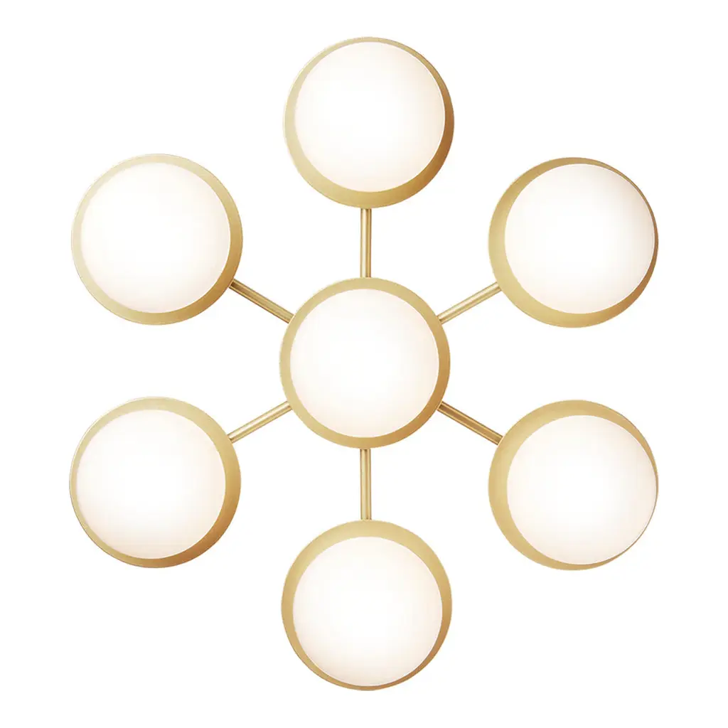 Extend expressive shapes across your walls and ceilings with the enduring Celeste Epoch Wall / Flushmount from Design For Macha. A handmade fixture anchored by a rounded central hub, it extends a sunburst of slender brass arms out to circular housings, each concealing a strong lamp and capped off by a puck-shaped shade of gorgeous opal glass. The lamps and housings are set close together, though slightly staggered for an organic presence. The translucent shades transmit a balanced composition of warmth out in all directions.