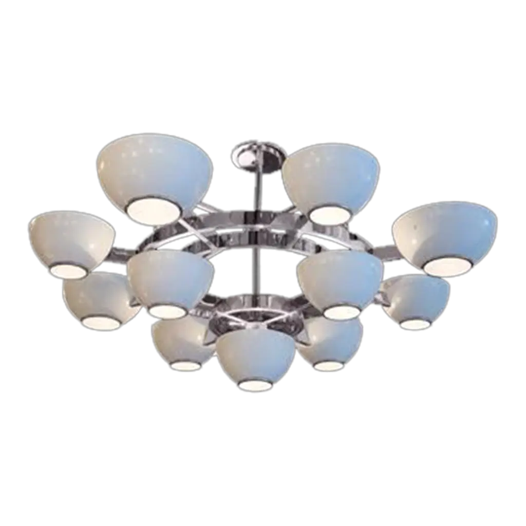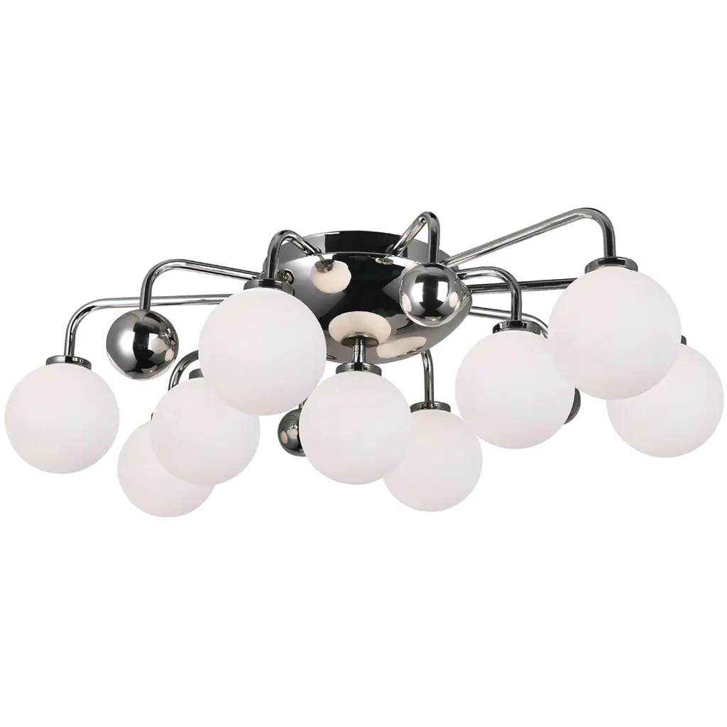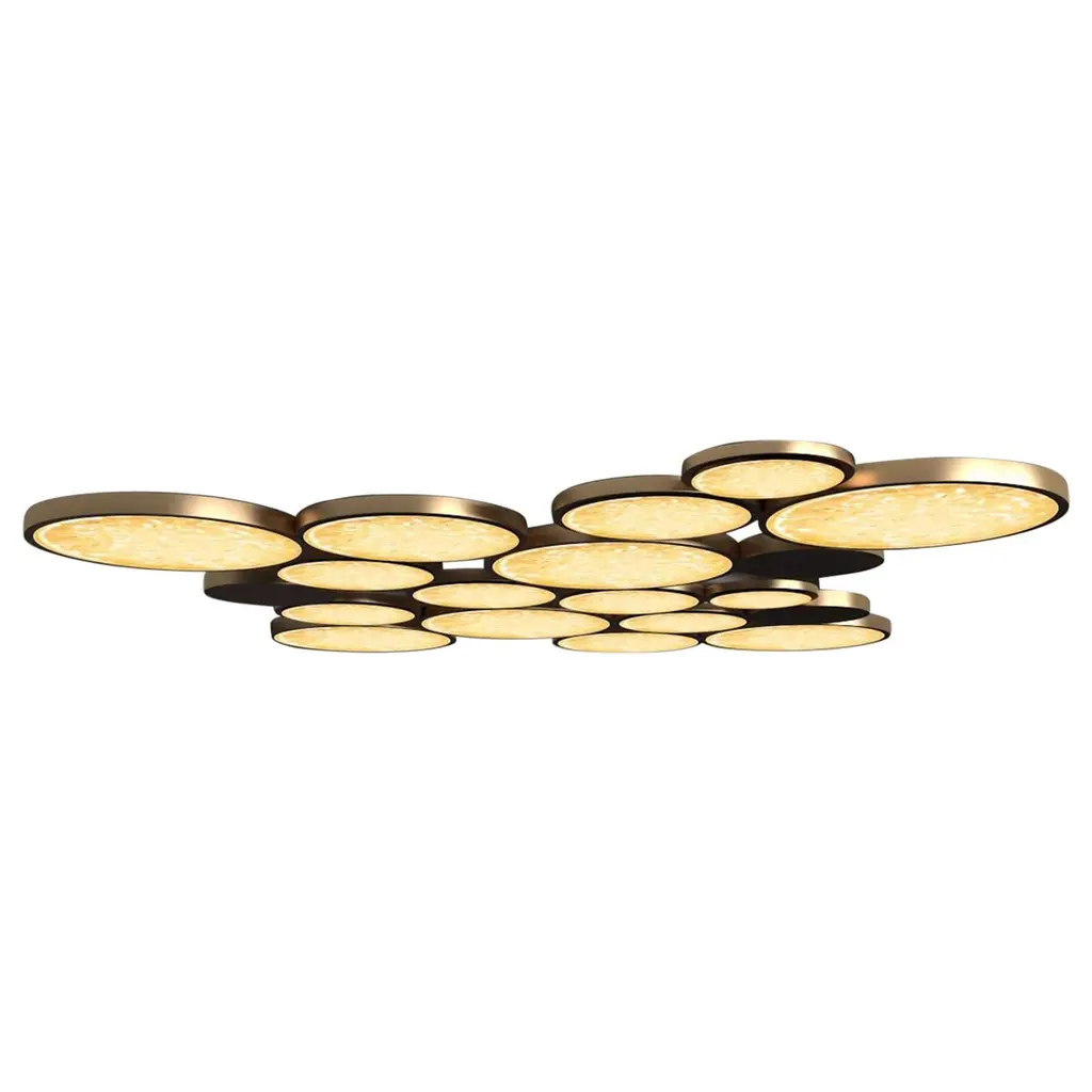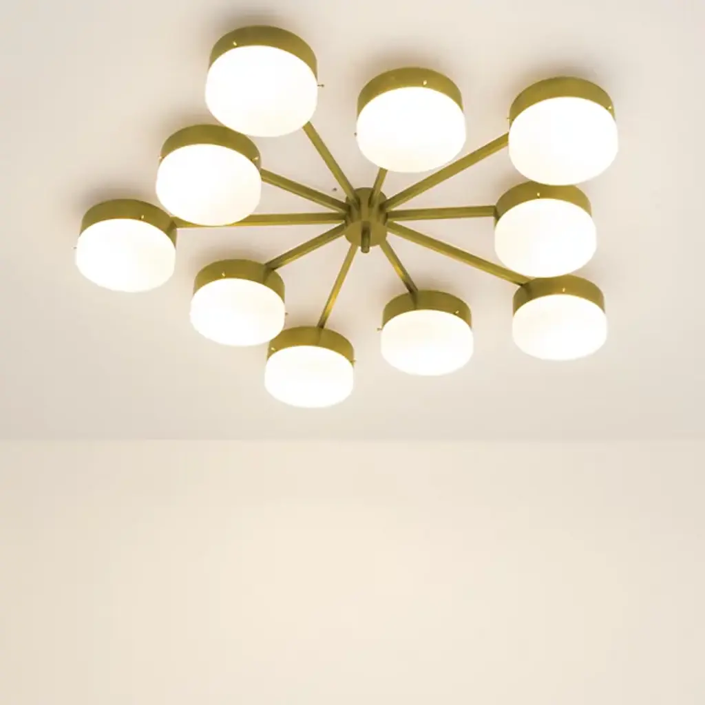Extend expressive shapes across your walls and ceilings with the enduring Celeste Epoch Wall / Flushmount from Design For Macha. A handmade fixture anchored by a rounded central hub, it extends a sunburst of slender brass arms out to circular housings, each concealing a strong lamp and capped off by a puck-shaped shade of gorgeous opal glass. The lamps and housings are set close together, though slightly staggered for an organic presence. The translucent shades transmit a balanced composition of warmth out in all directions.