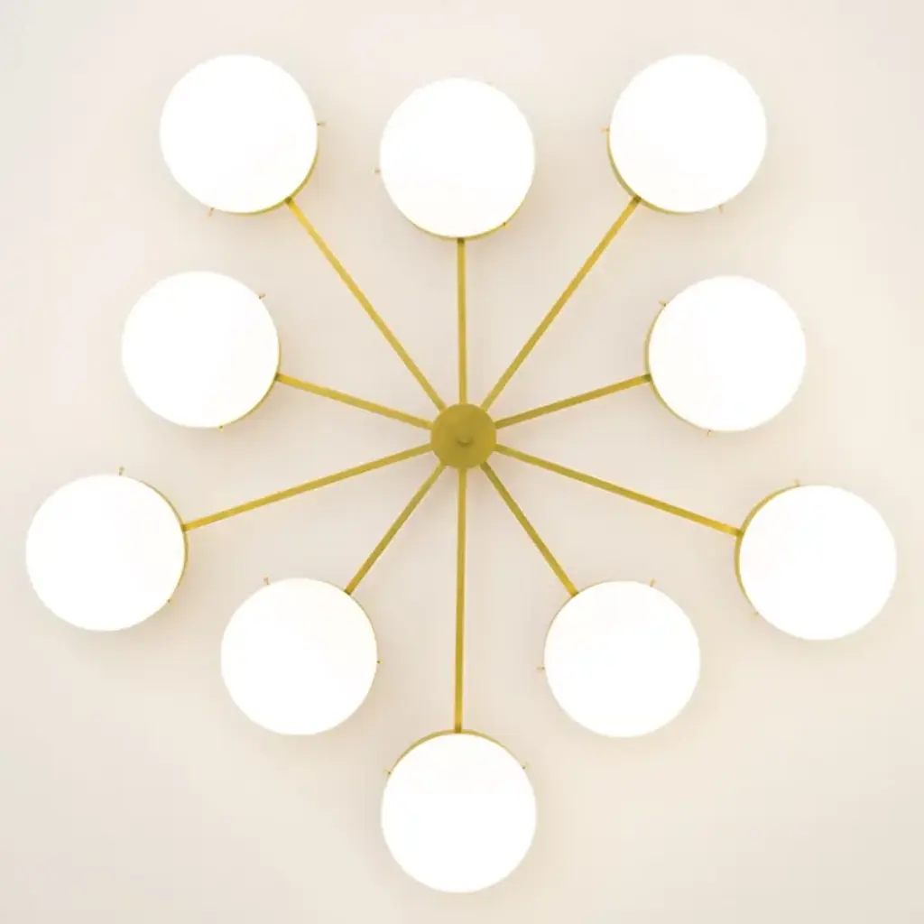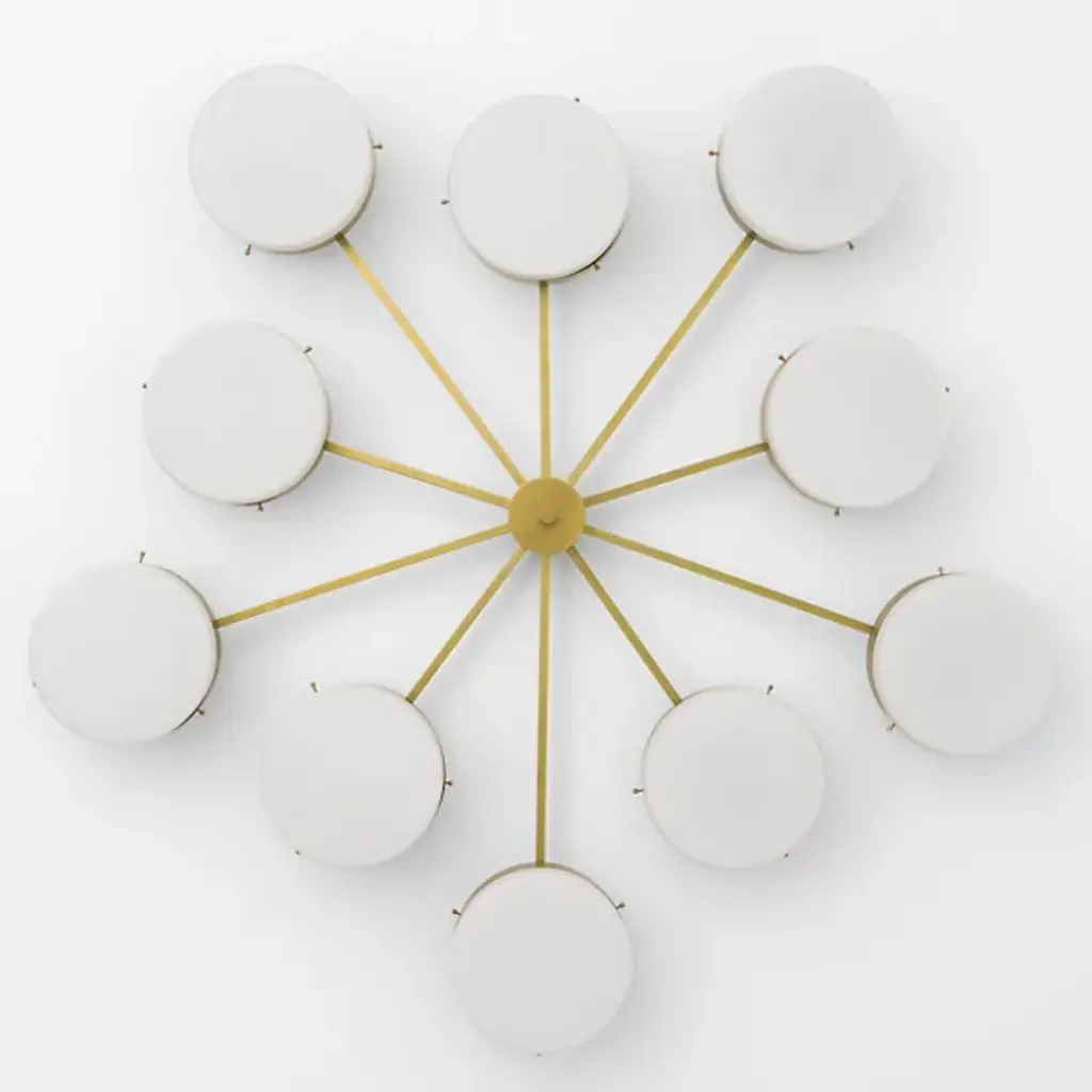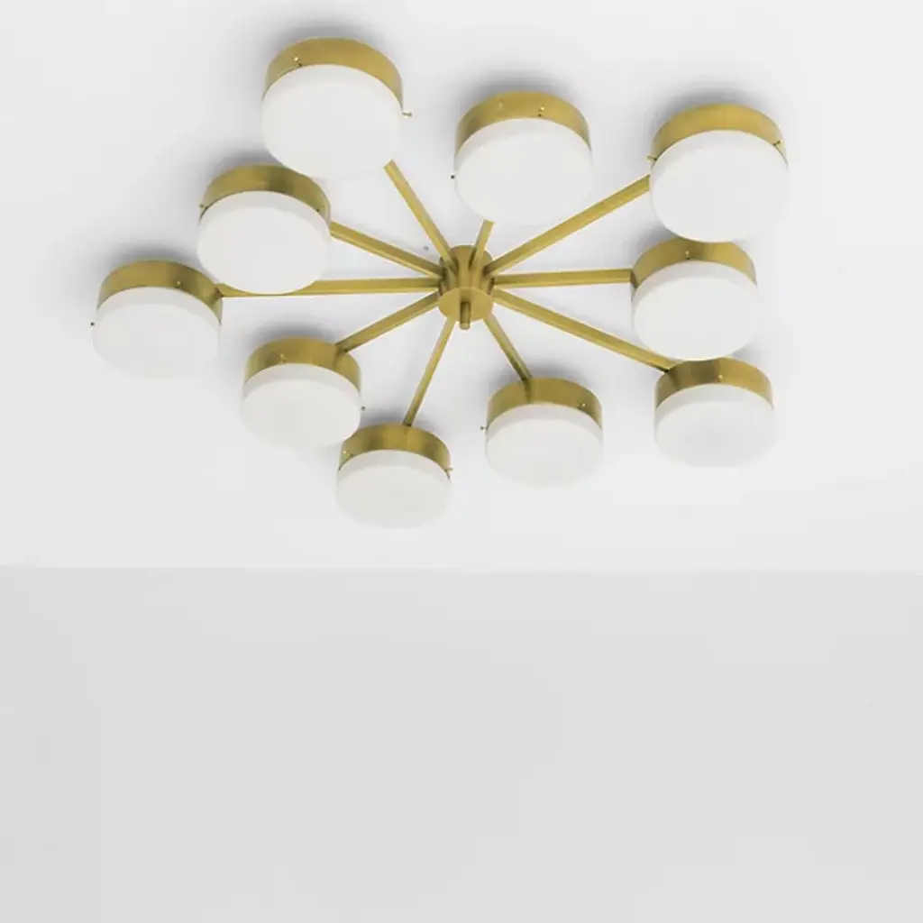Extend expressive shapes across your walls and ceilings with the enduring Celeste Epoch Wall / Flushmount from Design For Macha. A handmade fixture anchored by a rounded central hub, it extends a sunburst of slender brass arms out to circular housings, each concealing a strong lamp and capped off by a puck-shaped shade of gorgeous opal glass. The lamps and housings are set close together, though slightly staggered for an organic presence. The translucent shades transmit a balanced composition of warmth out in all directions.