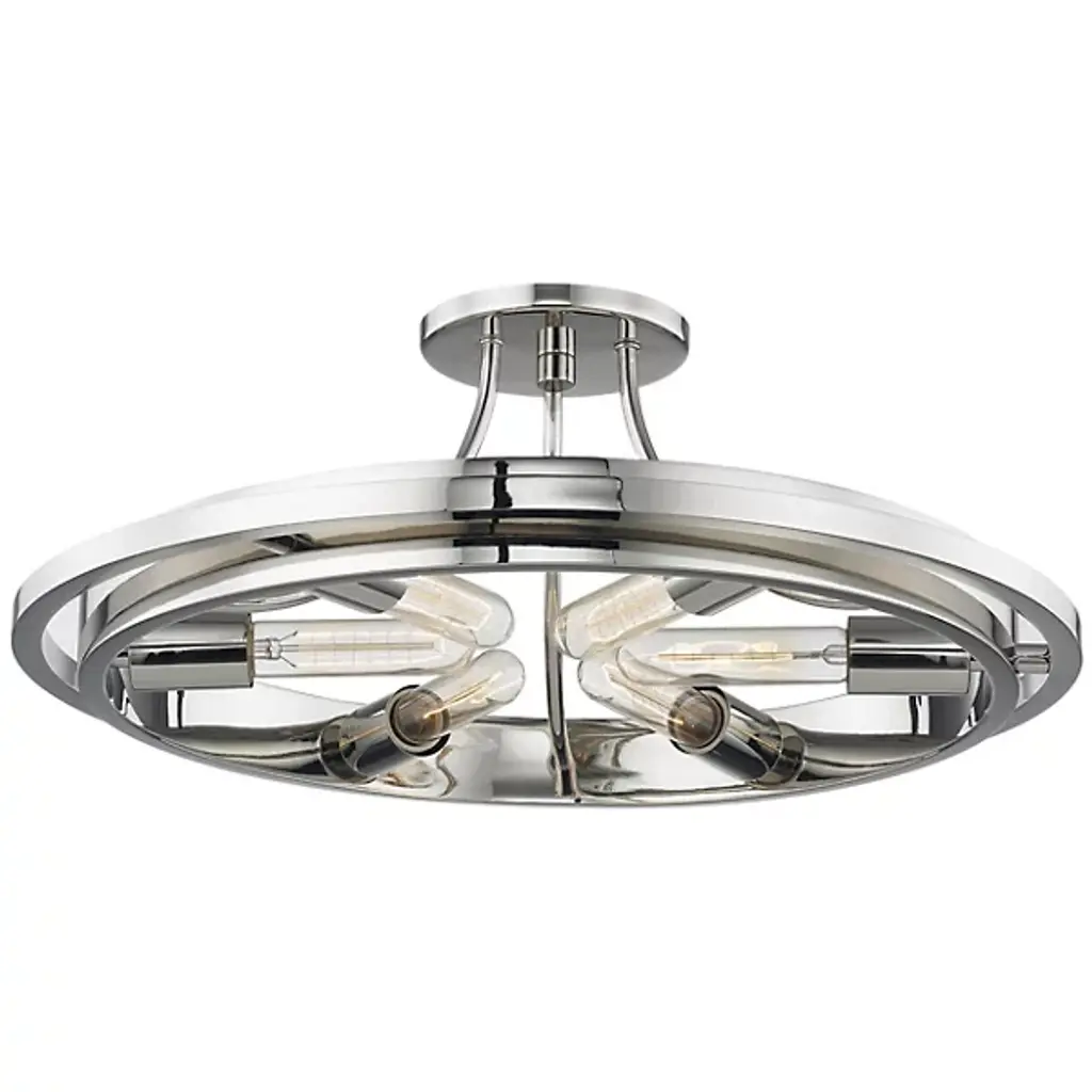 A wheel of light and decor. Unlike your traditional ceiling fixture, the Hudson Valley Chambers Flushmount doesn’t include an expansive diffuser in its design. Instead, this piece draws style from the placement of its bulbs within a circular frame. The Metal body features an interior circle which supports the bulbs and a surrounding loop that adds depth and dimension. The symmetry creates a dynamic look within a minimal structure, offering even spacing that promotes balanced downlighting and a clean design. The thin bars that support the base deliver a subtle accent, as every aspect of this light is elegant and essential. With a build that’s both intricate and subdued, this fixture brings the perfect amount of fashion and function to your overhead space.