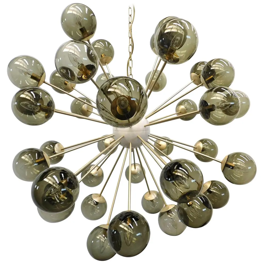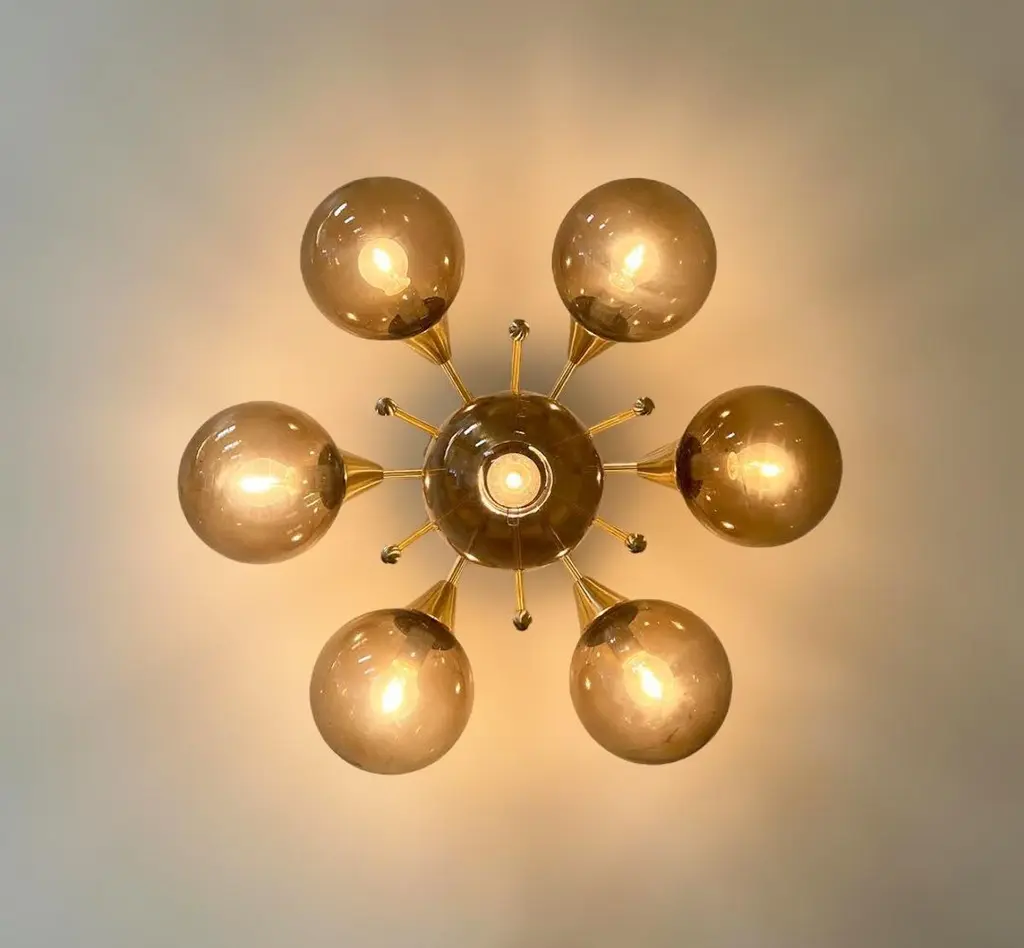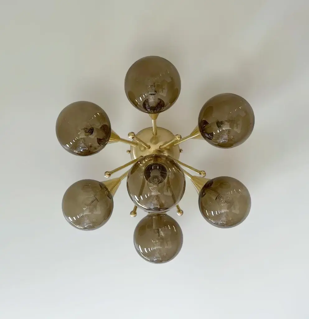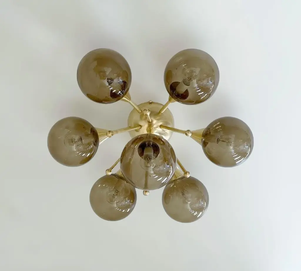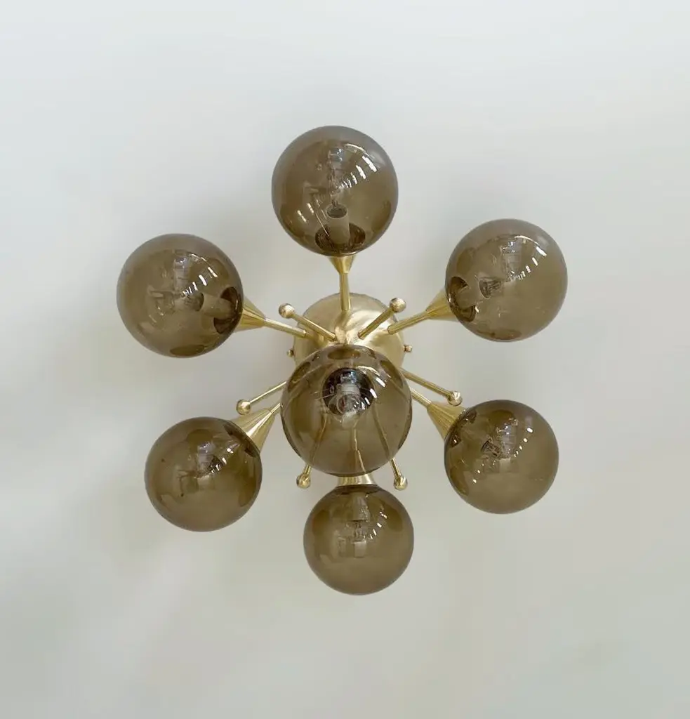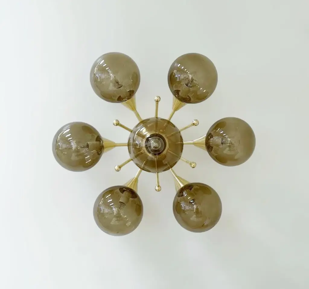 Italian flush mount with Murano glass globes mounted on solid brass frame Designed by Fabio Bergomi / Made in Italy 7 lights / E12 or E14 type / max 40W each Diameter: 25.5 inches / Height: 13 inches Order only / This item ships from Italy Order Reference #: FABIOLTD CHAMOMILEThe listed price applies to all Brass finishes : Unlacquered Natural Brass, Unlacquered Polished Brass, Lacquered Polished Brass, Lacquered Satin Brass Other finishes available with upcharge of $200: Bronzed, Polished Chrome, Satin Chrome, Polished Nickel, Satin Nickel, Polished Black Nickel, Satin Black Nickel, Polished Copper, Satin Copper