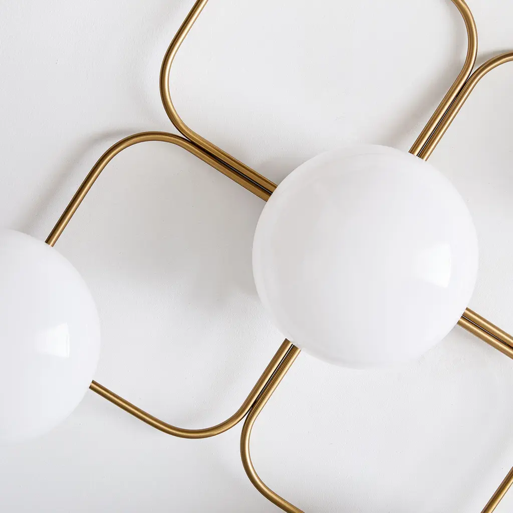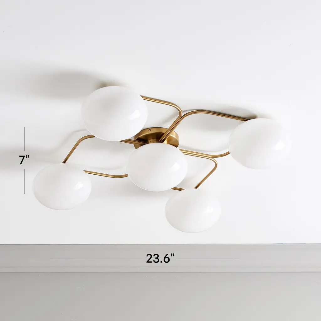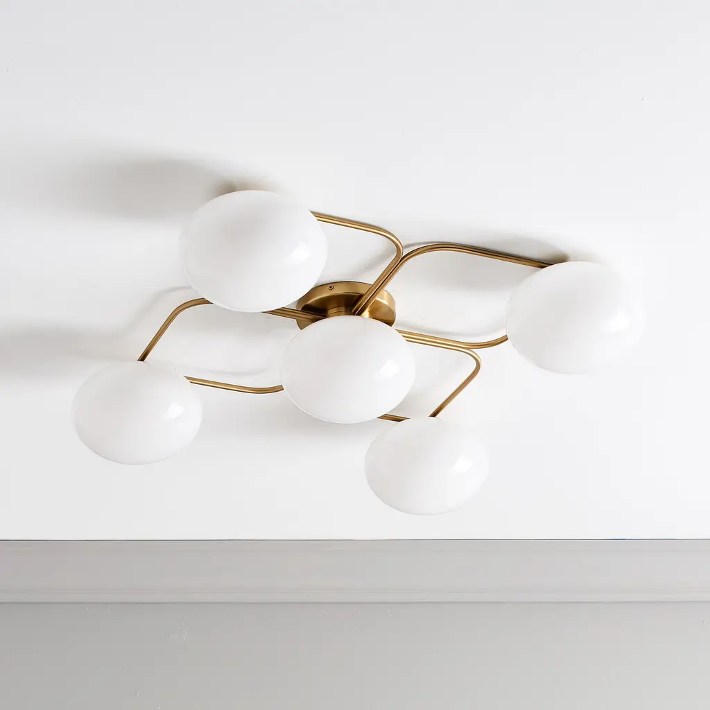 Inspired by (and named after) the shape of mushroom tops, this flush mount adds art deco-inspired flair to rooms. The flattened shape and milky coloring of its five glass shades emit a soft, calming glow in any space.