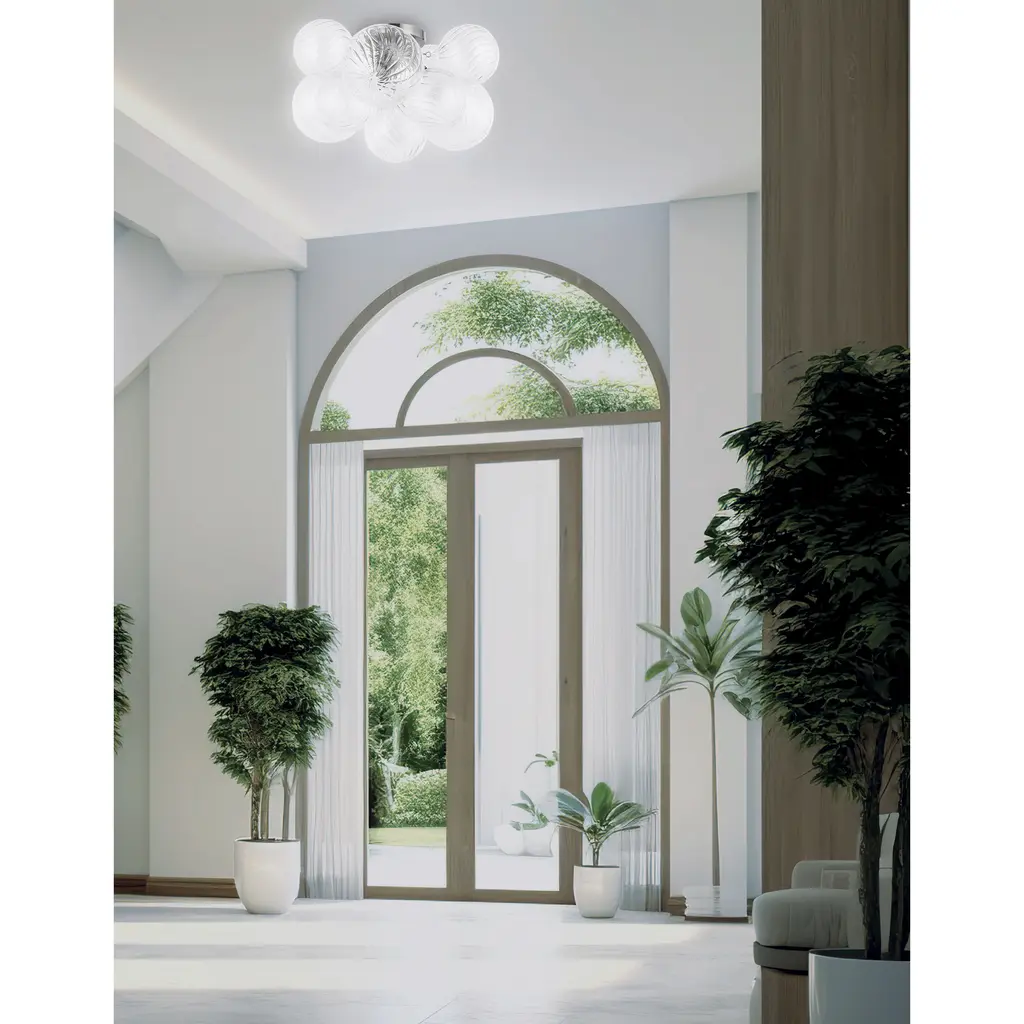 Elevate your space with the Charlize Flush Mount, a perfect infusion of contemporary style and functionality. Its globe-shaped design in intriguing clear spiral glass provides a stunning lighting effect and a captivating focal point in any room. Whether you're enhancing a bedroom or making a statement in the foyer, the Charlize Flush Mount adds visual interest to your décor and caters to your versatile lighting needs.