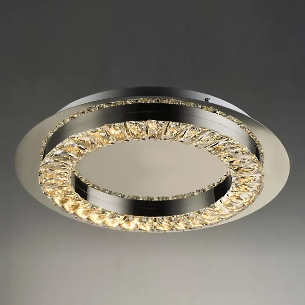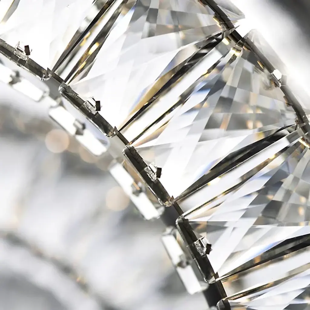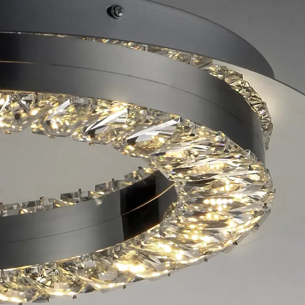 The Charm LED Flushmount from ET2 Lighting features rings of Beveled Crystals that are mounted into a Polished Chrome band and suspended from cable as if they were floating in the air. Multiple size rings mounted in descending order create a unique and brilliant light form that is sure to be the focal point of the room.