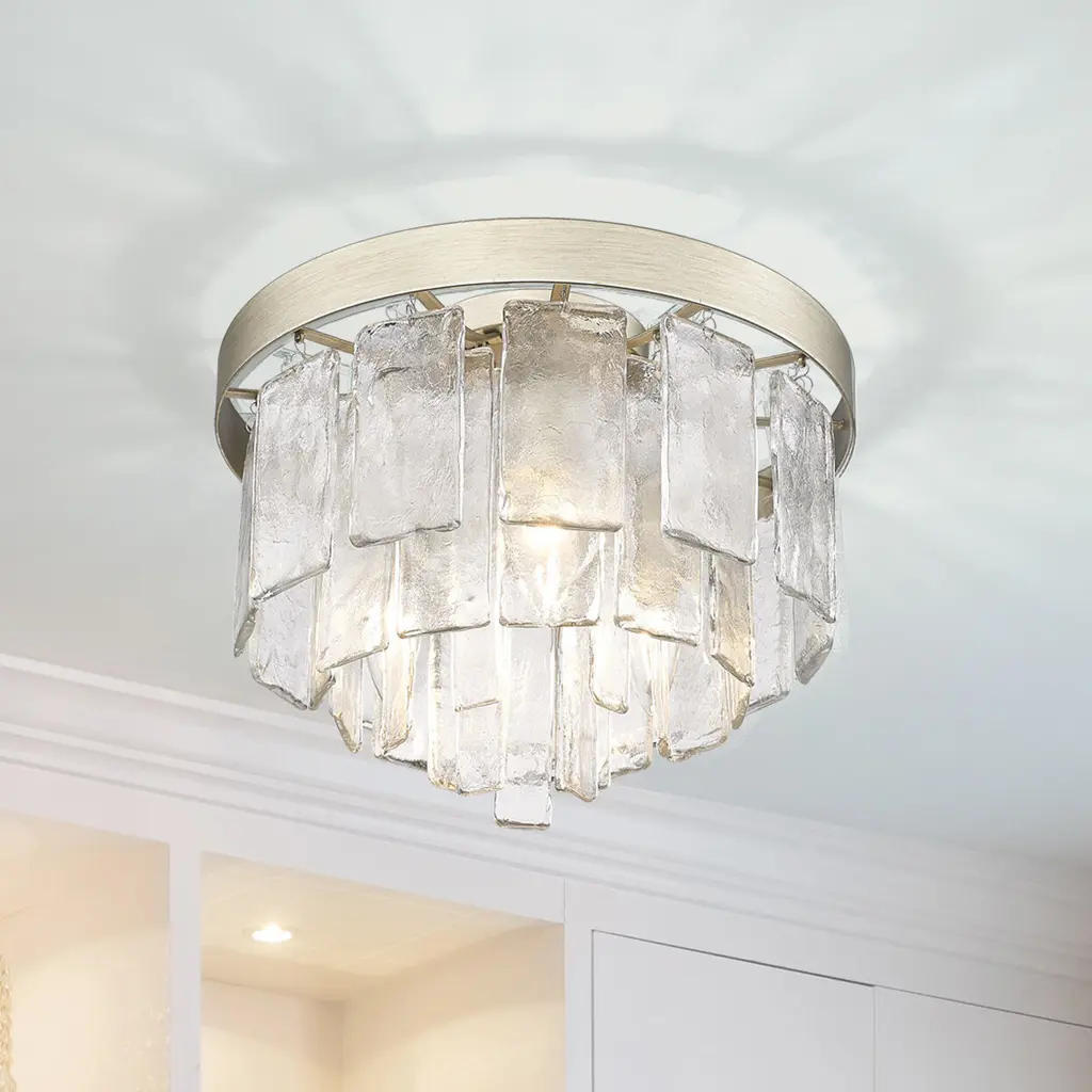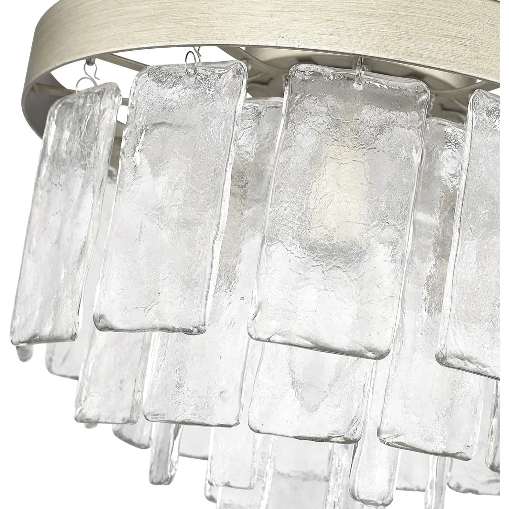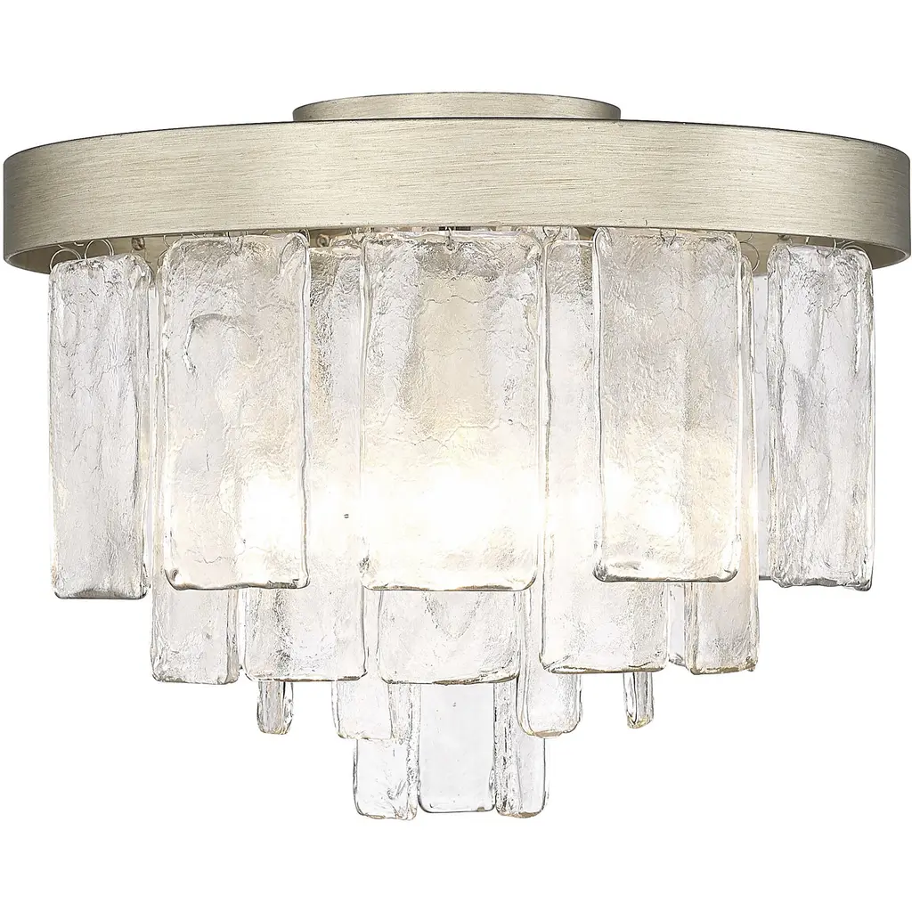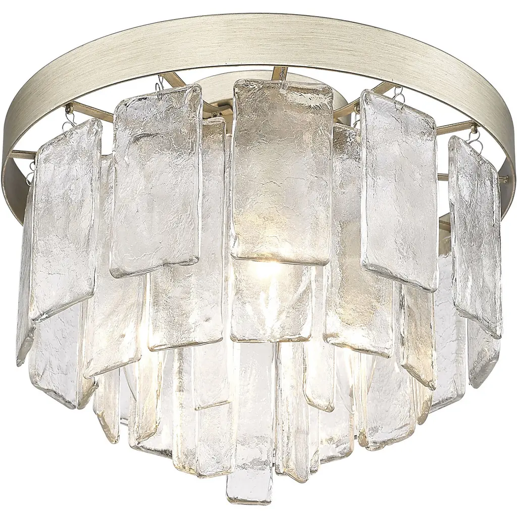 Bring artisanal elegance into your home with the Golden Lighting Ciara 3-light Flush Mount. Featuring a chic glass shade and a sophisticated White Gold frame, it creates a welcoming atmosphere. The hammered water glass shade beautifully distorts light, adding a shimmering effect to your decor. The White Gold finish blends warmth and coolness, offering a unique metallic tone that's perfect for modern and transitional environments. Ideal for low ceilings in hallways, closets, laundry areas, bathrooms, and more, this fixture is damp location rated ensuring safety in moisture-prone areas. With dimensions of 13"W x 10"H x 13"D, it requires 3 E12 candelabra base bulbs (not included), max 60 wattage each. This stylish flush mount provides an elegant touch alongside its exceptional quality.