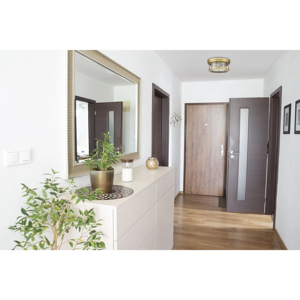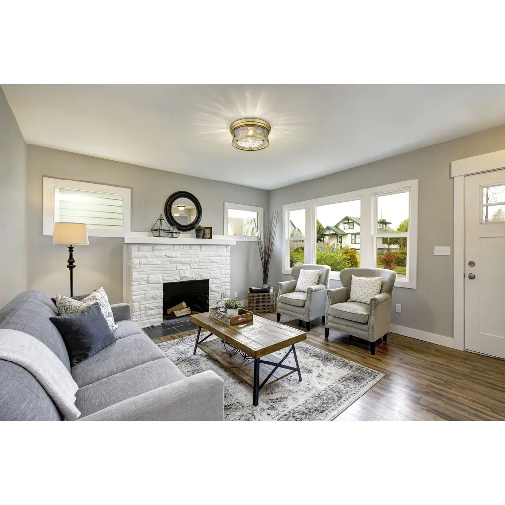 Both contemporary and classic in design, this two-light flush mount light with a clear water glass shade is a lovely lighting solution for your entryway or bedroom. A round silhouette in a polished nickel steel frame provides a clean design that blends with your existing decor.
