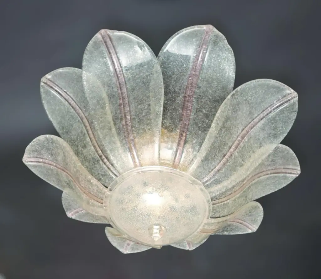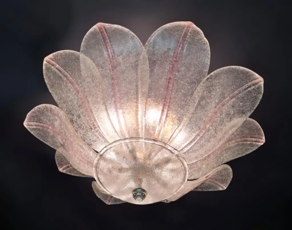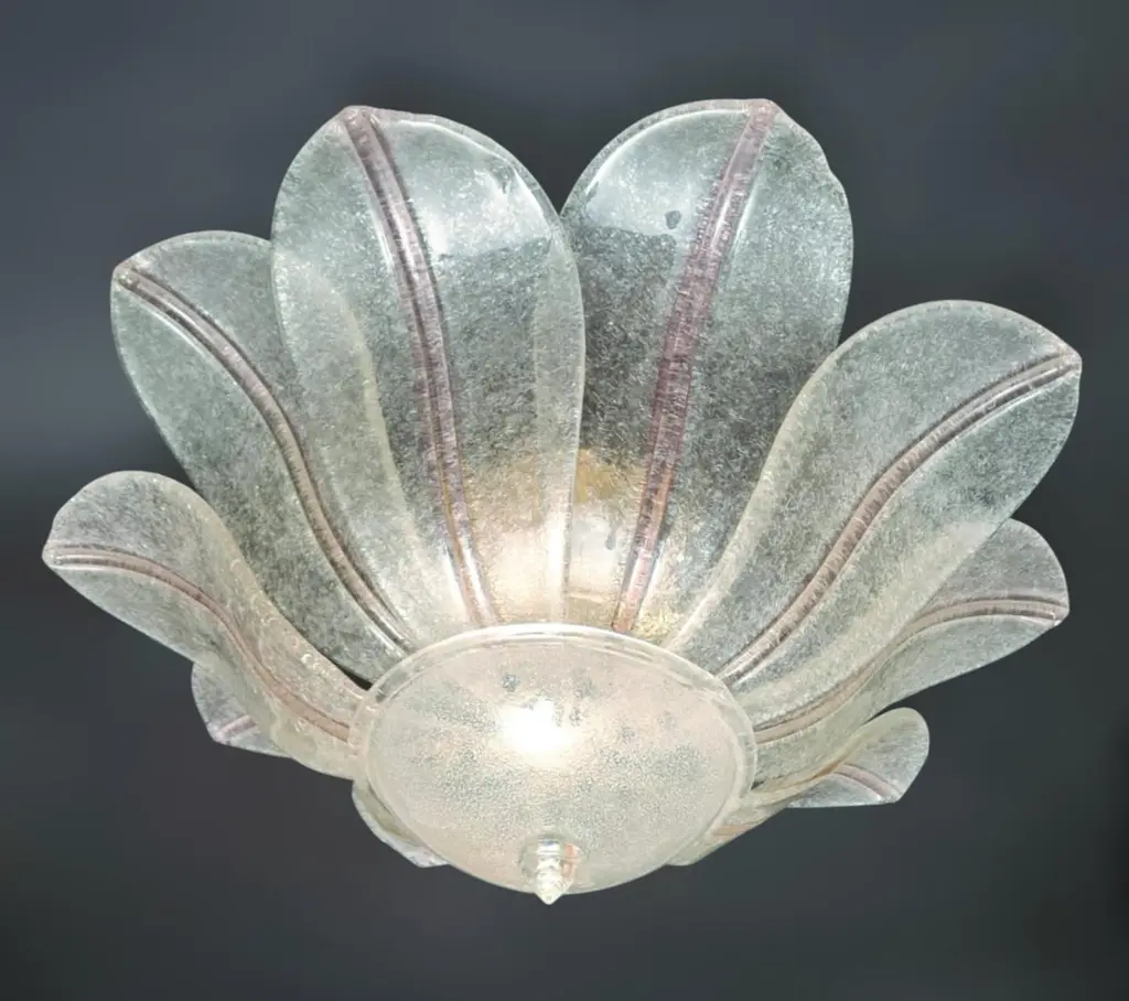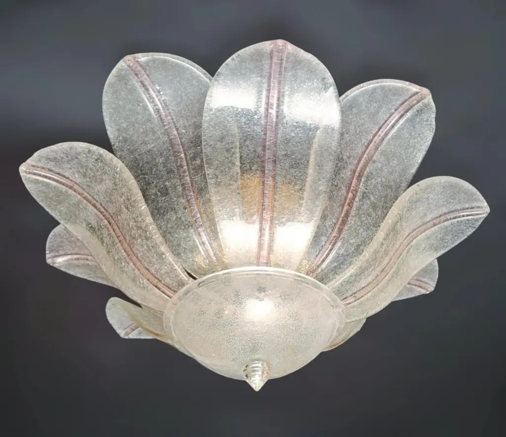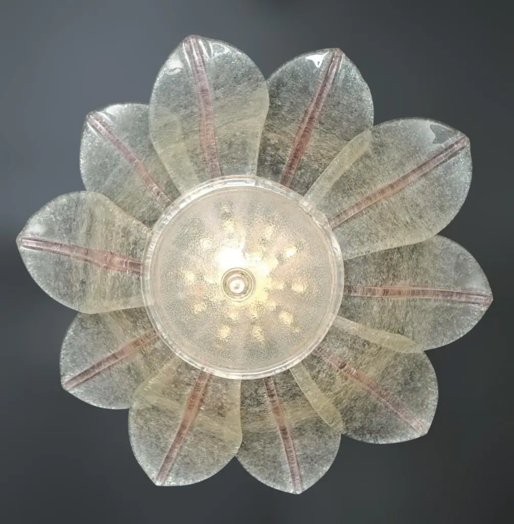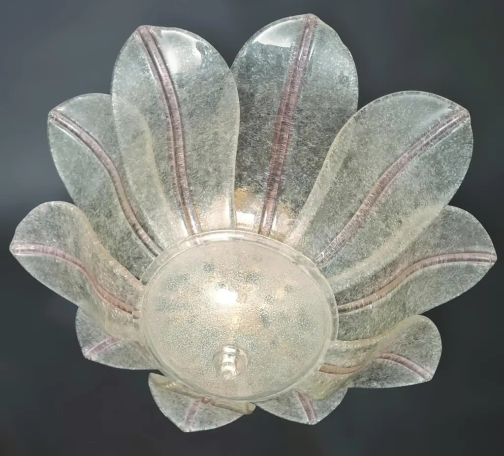 Vintage Italian Murano glass flush mount with clear graniglia glass leaves decorated with a pink line in the center on each leaf / Made in Italy in the style of Barovier e Toso, circa 1960sMeasures: Diameter 31.5 inches, height 14 inches6 lights / E26 or E27 type / max 60W each6 available in stock in Italy, price listed is for each itemOrder reference #: FABIOLTD L1