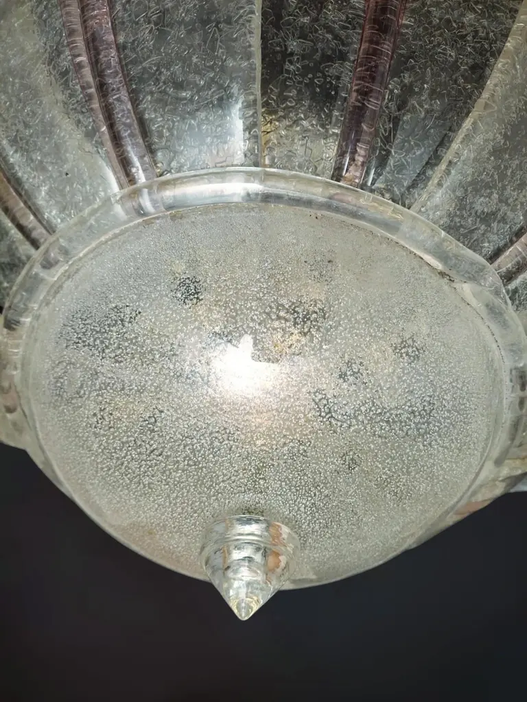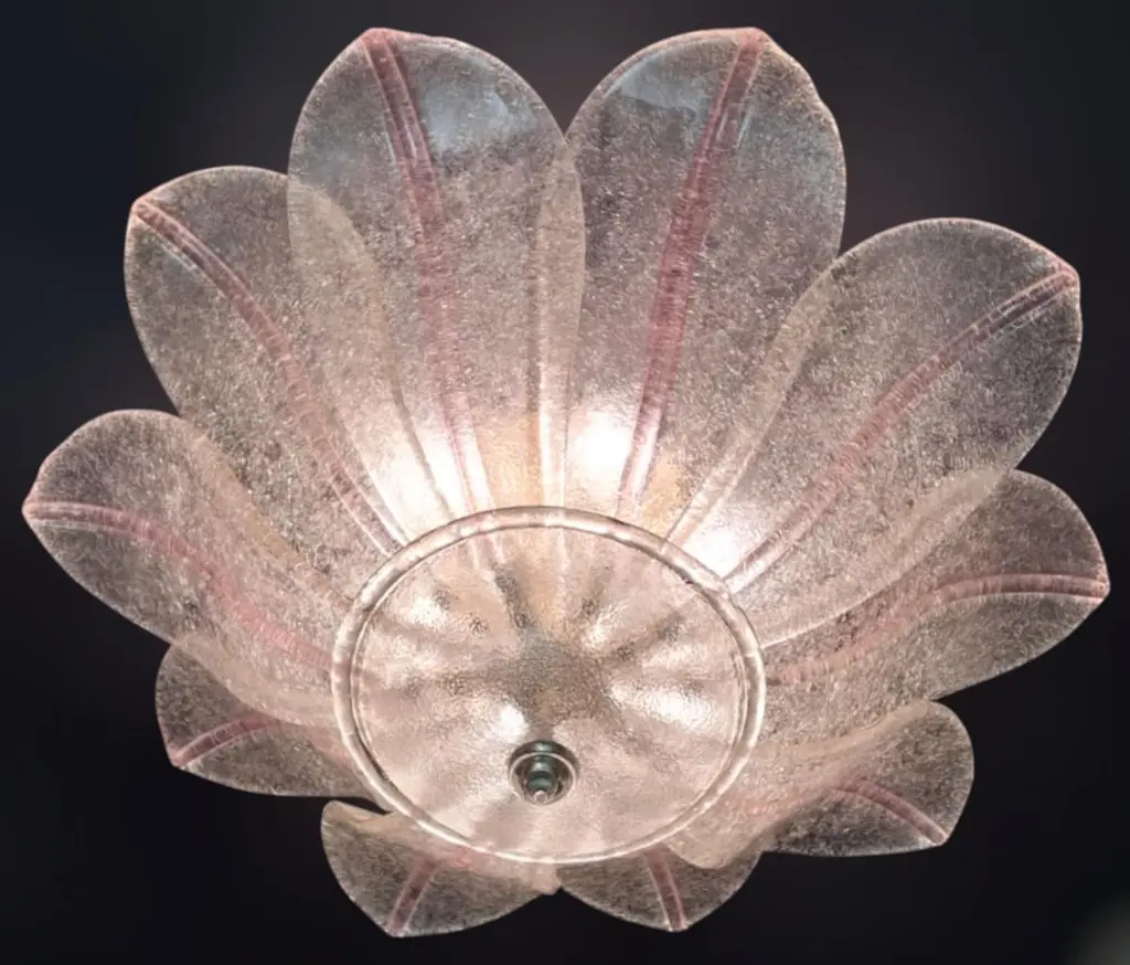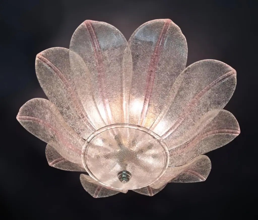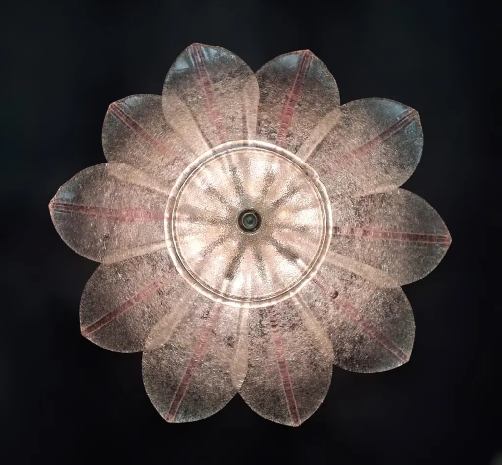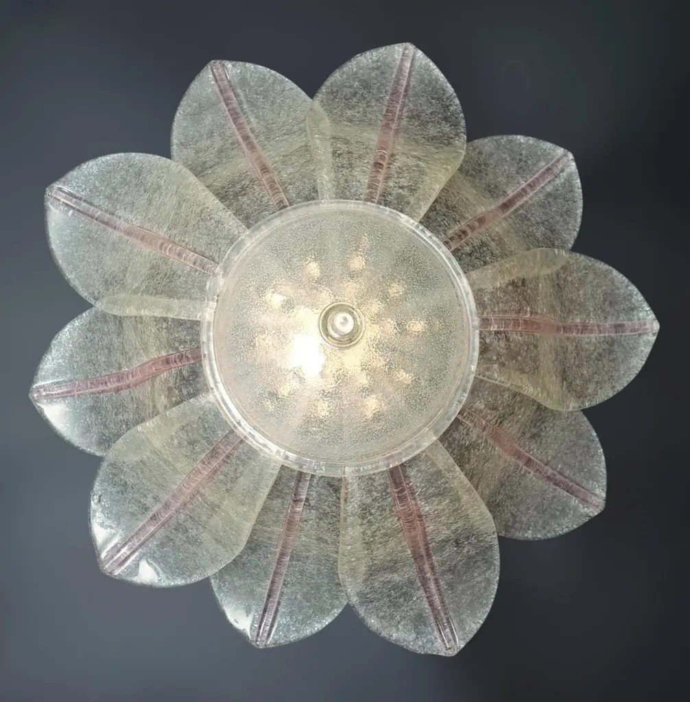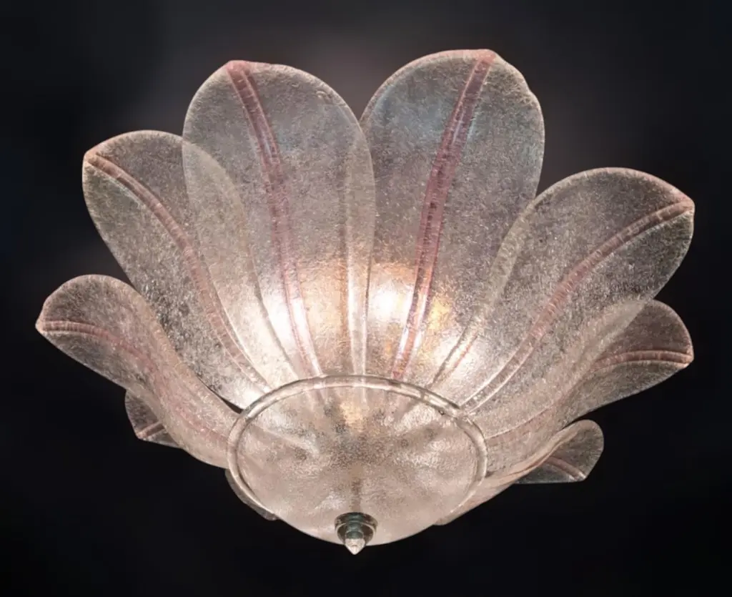 Vintage Italian Murano glass flush mount with clear graniglia glass leaves decorated with a pink line in the center on each leaf / Made in Italy in the style of Barovier e Toso, circa 1960sMeasures: Diameter 31.5 inches, height 14 inches6 lights / E26 or E27 type / max 60W each6 available in stock in Italy, price listed is for each itemOrder reference #: FABIOLTD L1