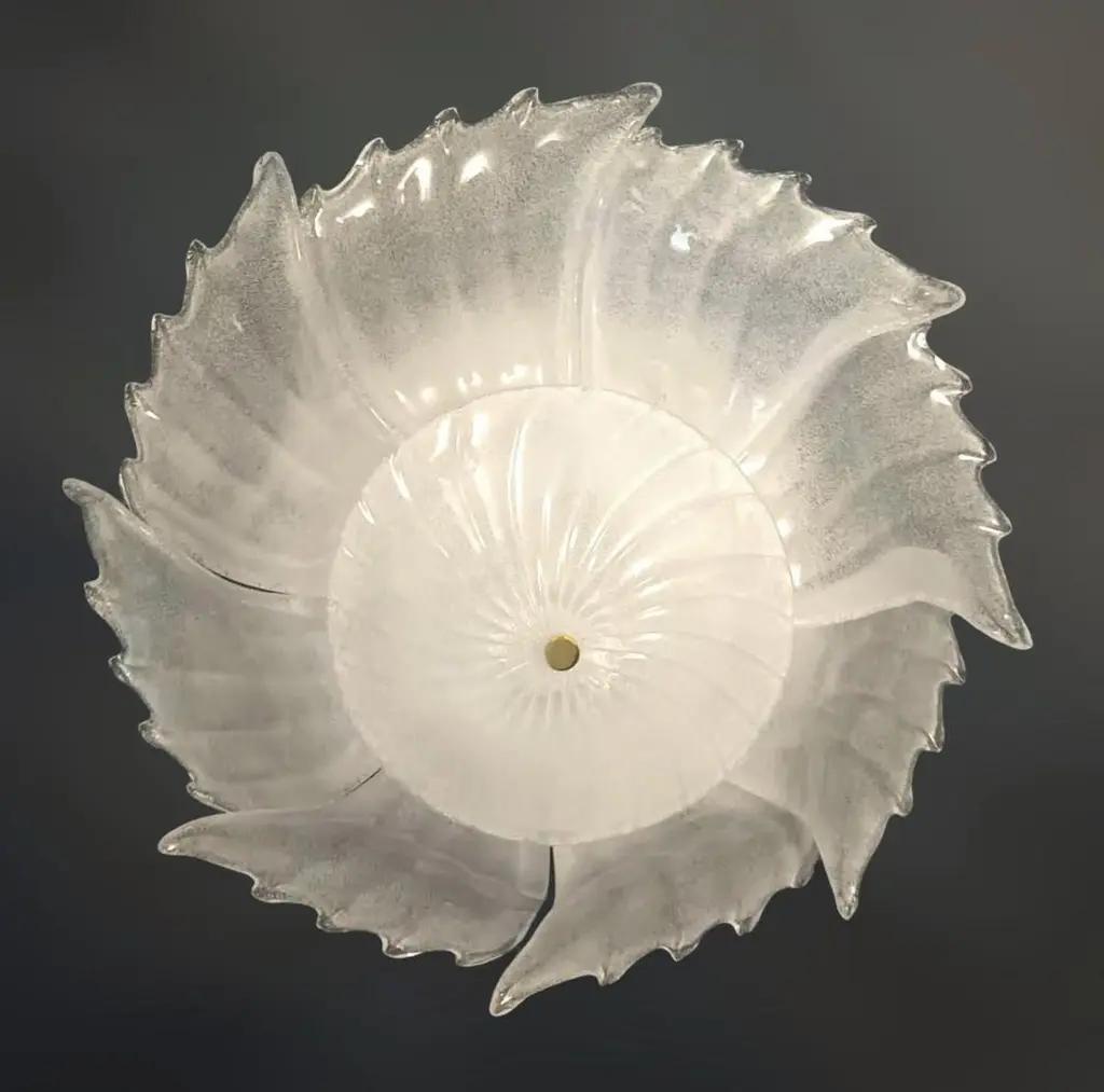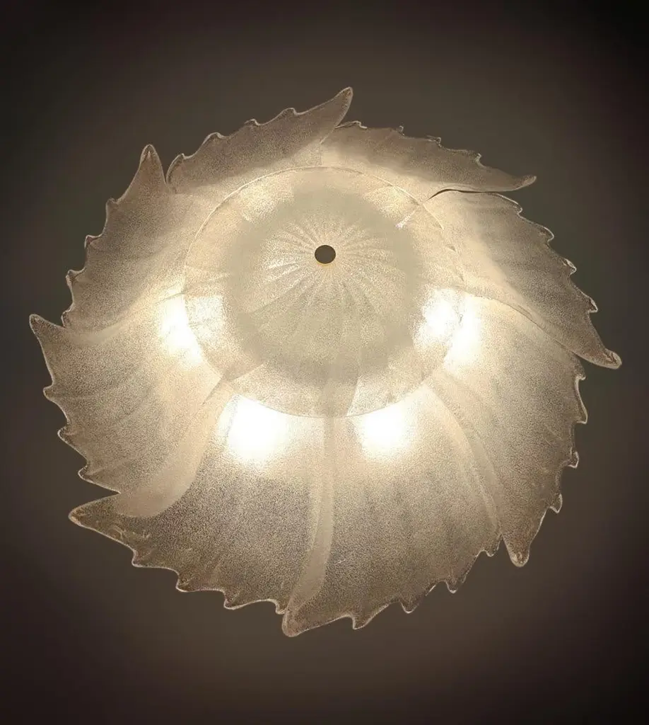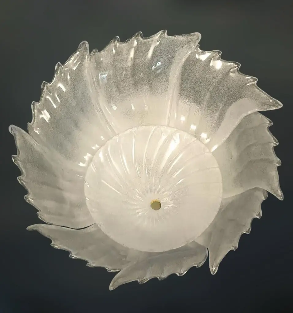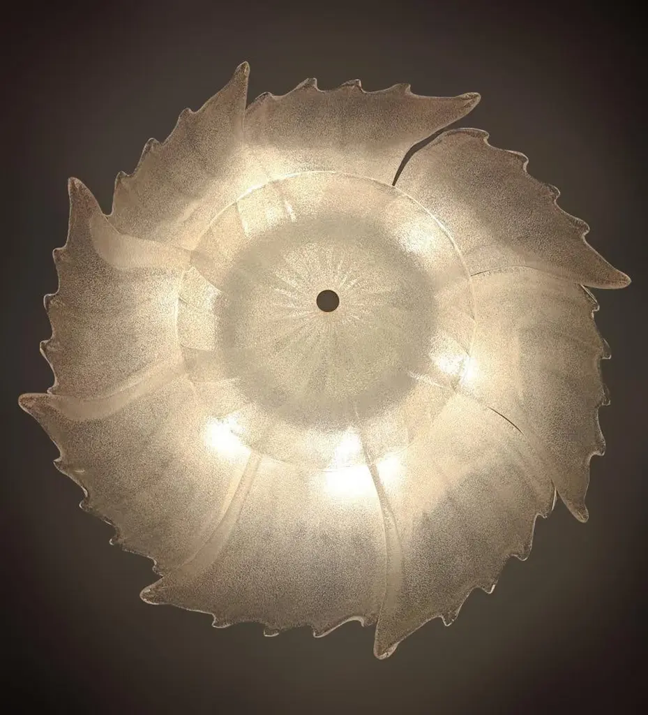 Vintage Italian "Dogaressa" model Murano glass flush mount with clear graniglia glass leaves mounted on white metal frame / Made in Italy by Aureliano Toso, circa 1950sOriginal stickers on the glass and the frameMeasures: Diameter 31.5 inches, height 9.5 inches6 lights are E26 or E27 type max 60W each / 3 lights are E12 or E14 type max 40W each2 available in stock in Italy, price listed is for each itemOrder reference #: FABIOLTD K55