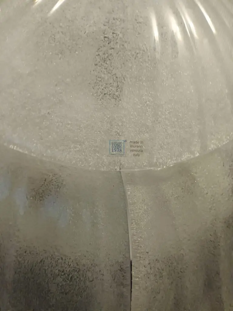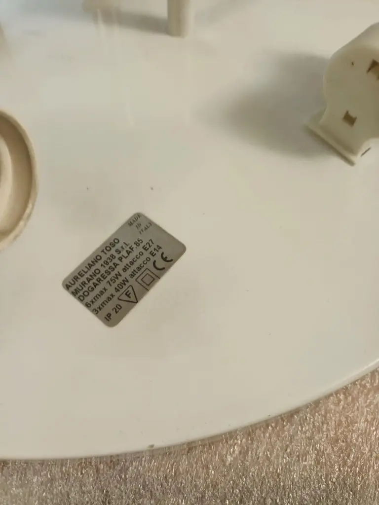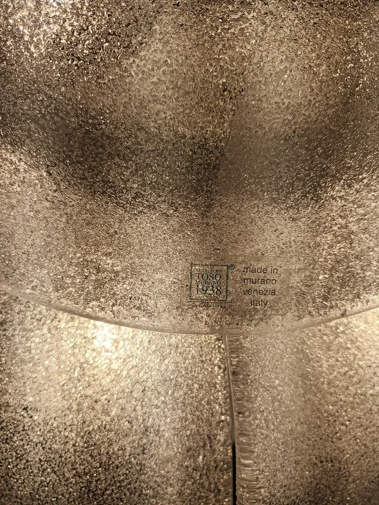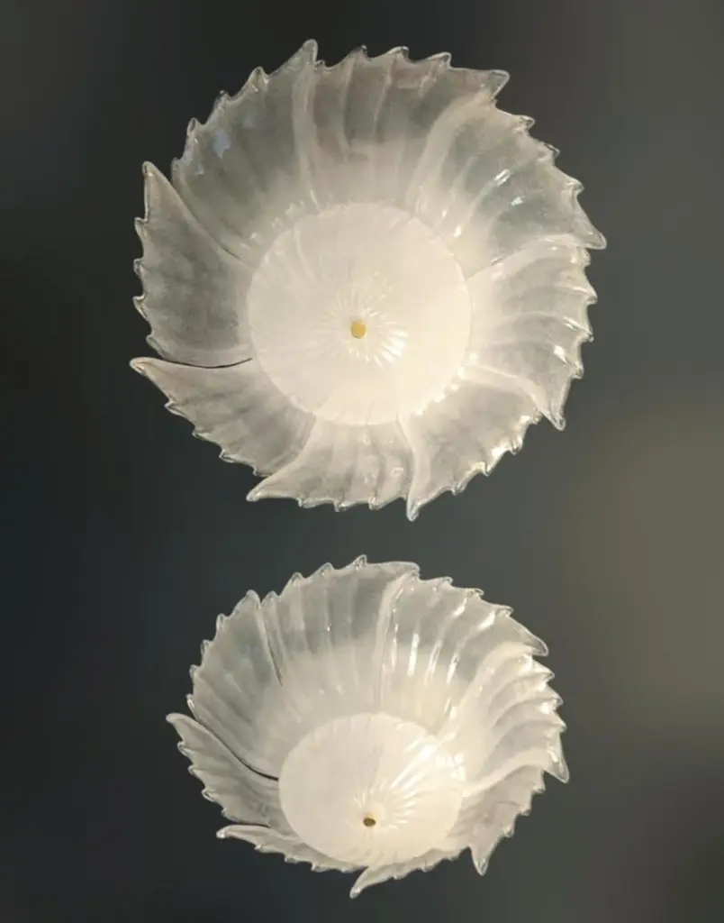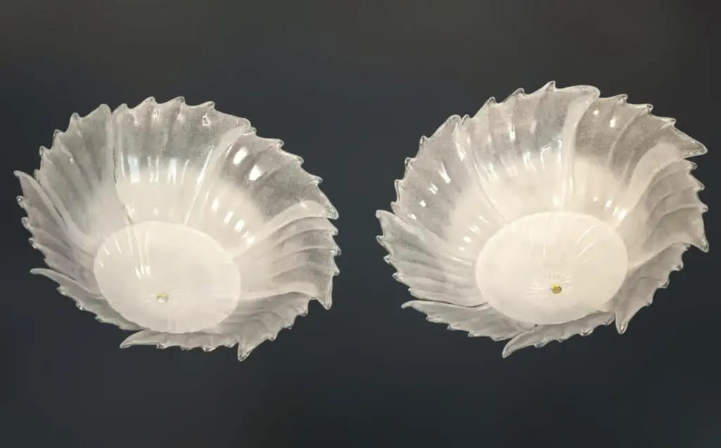 Vintage Italian "Dogaressa" model Murano glass flush mount with clear graniglia glass leaves mounted on white metal frame / Made in Italy by Aureliano Toso, circa 1950sOriginal stickers on the glass and the frameMeasures: Diameter 31.5 inches, height 9.5 inches6 lights are E26 or E27 type max 60W each / 3 lights are E12 or E14 type max 40W each2 available in stock in Italy, price listed is for each itemOrder reference #: FABIOLTD K55