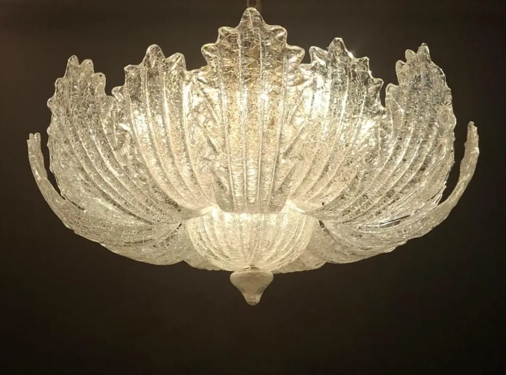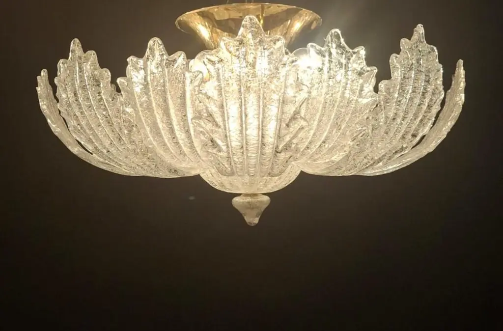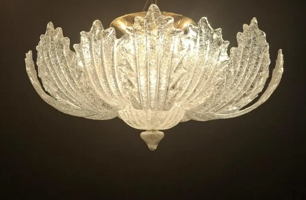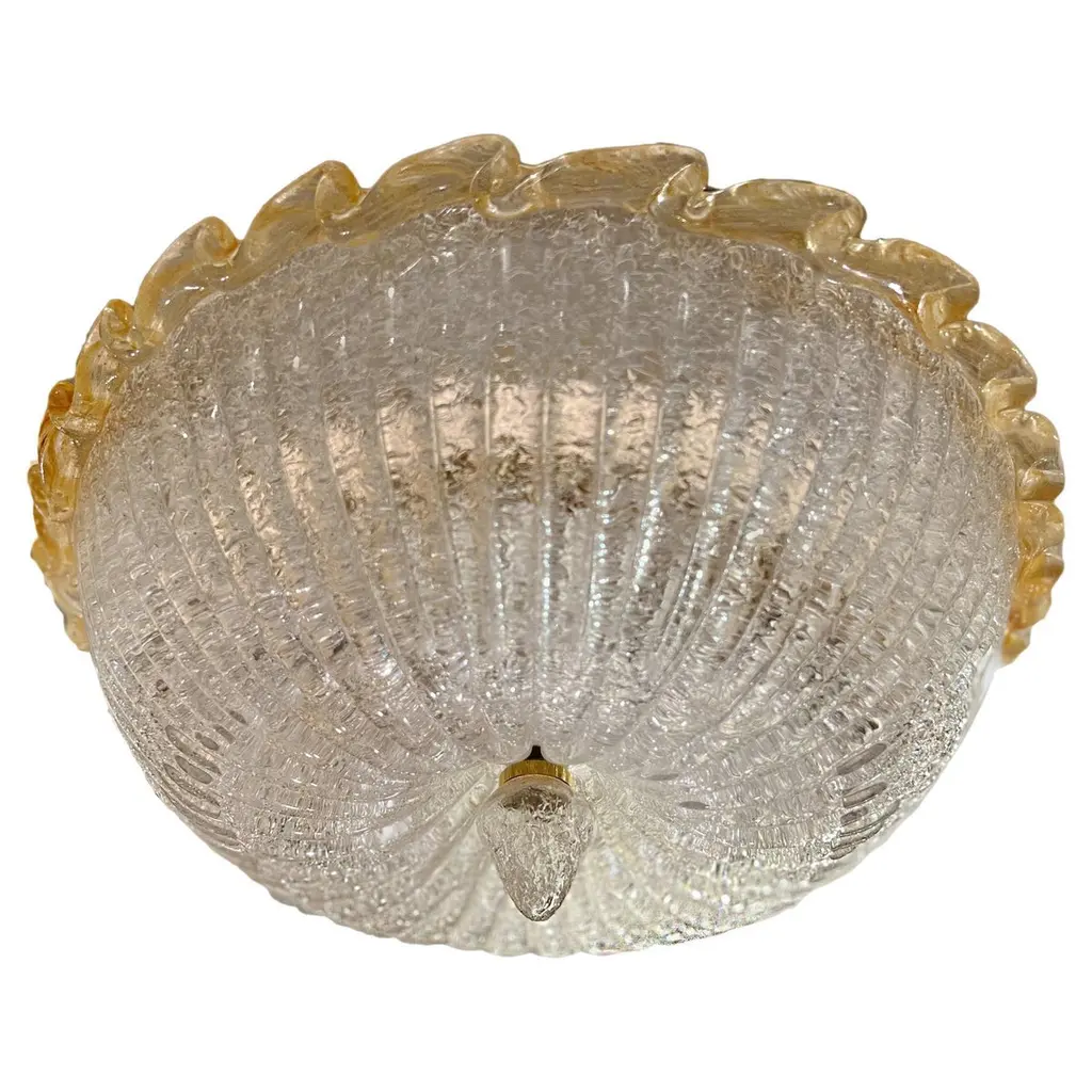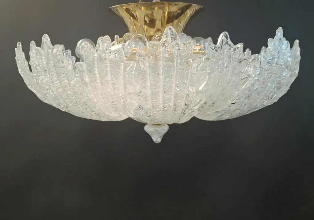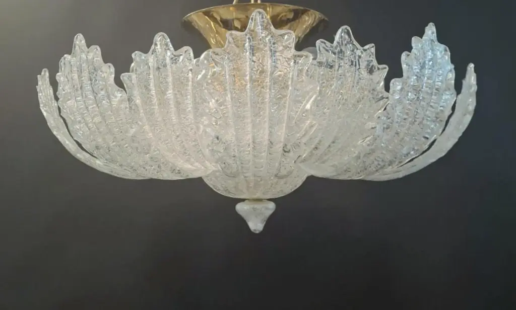 Vintage Italian Murano glass flush mount with clear graniglia glass leaves mounted on gold metal frame / Made in Italy in the style of Barovier e Toso, circa 1960s11 lights / E12 or E14 type / max 40W eachMeasures: Diameter 25.5 inches, height 14 inches2 available in stock in Italy, price listed is for each itemOrder reference #: FABIOLTD K121