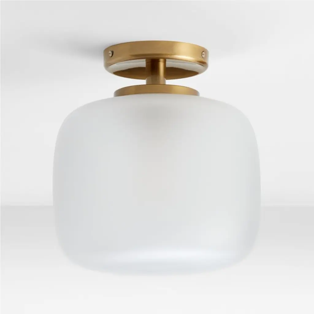 Our Colombe flush mount light glows softly overhead in hallways, bathrooms and walk-in closets. Frosted glass curves the organic cylinder shade, complementing the fixture's warm burnished brass finish. The subtly concave canopy completes our exclusive ceiling light with a final touch of softness.