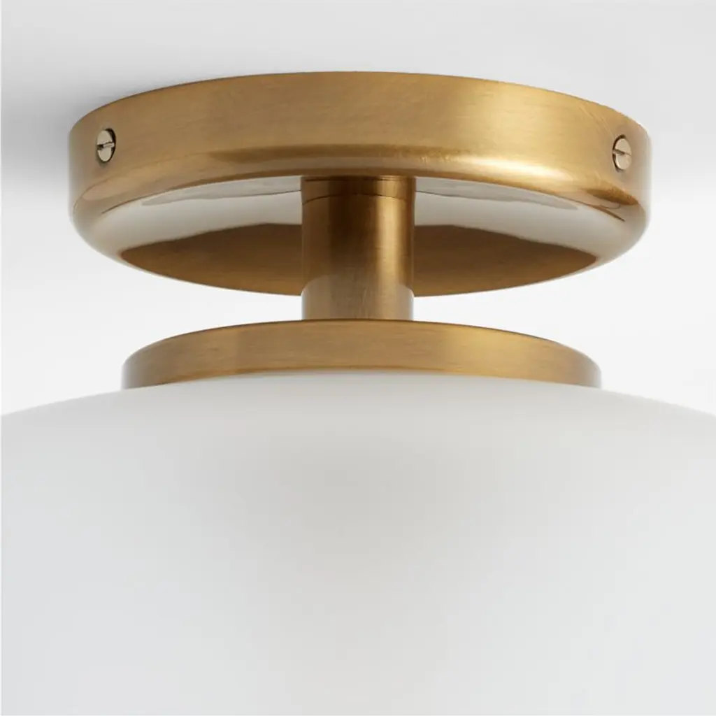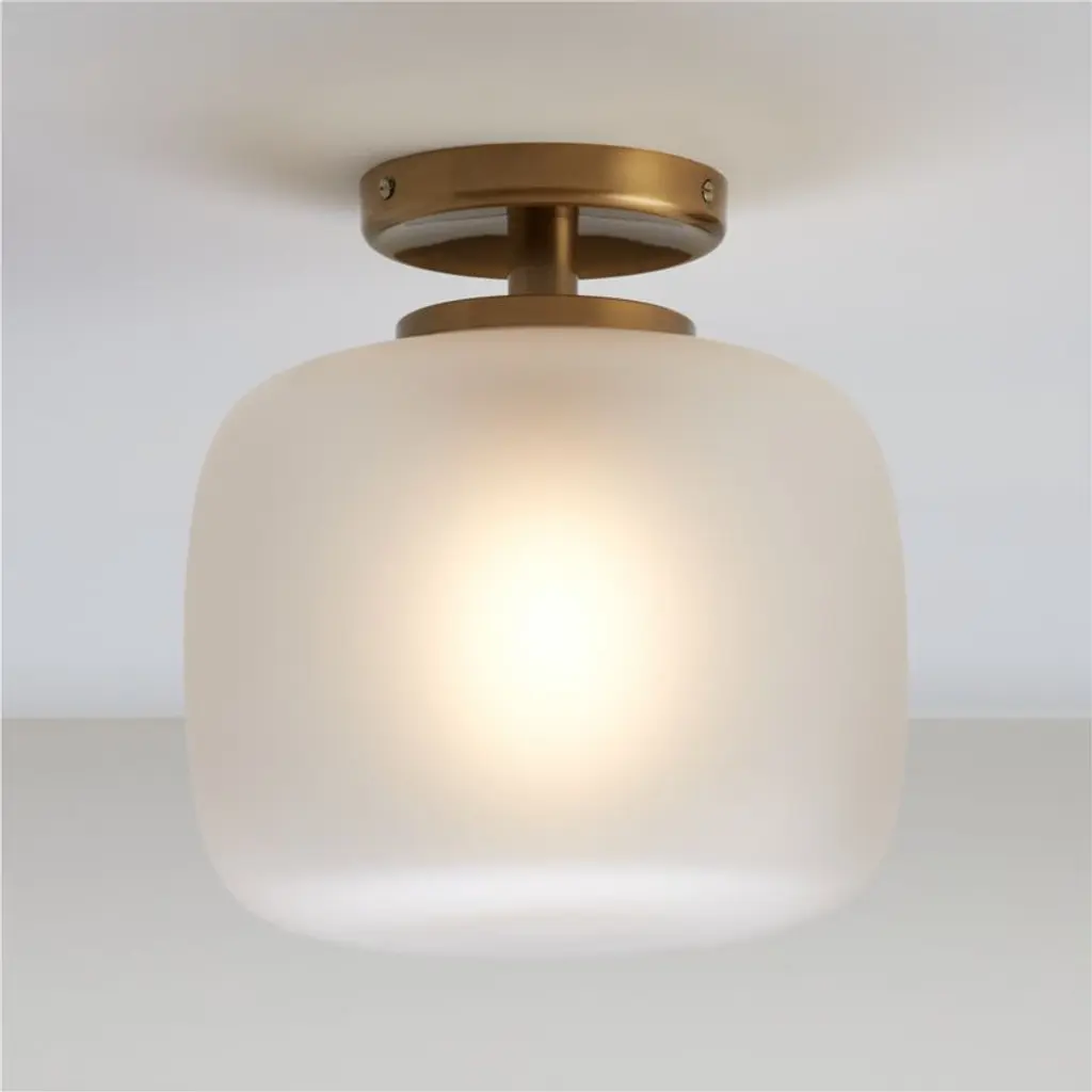 Our Colombe flush mount light glows softly overhead in hallways, bathrooms and walk-in closets. Frosted glass curves the organic cylinder shade, complementing the fixture's warm burnished brass finish. The subtly concave canopy completes our exclusive ceiling light with a final touch of softness.