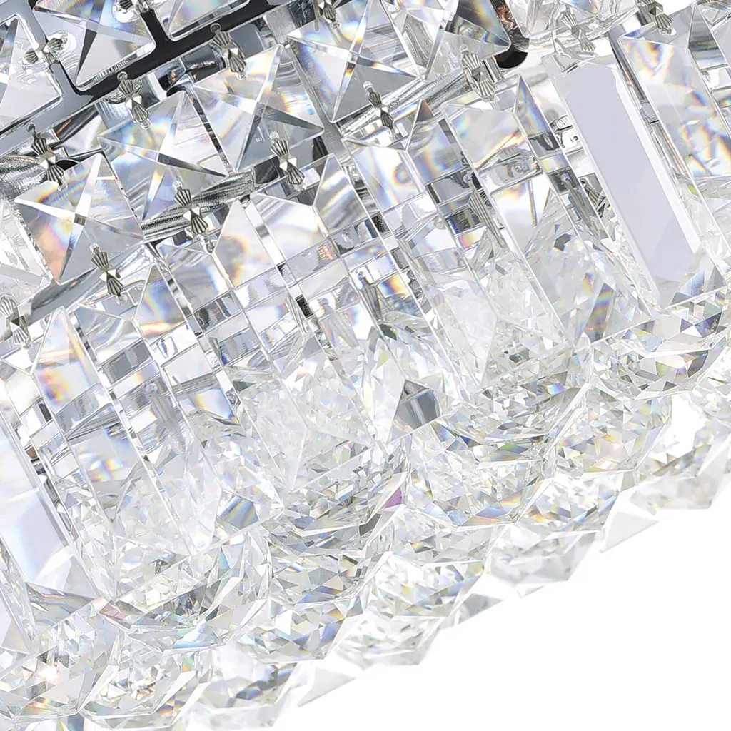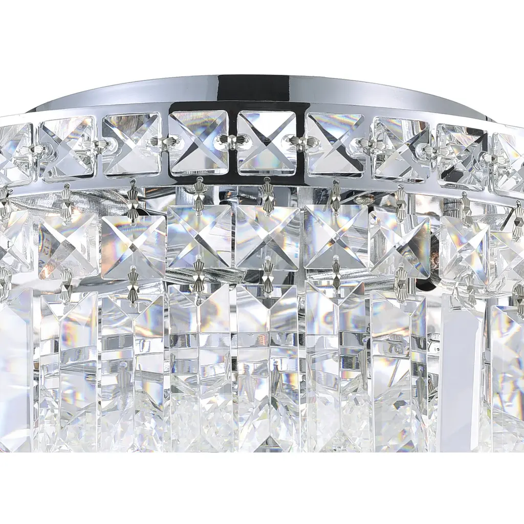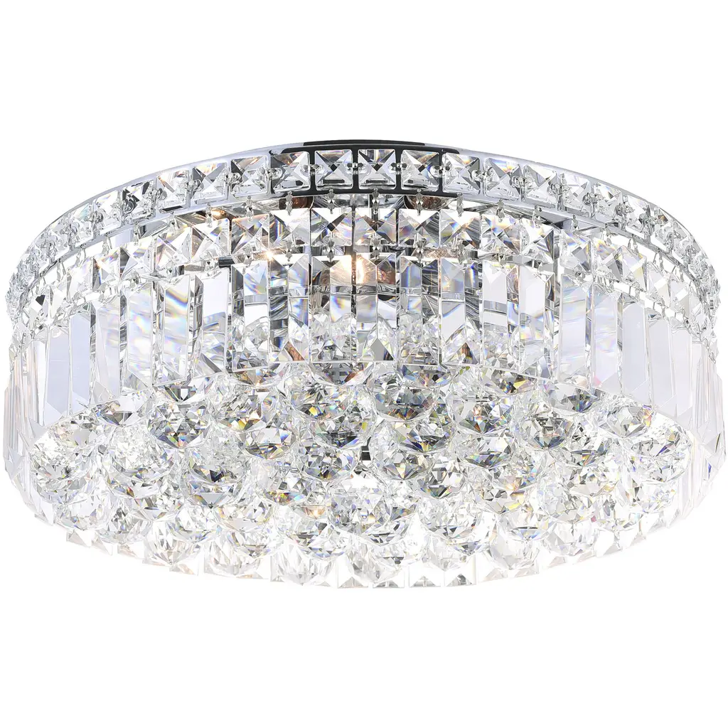 This breathtaking Colosseum 14'' 4-Light Flush Mount with Chrome Finish is a classic crystal lighting piece from our Colosseum Collection. Designed for ceilings with height limitations, this flush-mount fixture delivers high style in a compact form. The 14-inch round drum shade is adorned with faceted clear crystals, creating a sparkling effect when lit. Ideal for small or narrow spaces, this light fixture provides both functional brightness and refined glamour. E12 bulbs required (sold separately). Finish: Chrome Light Count: 4 Light Source: E12 LED Compatible (Bulbs Not Included) Adjustable Hanging Height: N/A (Flush Mount) Material: Metal and Crystal Style: Classic / Glam