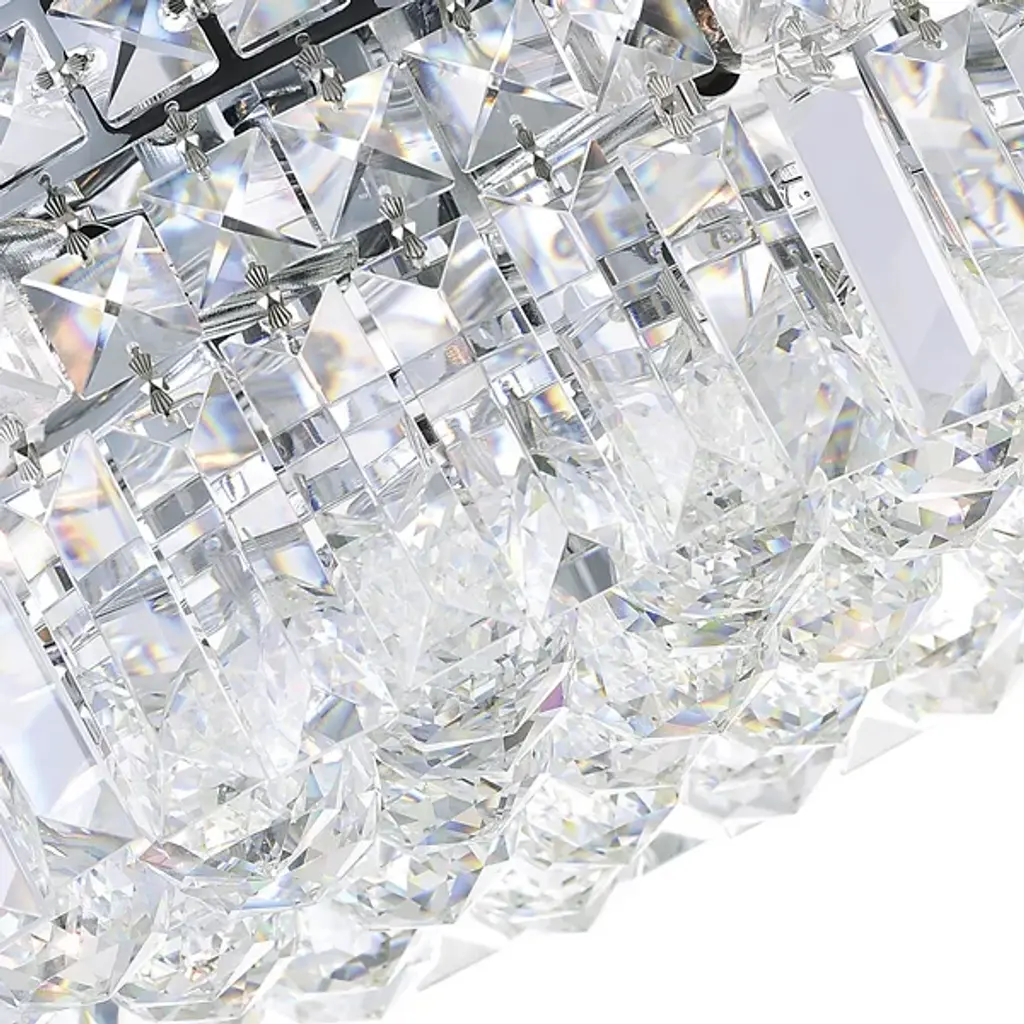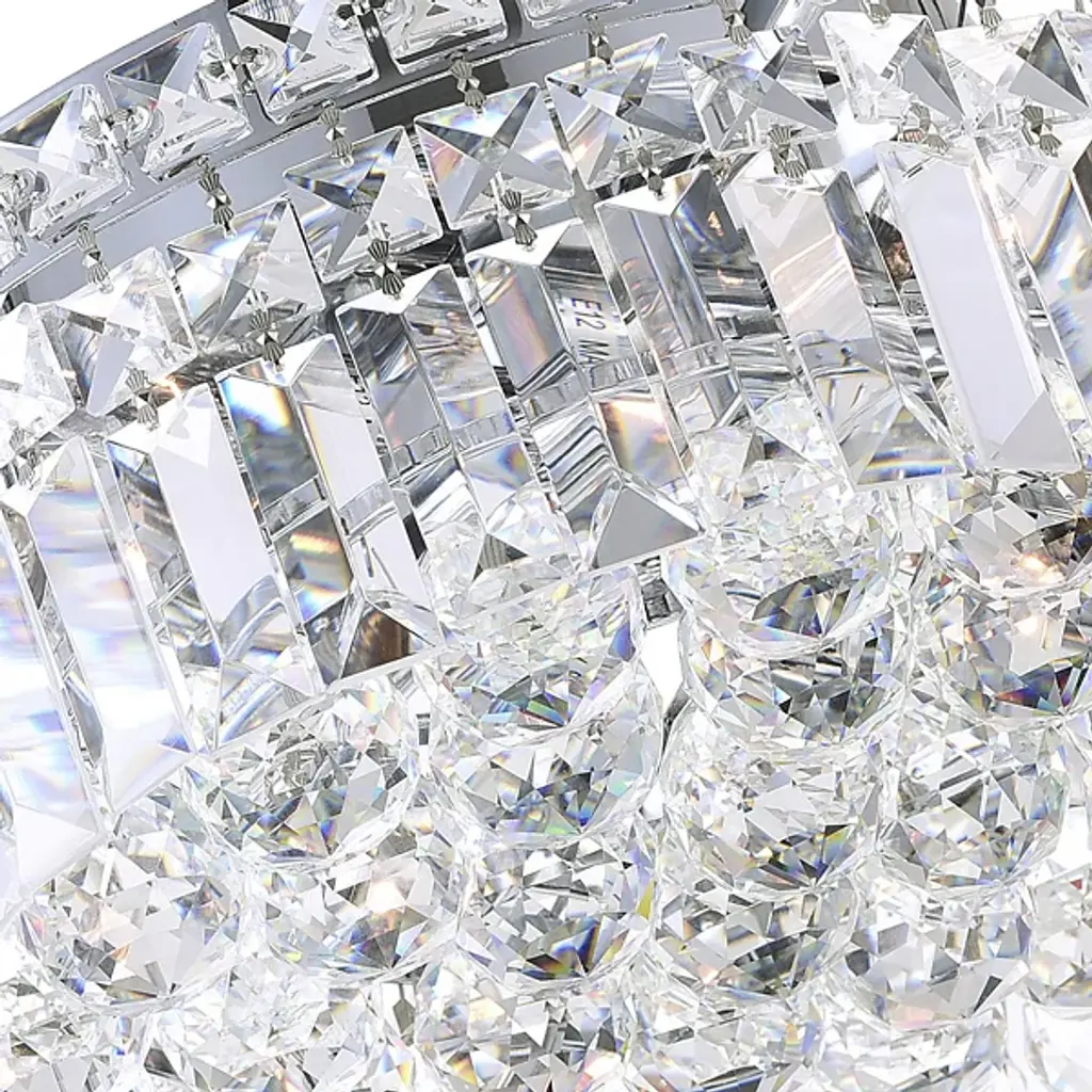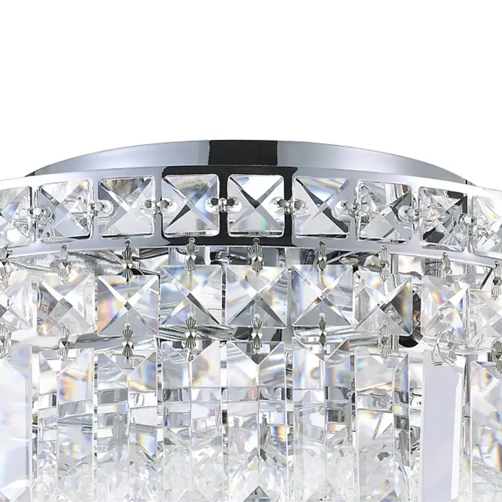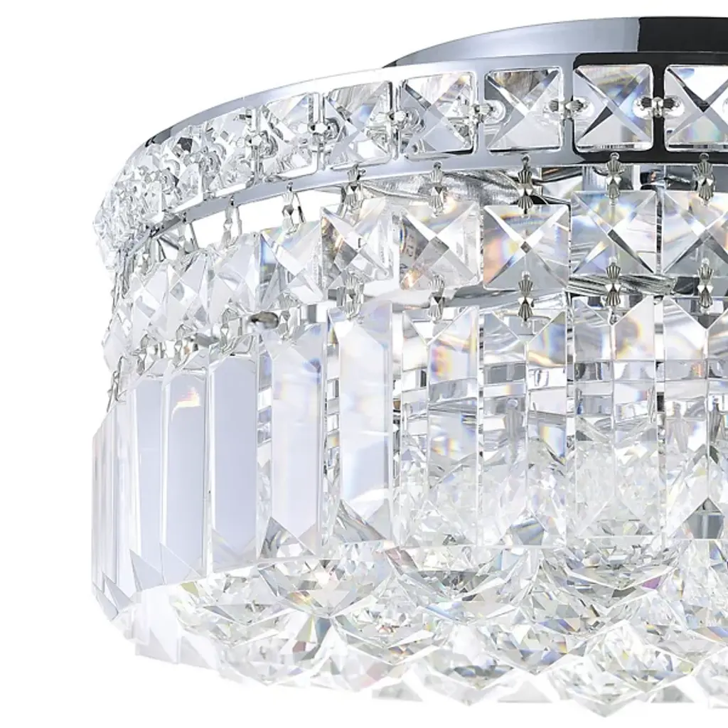 Crown your inside ceilings with the carefully shaped crystal of the Colosseum Flushmount from CWI Lighting. Transitional in style but cutting-edge in design, it uses a mirrored metal disc canopy to suspend a curtain of crystal beads and accents around inner lamping. The compact size ensures that even low ceilings can receive a bit of retro glamour, while each smooth facet transforms the light within into a radiant, sparkling spectacle that gleams off the metal frame around it.