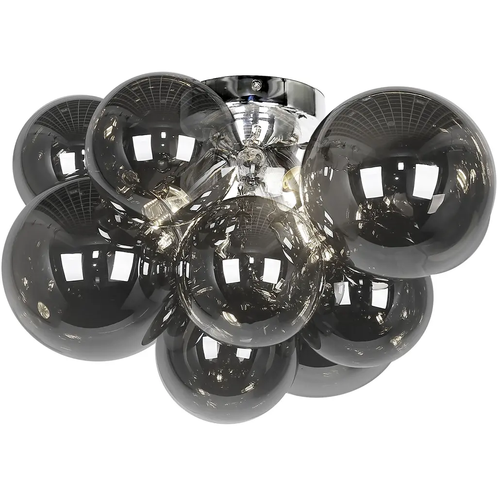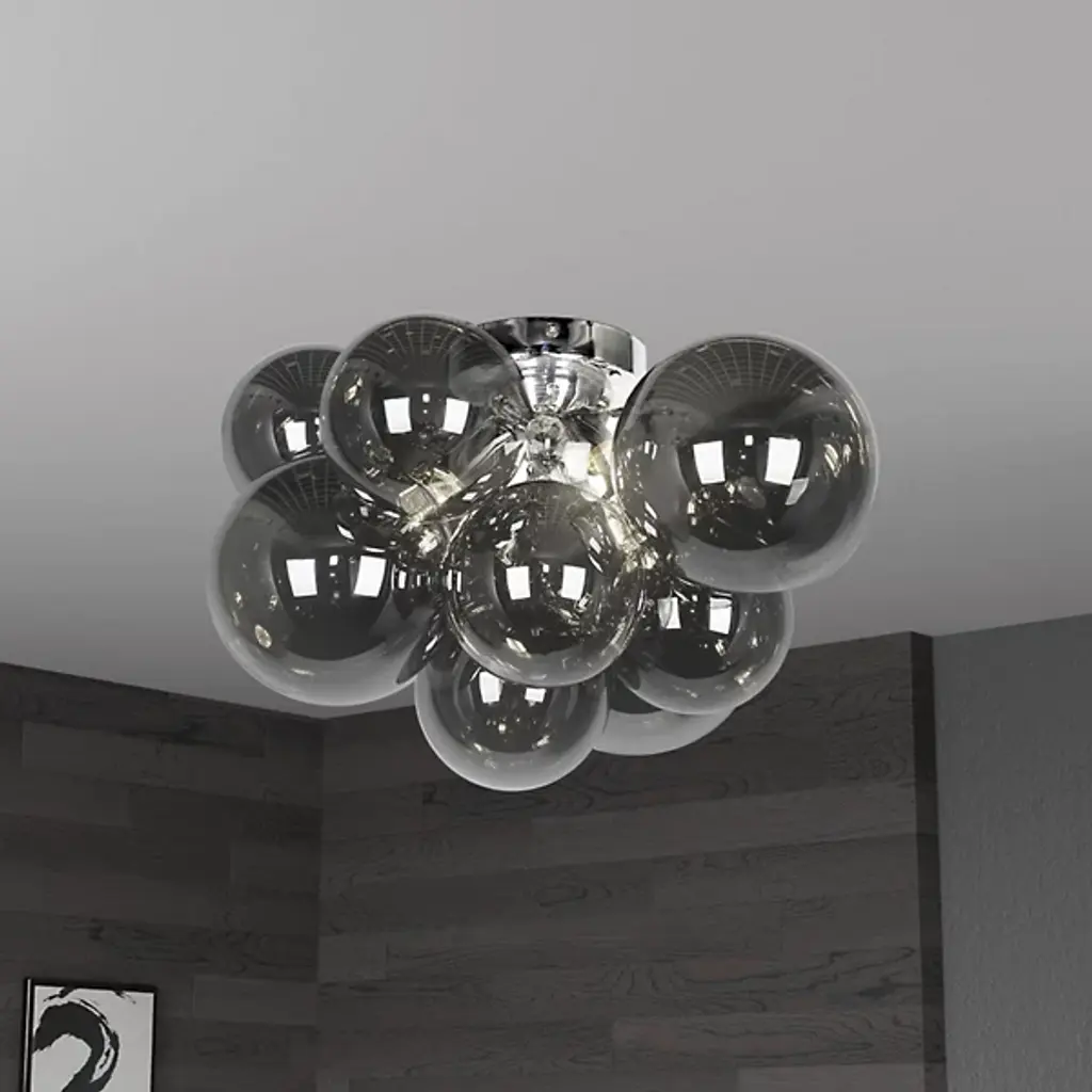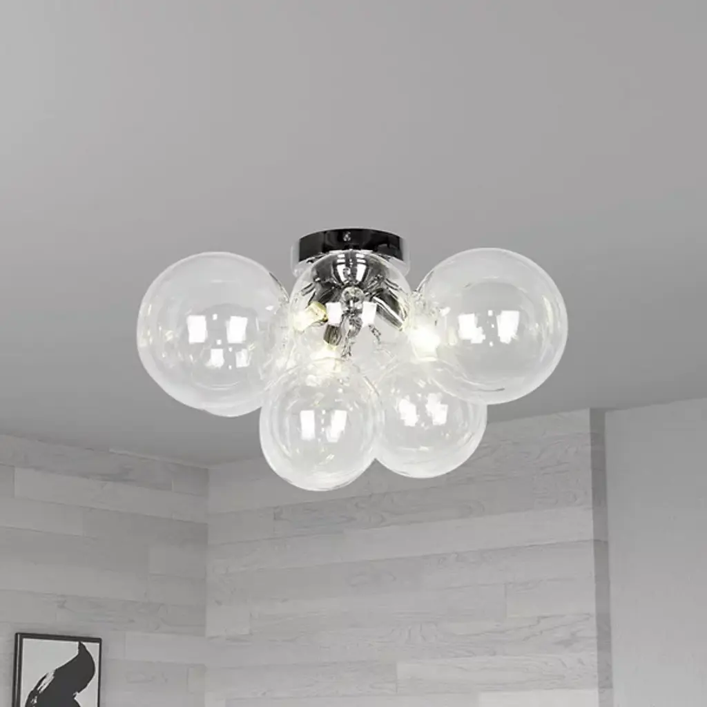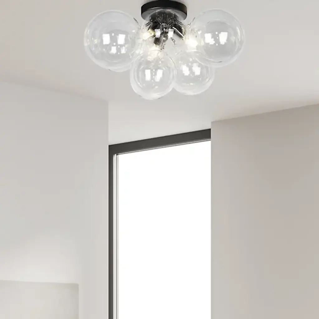 A stylish design bursting with energy. Bring light and delight to your living spaces with the glass globe composition of the Comet Flushmount from Dainolite. This piece sits tight against your ceiling with a low-profile metal canopy. Like a cluster of floating bubbles, glass globe shades sit tightly against each other, creating a silhouette of curves. The reflectiveness of the glass gives the piece a complexity and depth with or without the lights on. Tucked inside, a group of bulbs highlights the volumes while shining through as a spacious glow.