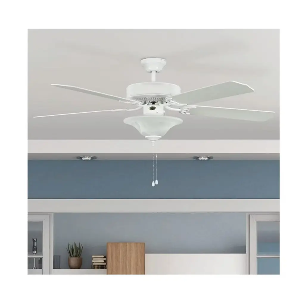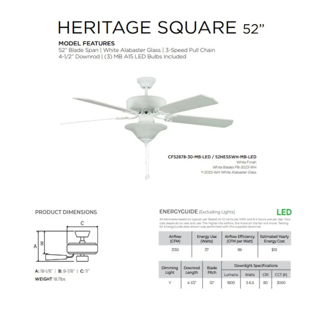 Concord Heritage Square 52" Indoor Ceiling Fan with LED Light, White Blending timeless design with everyday functionality, the Concord Heritage Square 52" ceiling fan in white is the perfect solution for comfort and lighting in bedrooms, living rooms, and more. Featuring a low-profile dual-mount design, this 5-blade fan provides powerful airflow and comes equipped with an LED light kit for energy-efficient illumination. Key Features: • 52" blade span with 5 matching white blades • Dual mount installation: use flush to ceiling or with included 4.5" downrod • Integrated LED light kit with three 6.5W LED bulbs (included) • Frosted white glass bowl shade delivers soft ambient lighting (600 lumens) • Pull chain operation for lighting and 3 fan speeds (low, medium, high) • 12-degree blade pitch for effective air circulation • Transitional design complements a wide range of interiors • Ideal for bedrooms, living rooms, and offices Specifications: • Model Number: 52HES5WH-MB-LED • Brand: Concord • Finish: White • Mounting Type: Dual Mount (flush or downrod) • Material: Engineered wood blades • Voltage: 120V • Wattage: 3 bulbs × 6.5W LED • Airflow: 4500 CFM • Operation: Pull chain • Indoor Use Only • Certification: UL Listed • Dimensions: 52" L x 52" W x 18.13" H • Weight: 17.6 lbs
