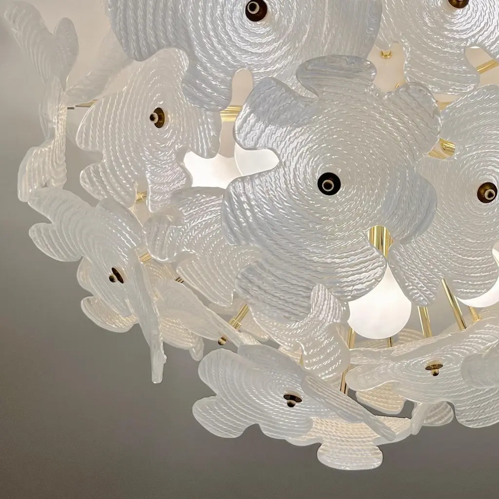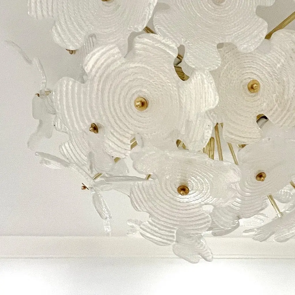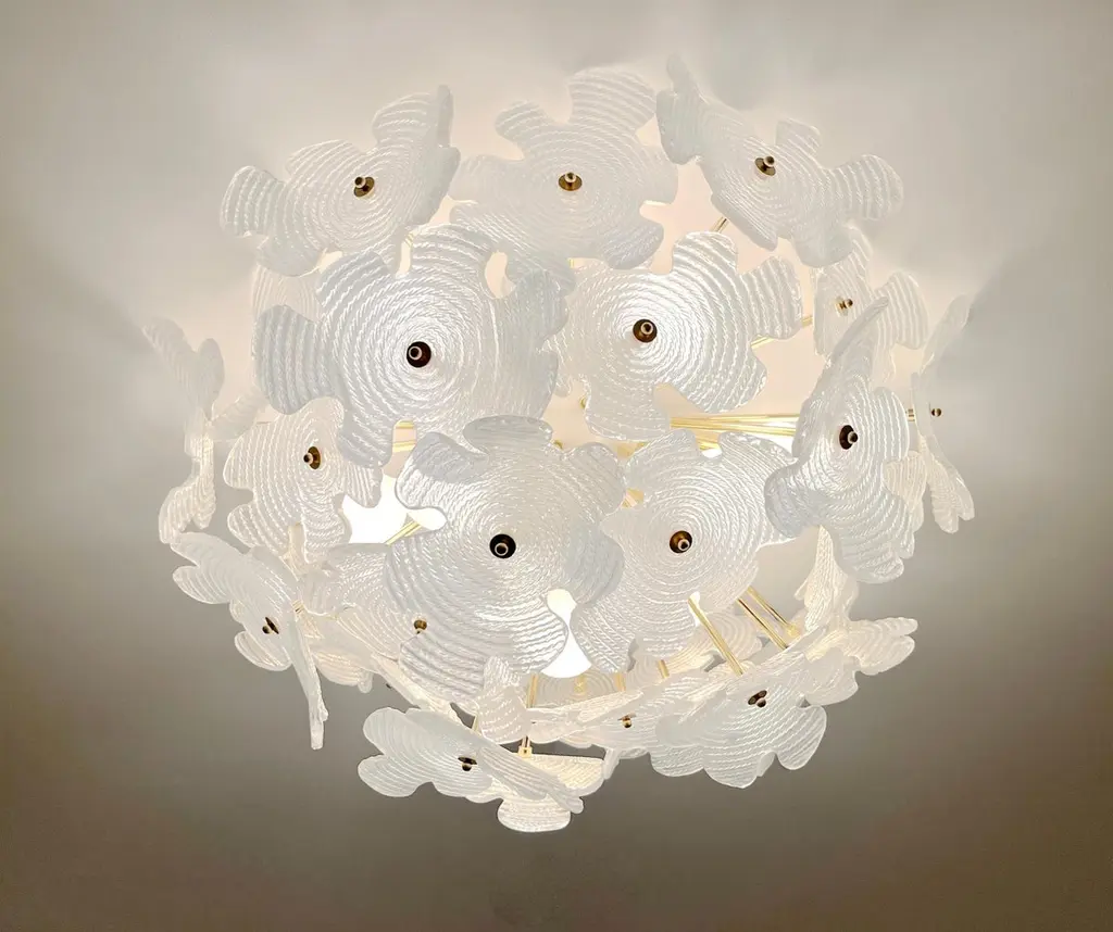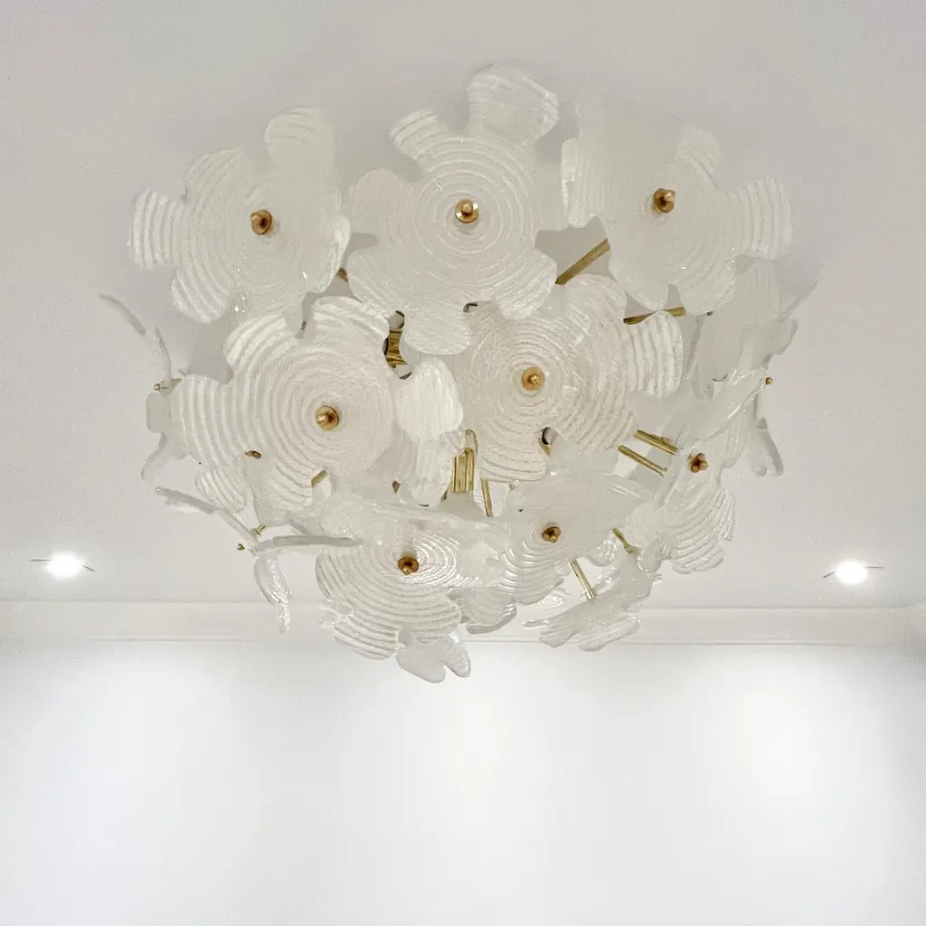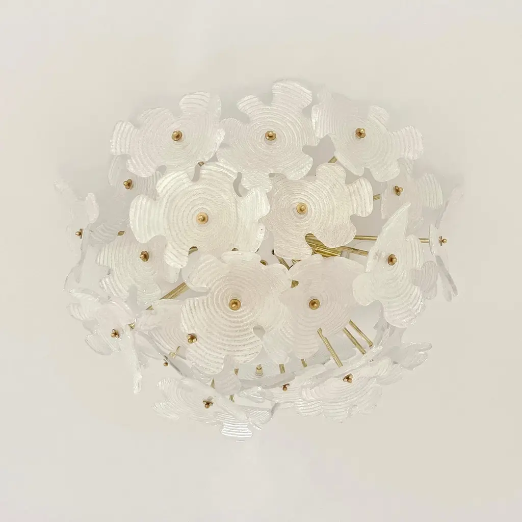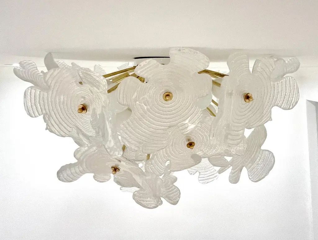 Contemporary Italian Brass & Satin White Murano Glass Flower Sputnik Flushmount