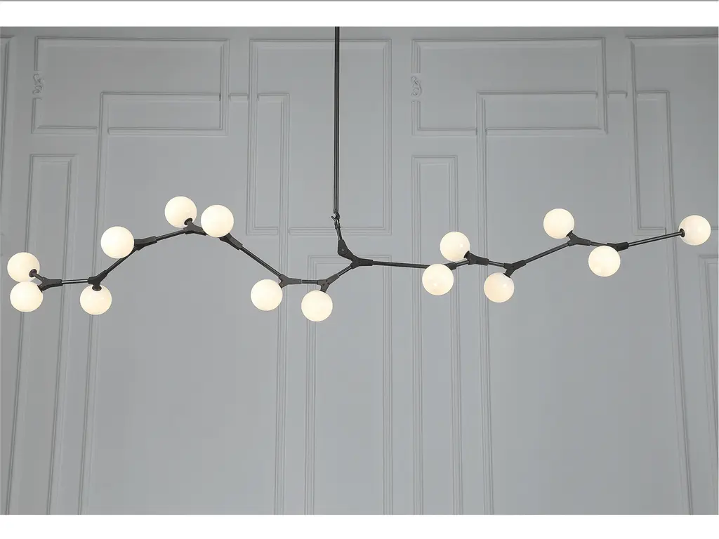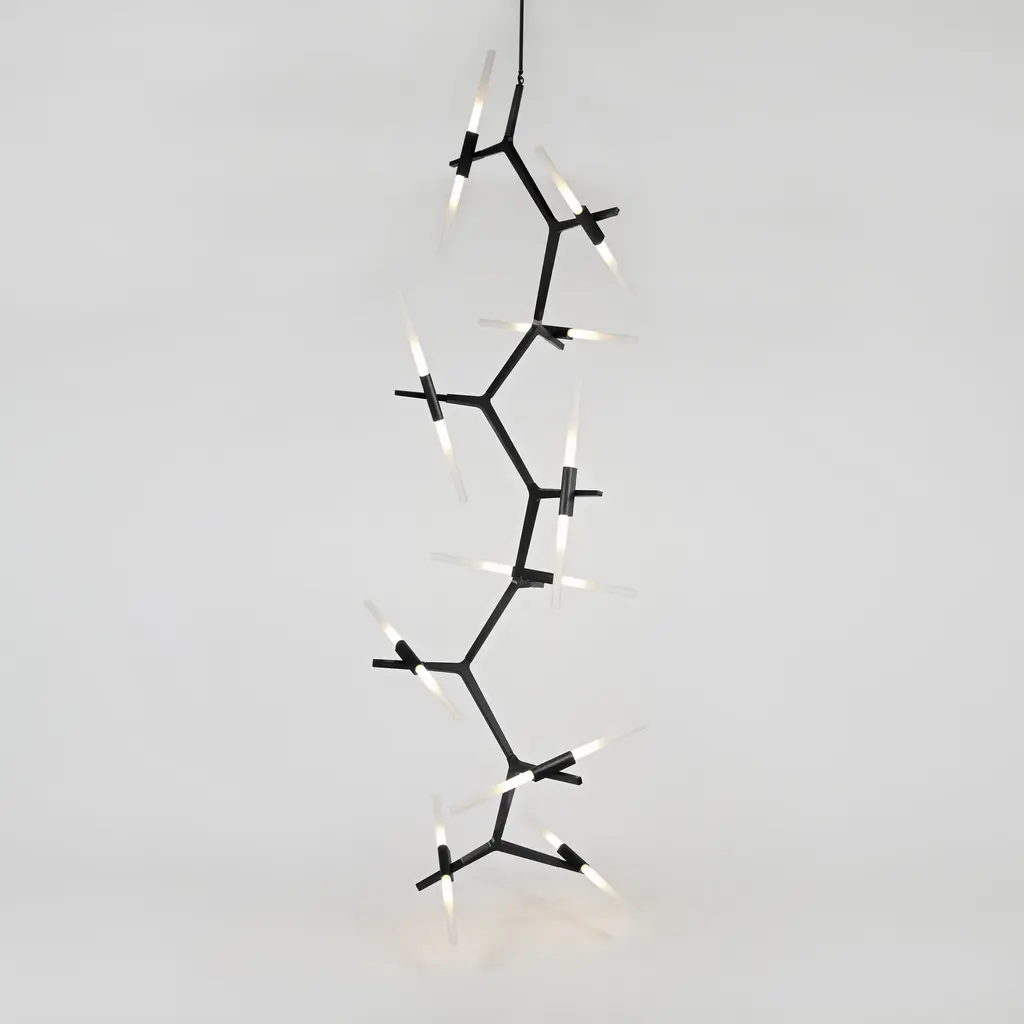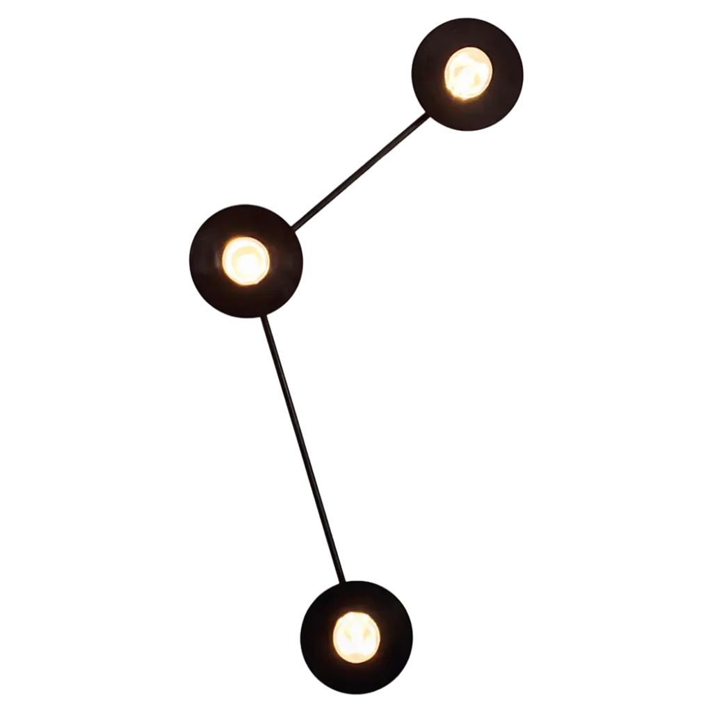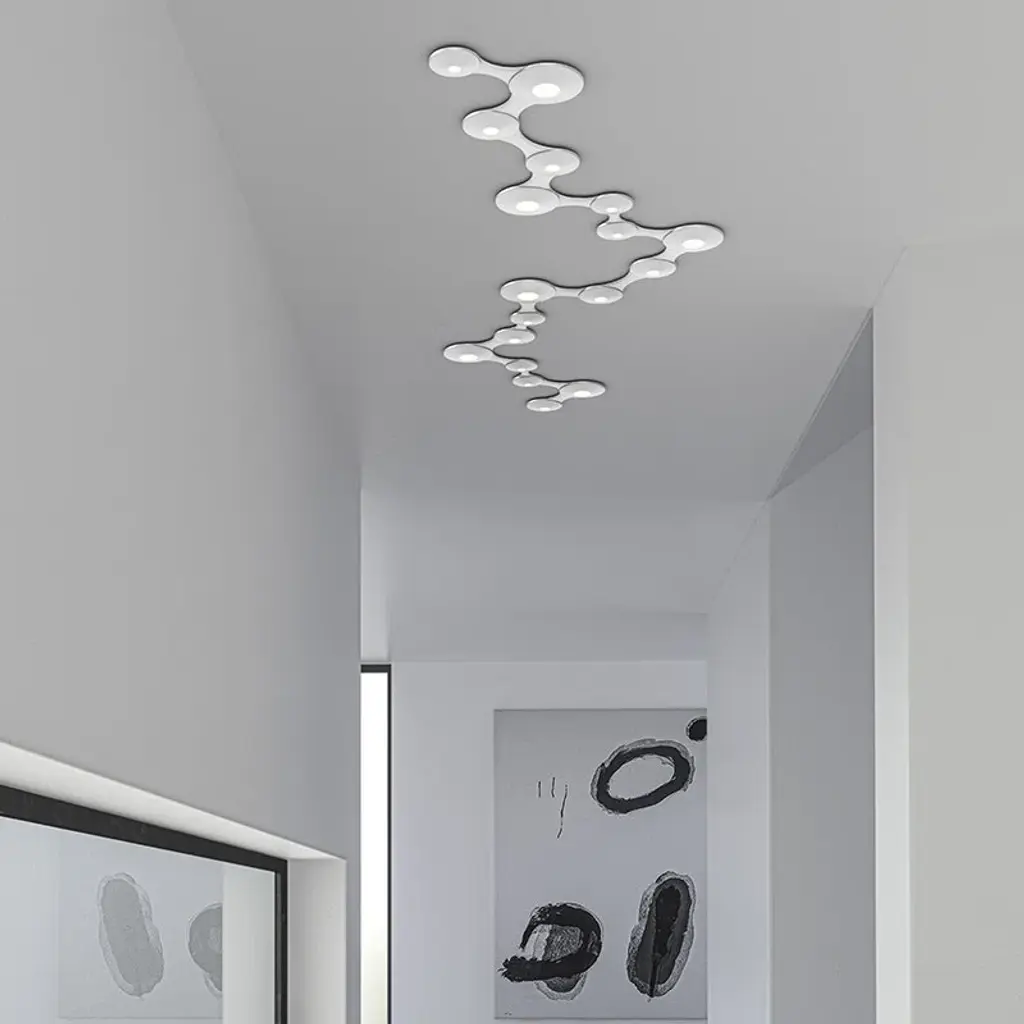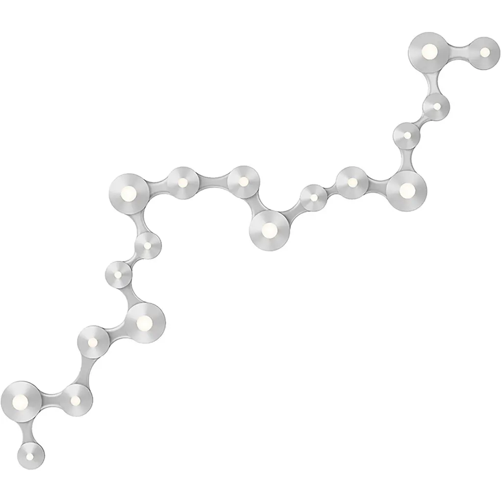 Flowing sculptural shapes connect clusters of luminaires across wall or ceiling surfaces in this organically modern system of light. Dramatically undulating patterns and paths characterize connected configurations of any size, while individually mounted three-light modules highlight the flowing forms, bringing a soft approach to artistic expression to this expandable system. By adjusting the installation angle of the connectors, the same set of components can be installed in an infinite variety of configurations. Each cluster includes housing and three luminaires with small, medium, and large lenses. Each driver supports up to six clusters.