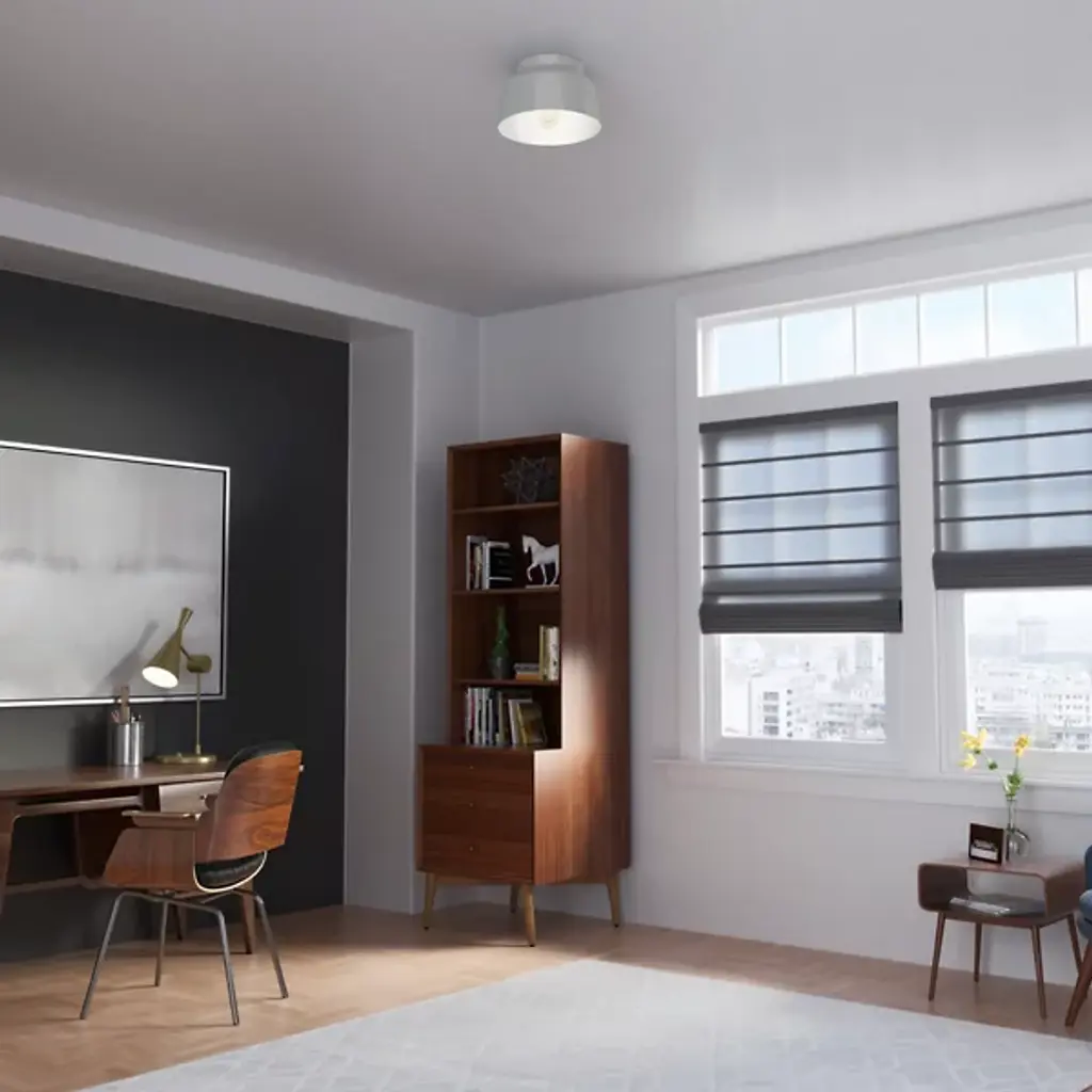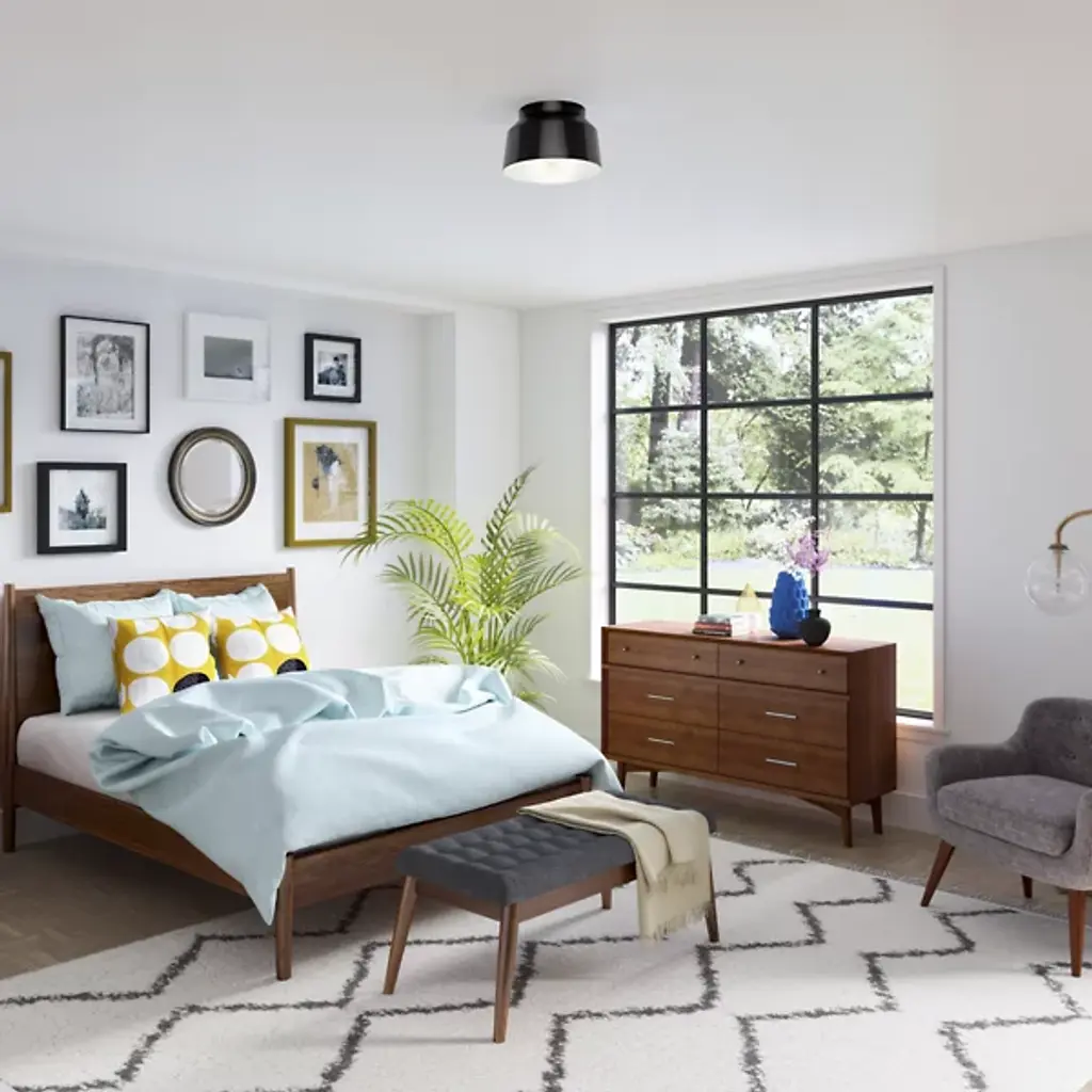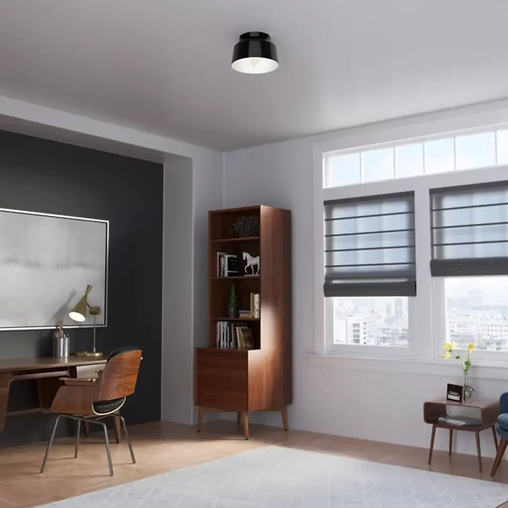 Both retro and modern, the Cranbrook Flushmount by Hunter Fans takes cues from mid-century modern design and creates a clean and contemporary piece. A metal hood angles softly to shade its inner lamping and direct its light downward. A white interior presents a vivid contrast to its outer finish and enhances the warm glow emanating from its single light bulb. Its simplistic design offers just the right amount of vintage personality to suit any modern space.