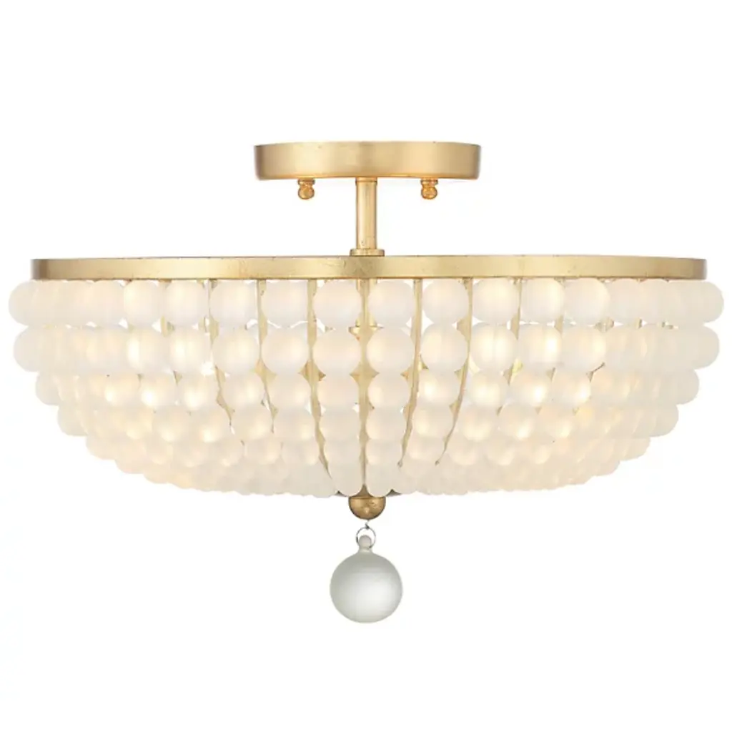 A traditional Empire shape meets modern elements in Crystorama's Rylee Collection. A circular-shaped hand-painted frame gives this fixture a vintage, distressed look, while the beads lend to a bohemian style flare. The Rylee creates a rich visual impact on any space in a perfect combination of texture and materials. Rylee collection features a versatile farmhouse / rustic design. / A breezy, light-filled style that blends soft hues, natural materials, and nautical touches for a relaxed, seaside-inspired feel. / The black metal mixed with the frosted glass beads is a great chic contrast. / Matte Black finishes are everywhere in contemporary design. This velvety muted finish makes a modern statement and can create a beautiful contrast while maintaining a super stylish and sleek look. / 12.5"W x 6.5"H x 12.5"D / 3 light 60- watt, E12 Candelabra base / Steel / Authorized for use in damp, high-humidity interior locations or protected exterior locations. Meets United States UL Underwriters