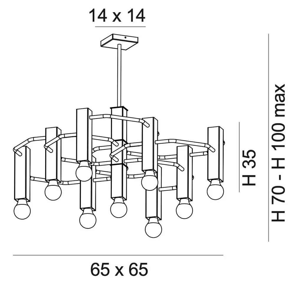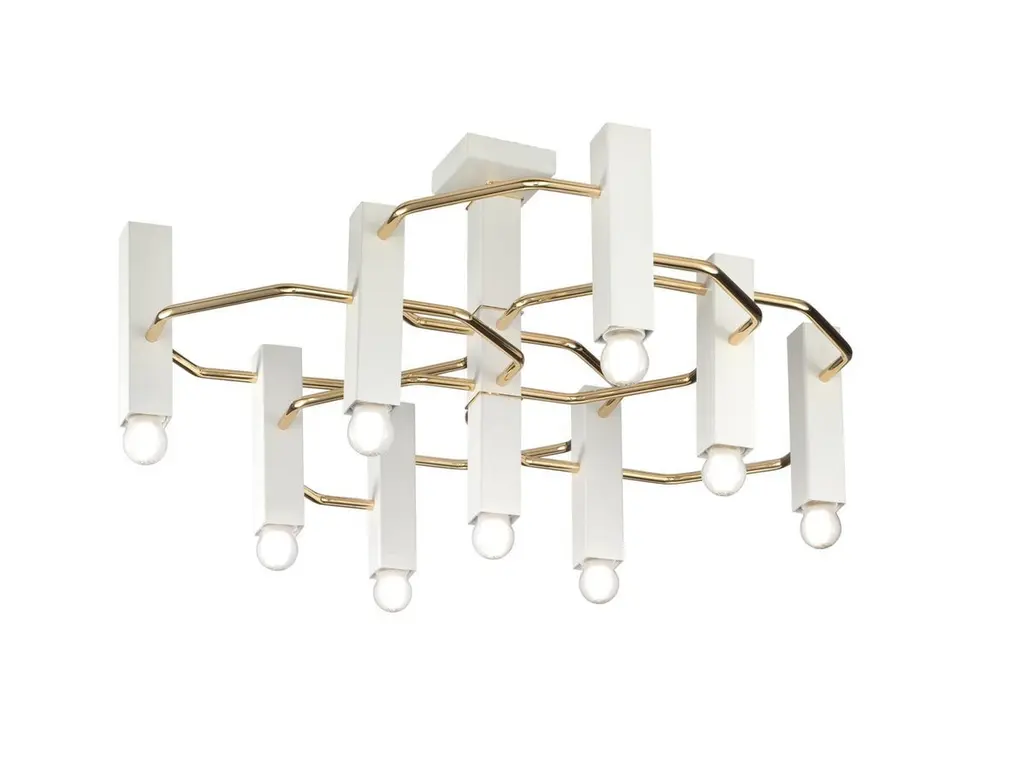 Italian geometric flush mount or chandelier with 9 white square bulb holders interconnected with metal tubes in glossy gold finish / Made in Italy by Fabio Ltd inspired by Gaetano SciolariLength: 26 inches / Width: 26 inches / Height: 14 inches plus rod and canopy9 lights / E26 or E27 type / max 40W eachOrder only / This item ships from ItalyOrder Reference #: FABIOLTD C871