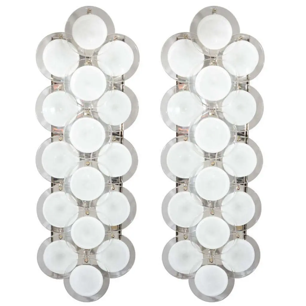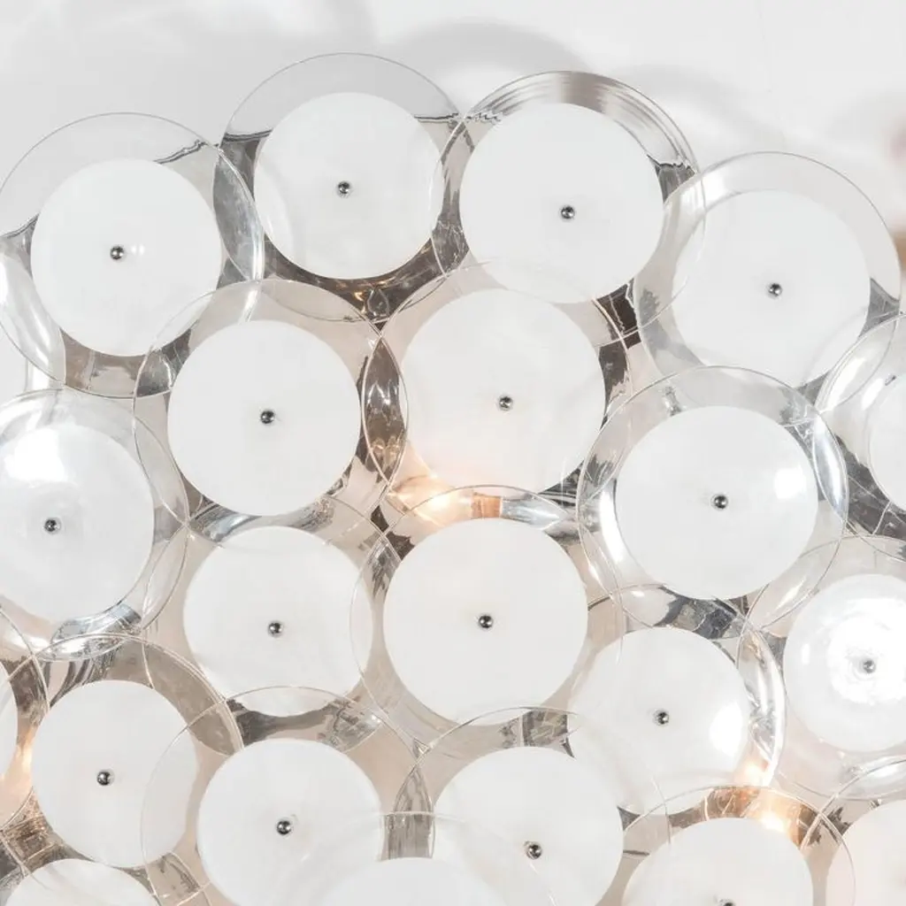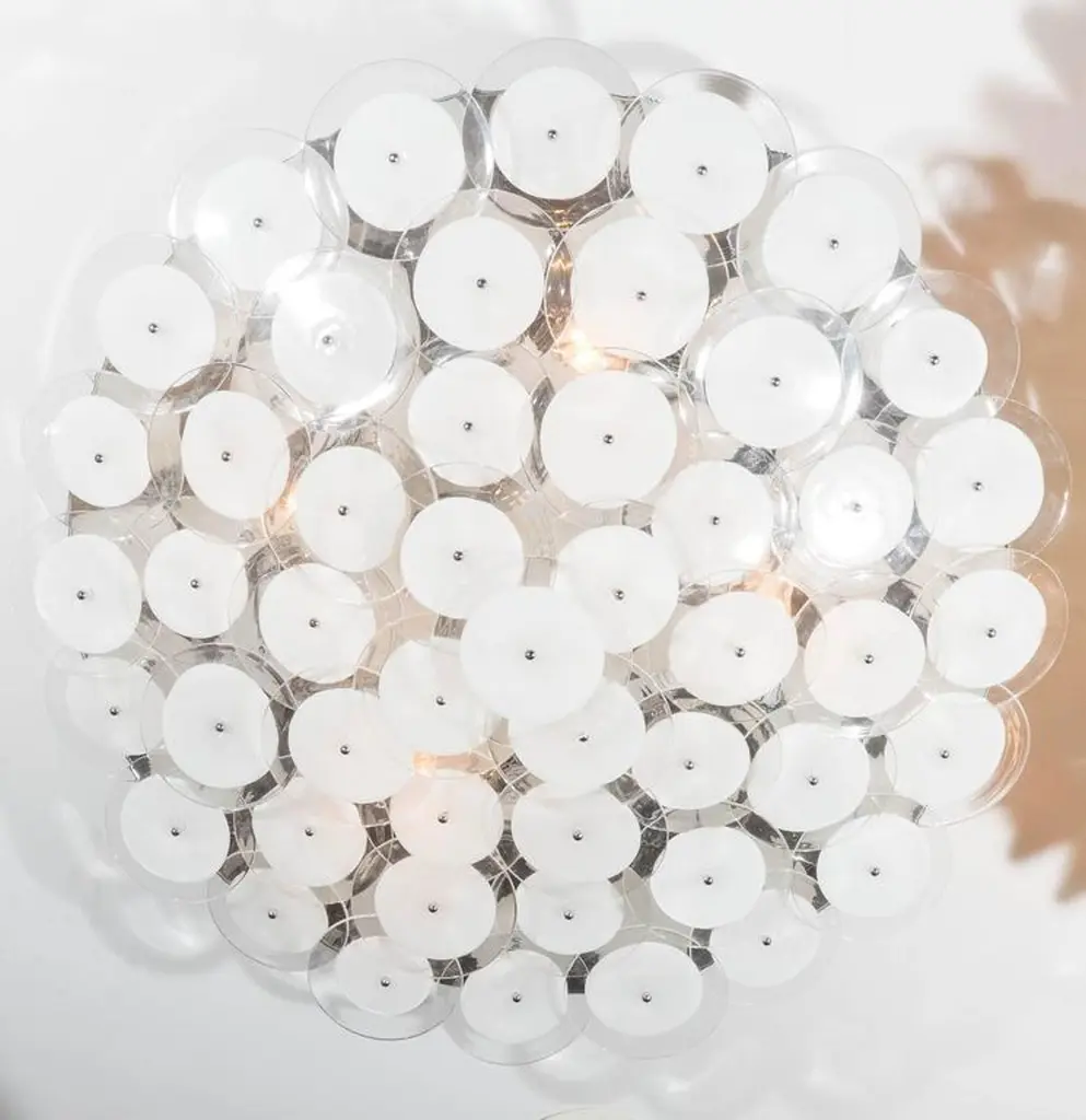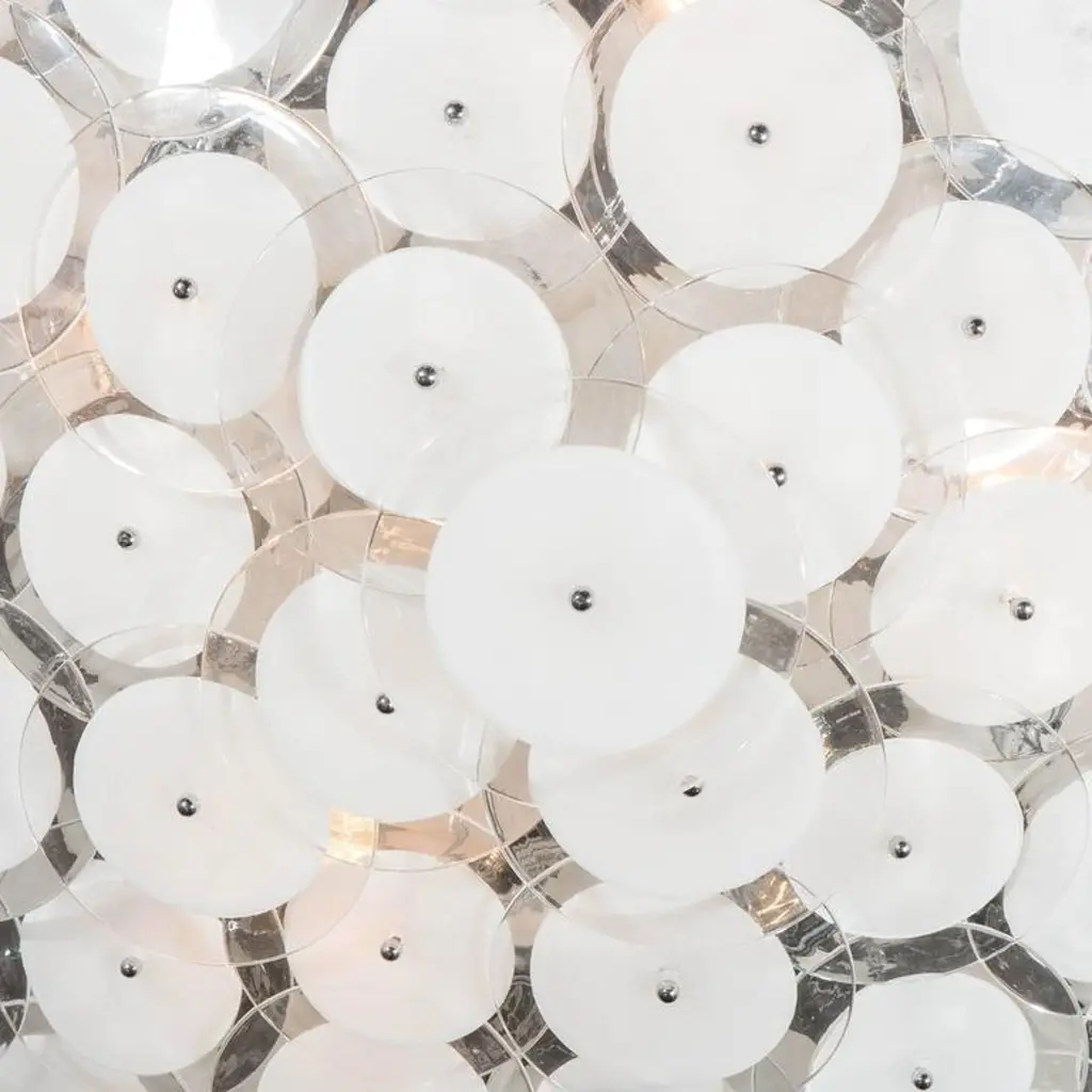 Custom made-to-order white Murano glass disc flush mount light in polished nickel finish. Custom orders are available for different sizes, finishes, and glass colors.