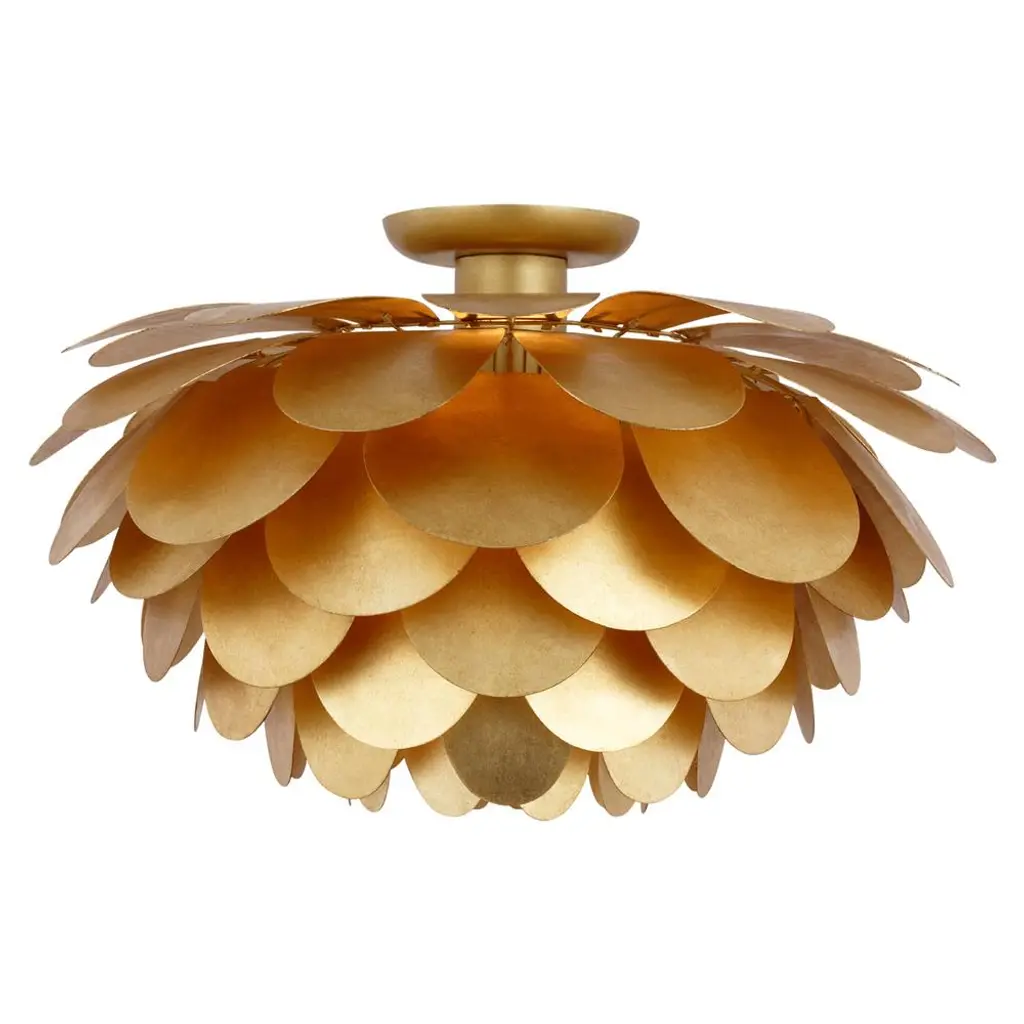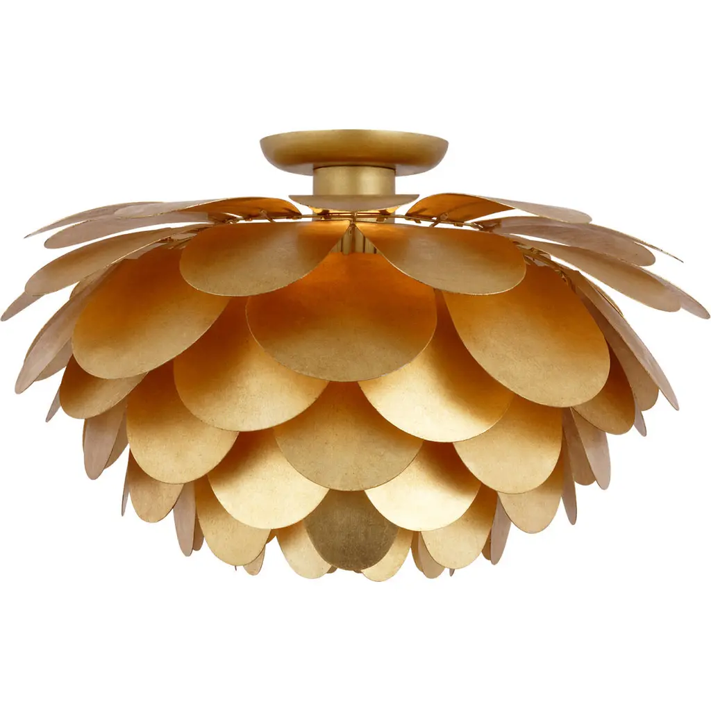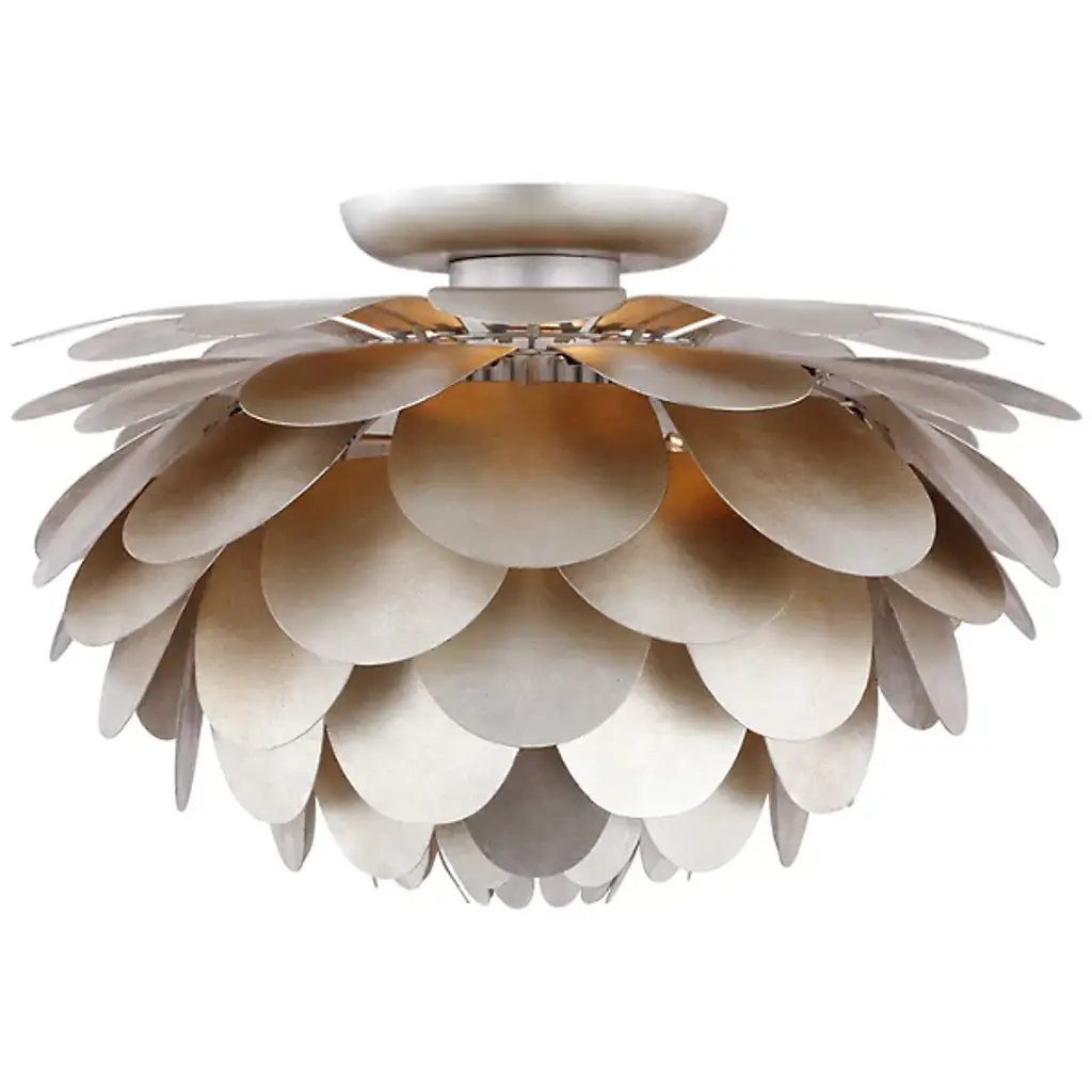 Bring a subtle vintage presence to ceilings with the Cynara Flushmount from Visual Comfort Signature. Designed by Chapman &Myers, its stylized natural shape suggests an inverted flower; it descends from a rounded canopy, placing strong lamping inside a series of metal petals that reduces glare to the sides, focusing a mix of reflected radiance and sparkles of direct light below the fixture. This compact figure is excellent for tight spaces and open areas alike.