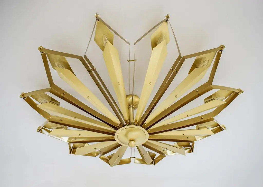 Elegant Italian flushmount with satin brass frame handcrafted to resemble a convex dahlia flower, designed by Fabio Bergomi for Fabio Ltd / Made in Italy12 lights / E12 or E14 type / max 40W eachMeasures: Diameter 51 inches, height 16 inchesOrder only, this item ships from ItalyOrder Reference #: FABIOLTD C664