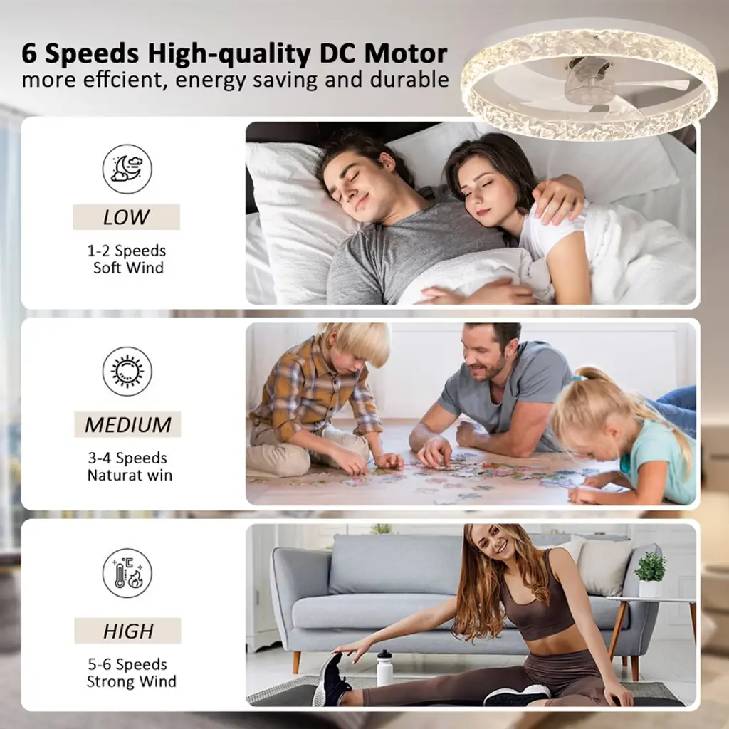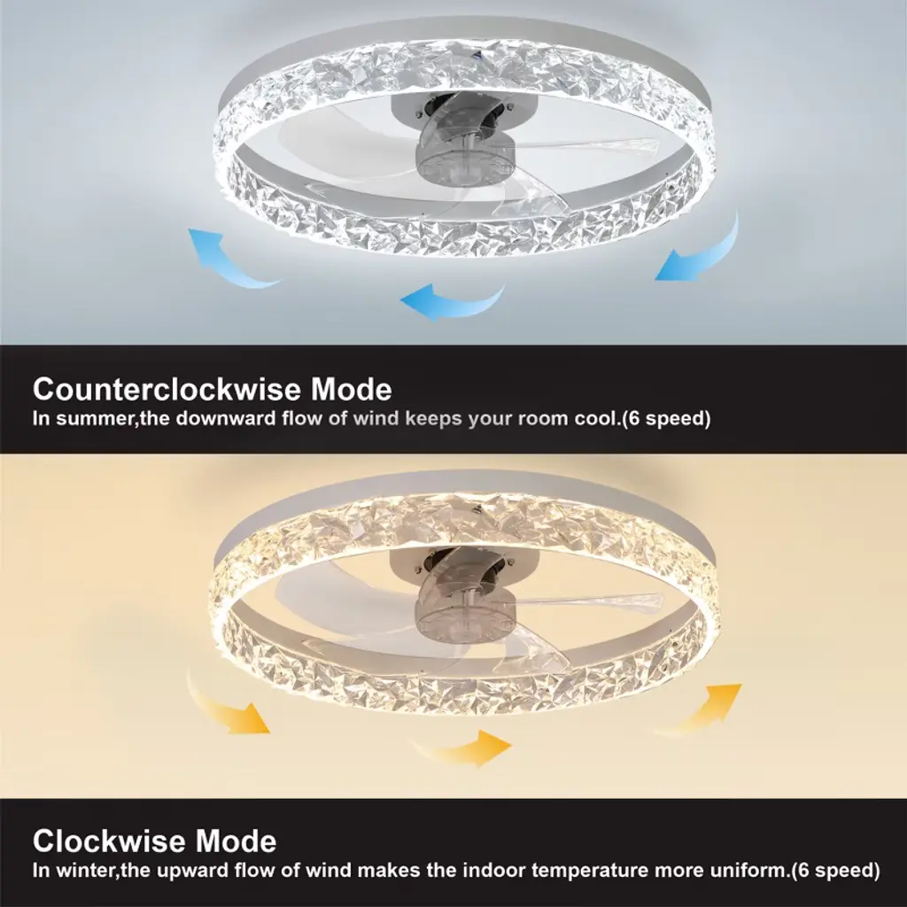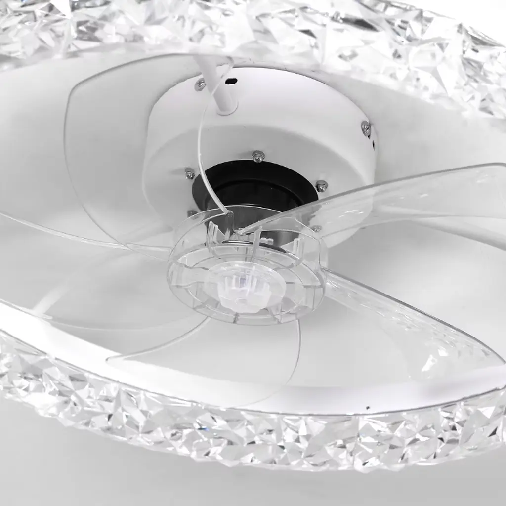 Elevate your bedroom, living room, or dining space with this elegant 20" crystal flush mount ceiling fan. Ideal for low ceilings or compact areas, this stylish fixture combines the luxury of a chandelier with the functionality of a bladeless ceiling fan. The integrated dimmable LED light provides soft, adjustable illumination, while the quiet motor ensures a peaceful breeze without noise or wobble. The sleek finish pairs beautifully with the shimmering crystal accents, creating a timeless look that complements both modern and traditional interiors. This ceiling fan with light features remote control and mobile app operation for convenient lighting and fan speed adjustments. Upgrade your home with a statement-making flush mount ceiling fan that brings comfort, sparkle, and sophistication to any room.