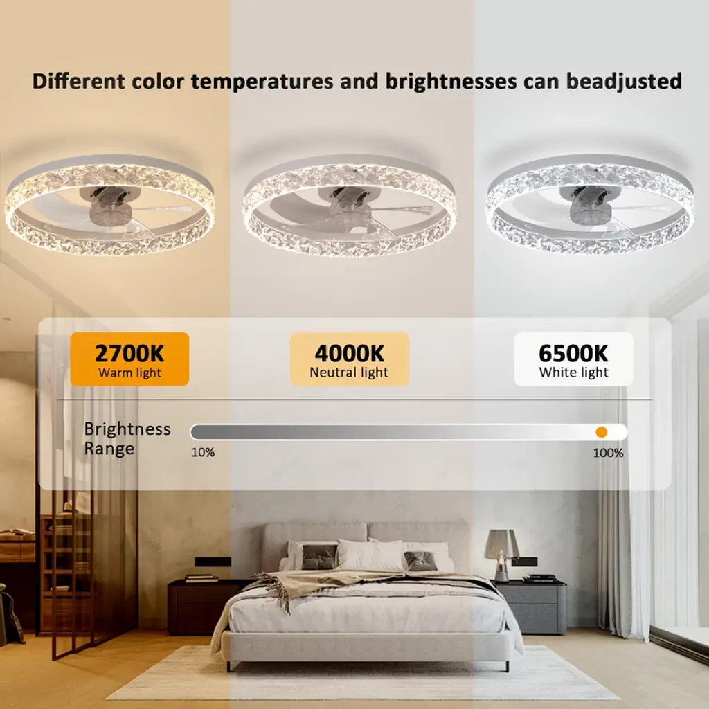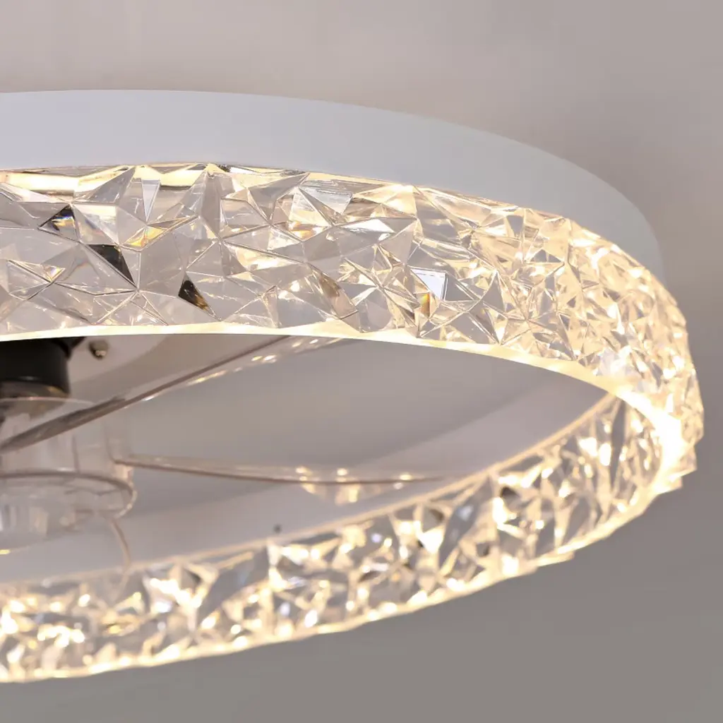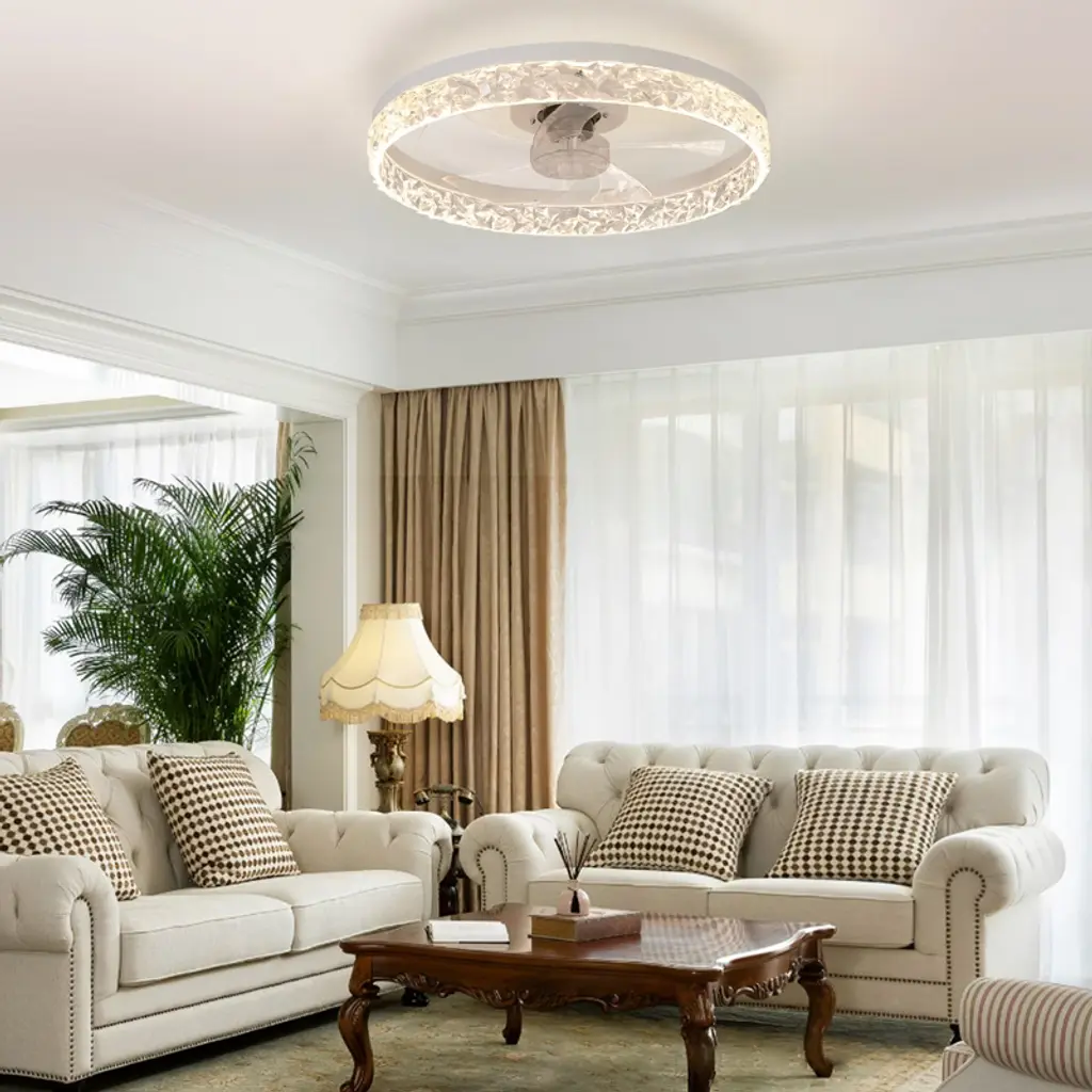 Elevate your bedroom, living room, or dining space with this elegant 20" crystal flush mount ceiling fan. Ideal for low ceilings or compact areas, this stylish fixture combines the luxury of a chandelier with the functionality of a bladeless ceiling fan. The integrated dimmable LED light provides soft, adjustable illumination, while the quiet motor ensures a peaceful breeze without noise or wobble. The sleek finish pairs beautifully with the shimmering crystal accents, creating a timeless look that complements both modern and traditional interiors. This ceiling fan with light features remote control and mobile app operation for convenient lighting and fan speed adjustments. Upgrade your home with a statement-making flush mount ceiling fan that brings comfort, sparkle, and sophistication to any room.