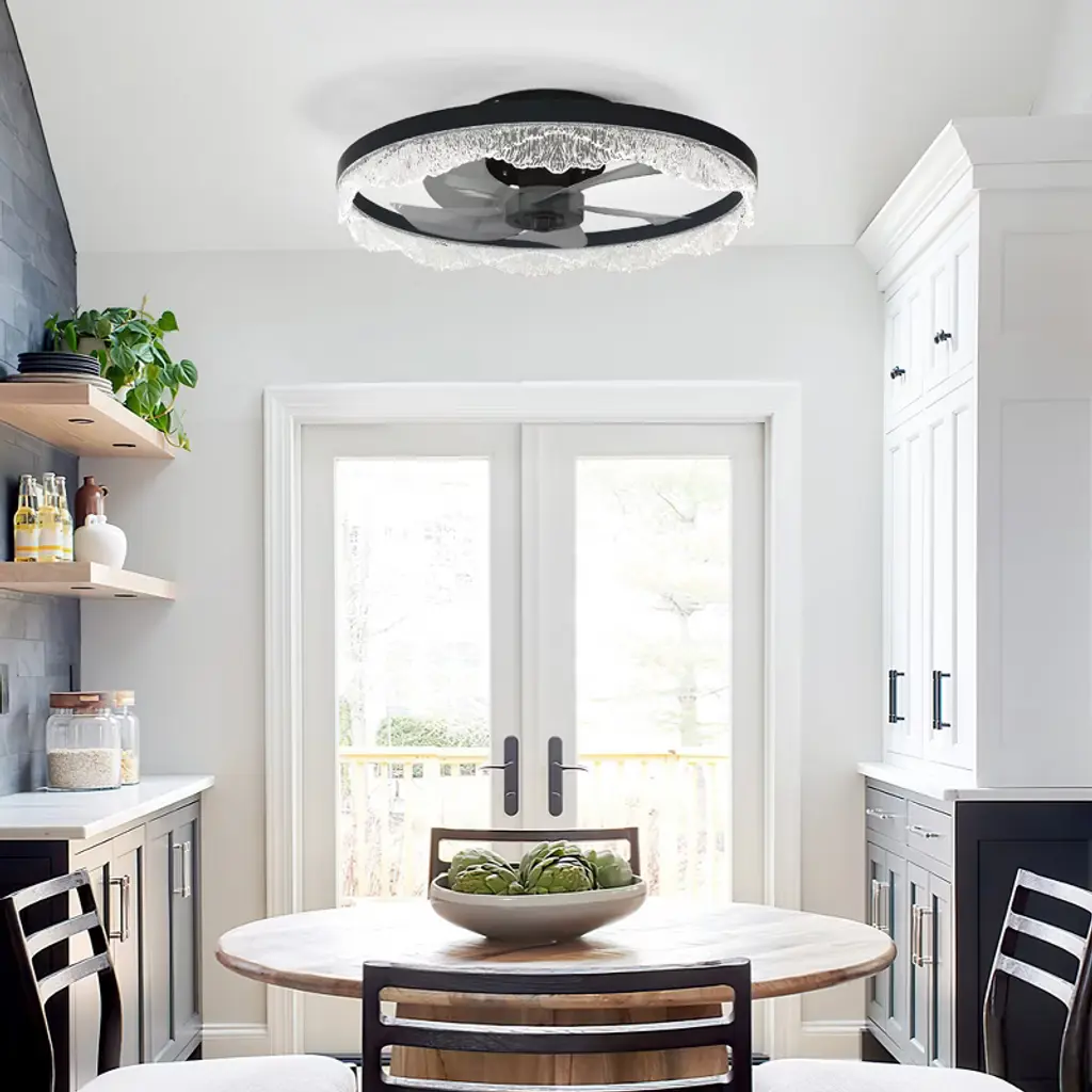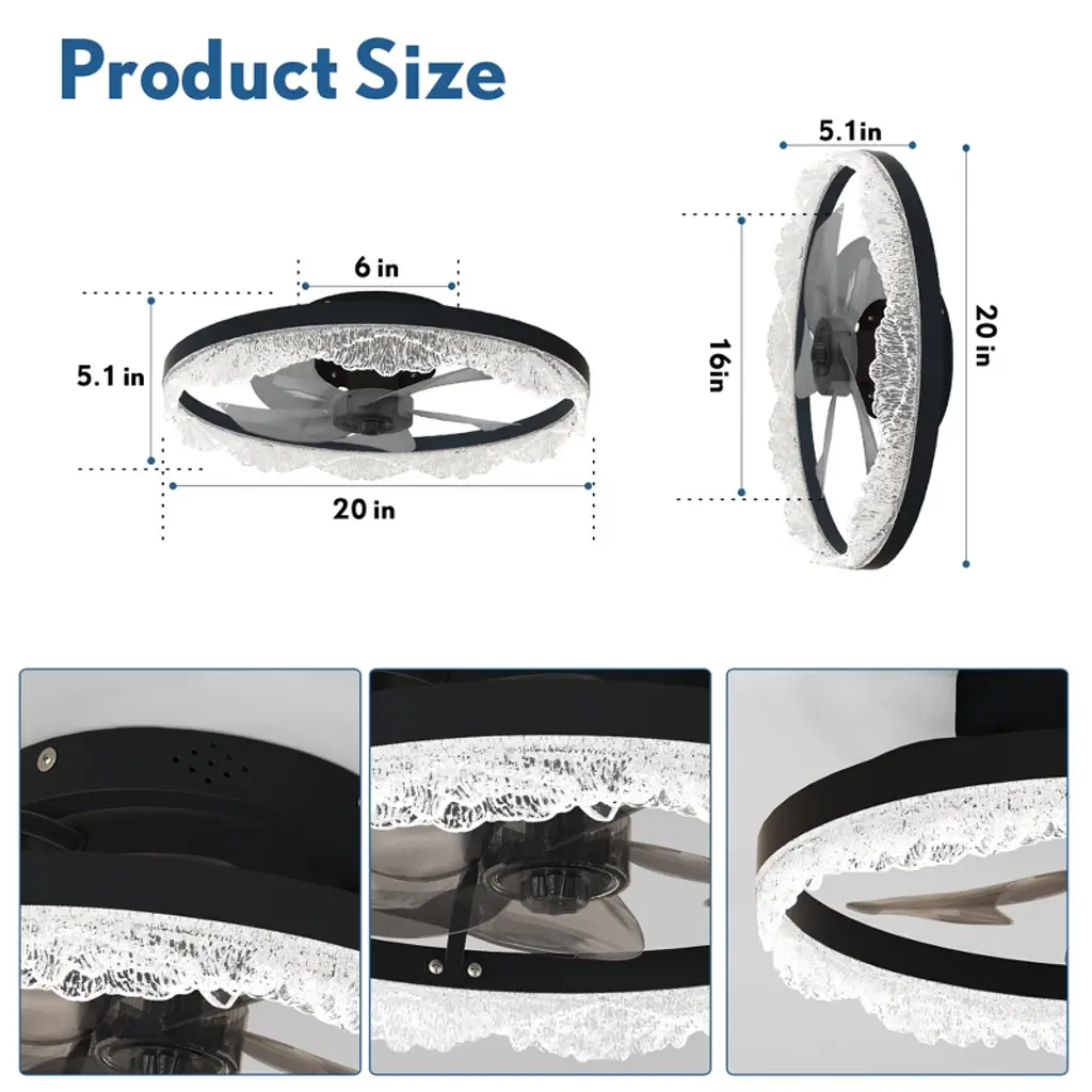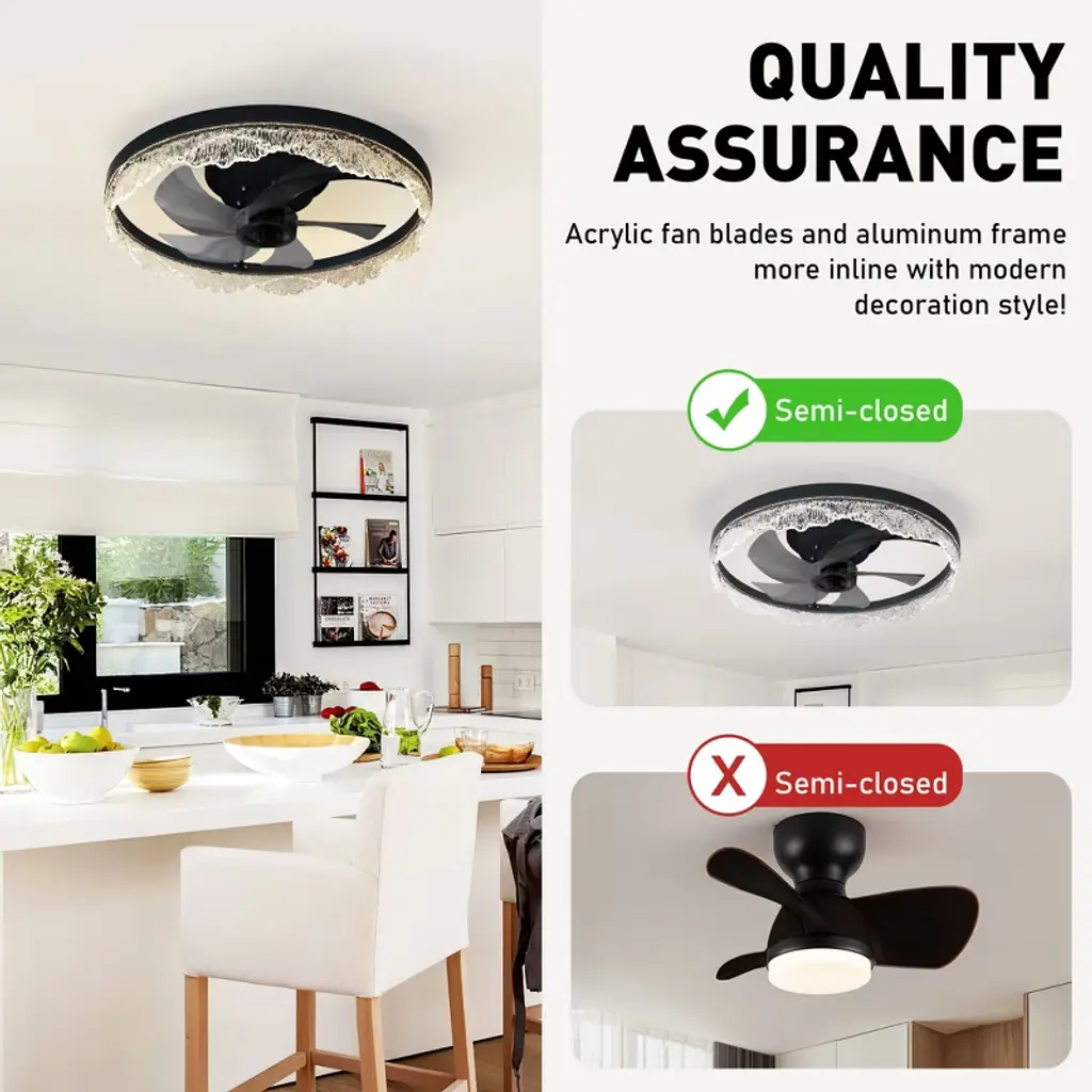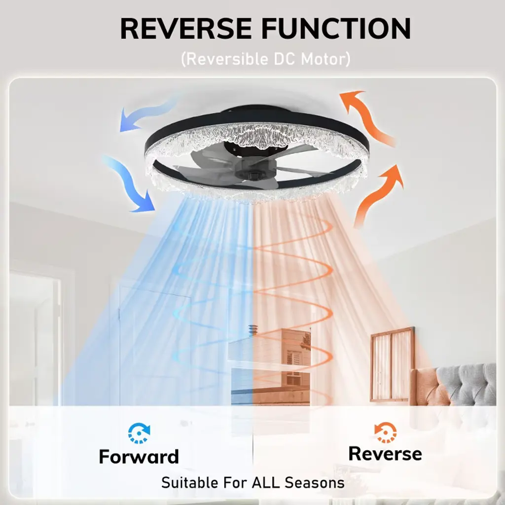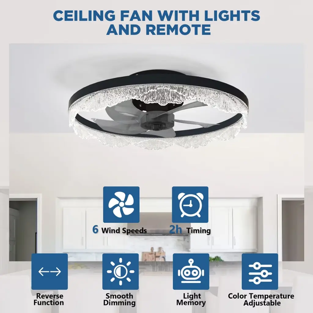 Bring cooling comfort and crystal charm to your space with this flush ceiling fan with light¡ªa perfect blend of style and practicality. Whether for the bedroom, nursery, kitchen, or study, this modern ceiling fan is available in three sizes: 16", 20", and 24" to suit different room needs. Hidden fan blades and a sleek flush mount ceiling light design save space, while the integrated LED light kit delivers dimmable lighting with three color temperatures. Control it all with a remote or app¡ªlight, wind, and timer, all at your fingertips. Perfect for modern homes with low ceilings, this ceiling fan with light and remote adds both elegance and efficiency.