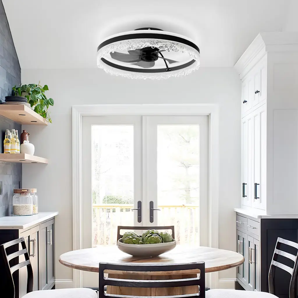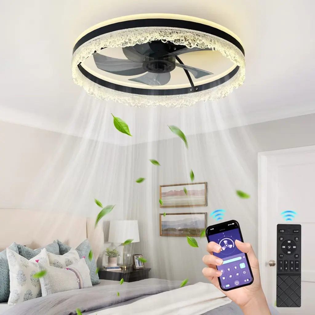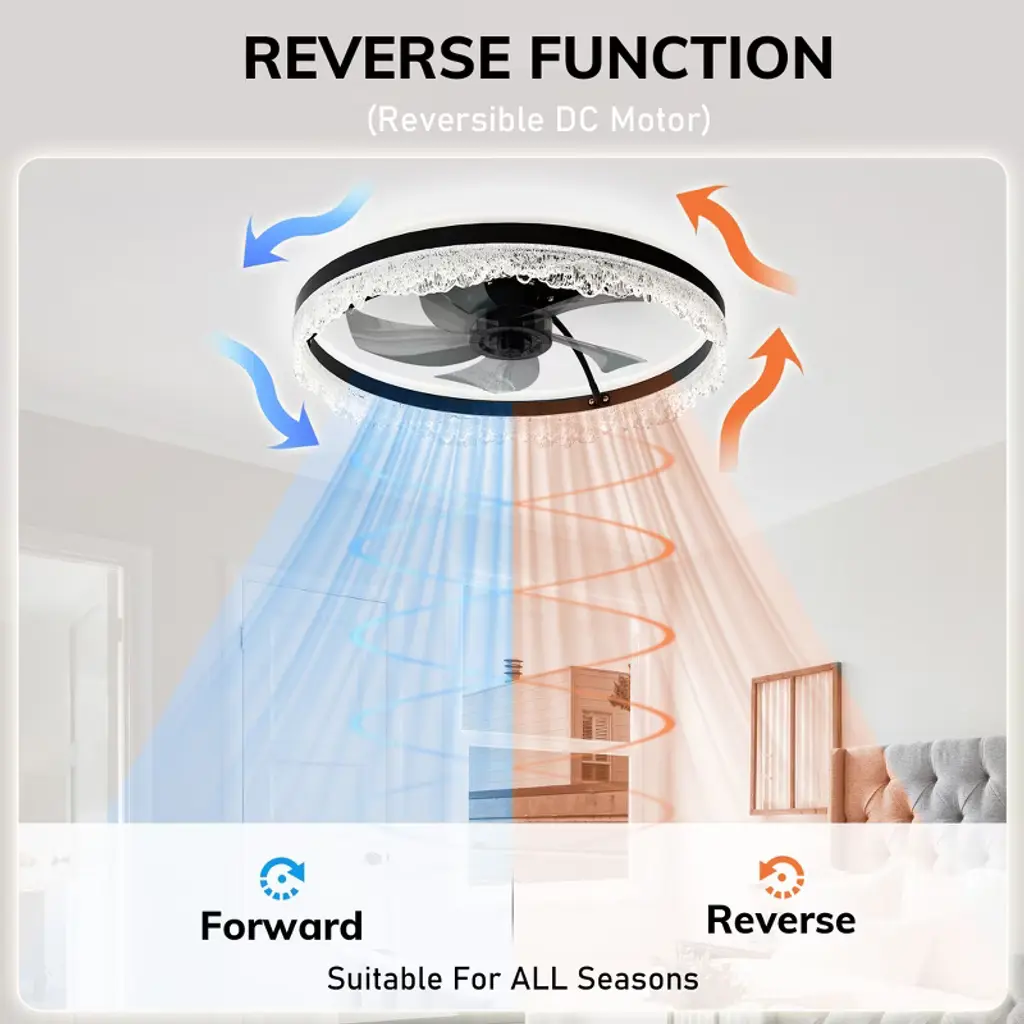 Upgrade your bedroom, nursery, or study with this sleek flush ceiling fan with light¡ªa space-saving solution that blends modern ceiling fan design with the sparkle of a crystal fixture. Designed for rooms with low ceilings, this flush mount ceiling fan features a quiet motor and hidden blades that deliver strong airflow with minimal noise. The integrated LED light panel offers 3 dimmable color modes¡ªWarm, Neutral, and Cool¡ªwhile the included remote and app control make it easy to adjust brightness, fan speed, or set a timer. Perfect for those seeking both comfort and elegance in compact spaces, this ceiling fan with light and remote brings functional beauty into any modern home.