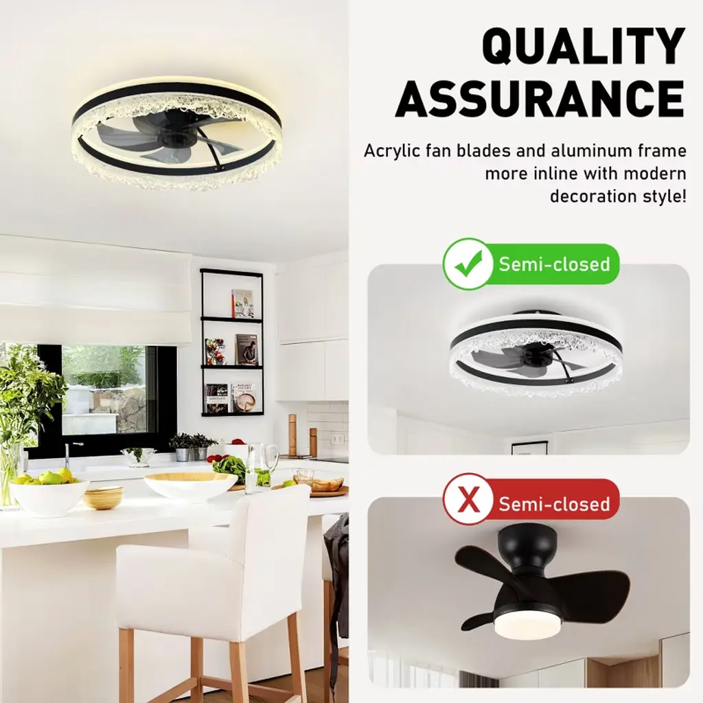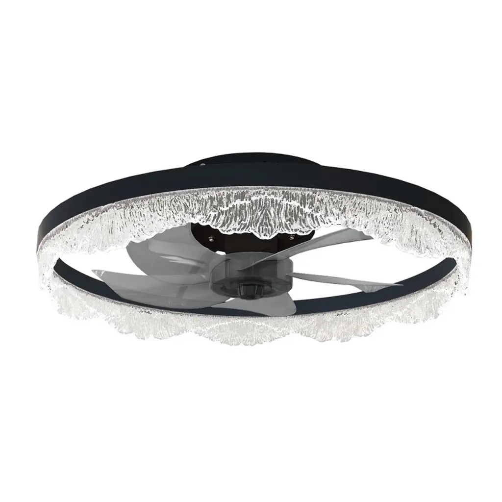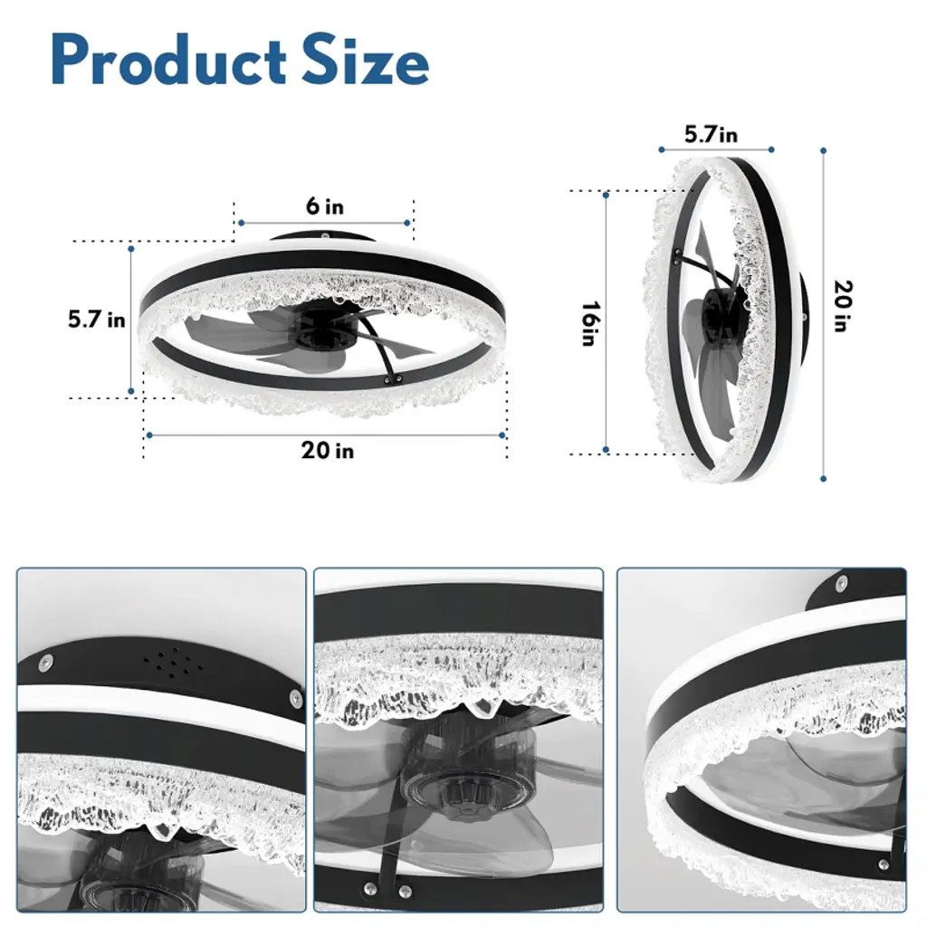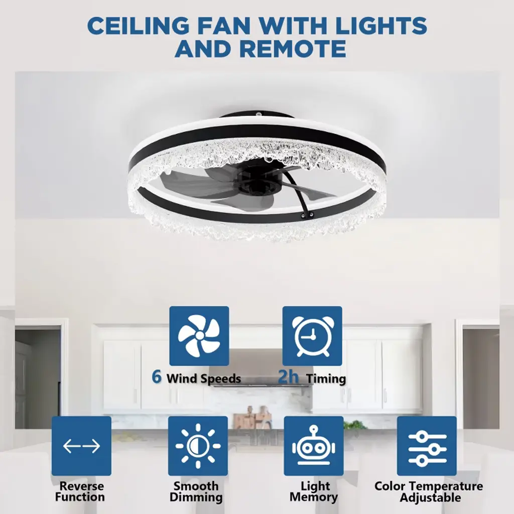 Upgrade your bedroom, nursery, or study with this sleek flush ceiling fan with light¡ªa space-saving solution that blends modern ceiling fan design with the sparkle of a crystal fixture. Designed for rooms with low ceilings, this flush mount ceiling fan features a quiet motor and hidden blades that deliver strong airflow with minimal noise. The integrated LED light panel offers 3 dimmable color modes¡ªWarm, Neutral, and Cool¡ªwhile the included remote and app control make it easy to adjust brightness, fan speed, or set a timer. Perfect for those seeking both comfort and elegance in compact spaces, this ceiling fan with light and remote brings functional beauty into any modern home.