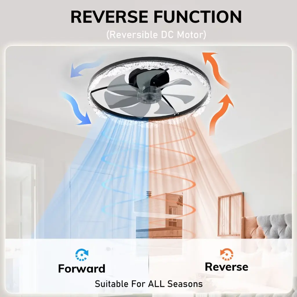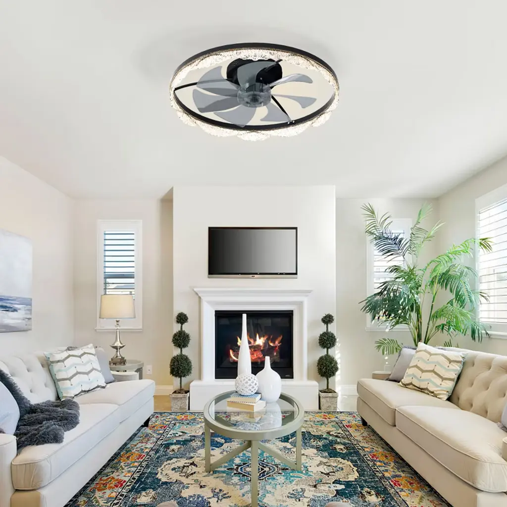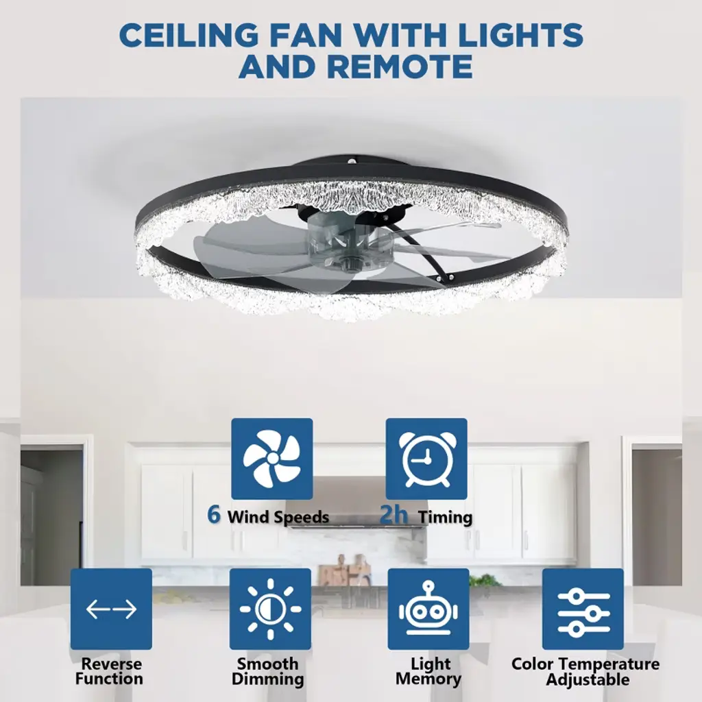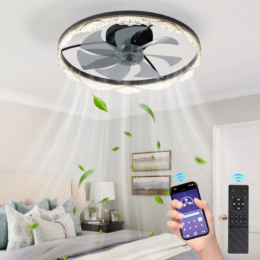 Bring cooling comfort and crystal charm to your space with this flush ceiling fan with light¡ªa perfect blend of style and practicality. Whether for the bedroom, nursery, kitchen, or study, this modern ceiling fan is available in three sizes: 16", 20", and 24" to suit different room needs. Hidden fan blades and a sleek flush mount ceiling light design save space, while the integrated LED light kit delivers dimmable lighting with three color temperatures. Control it all with a remote or app¡ªlight, wind, and timer, all at your fingertips. Perfect for modern homes with low ceilings, this ceiling fan with light and remote adds both elegance and efficiency.