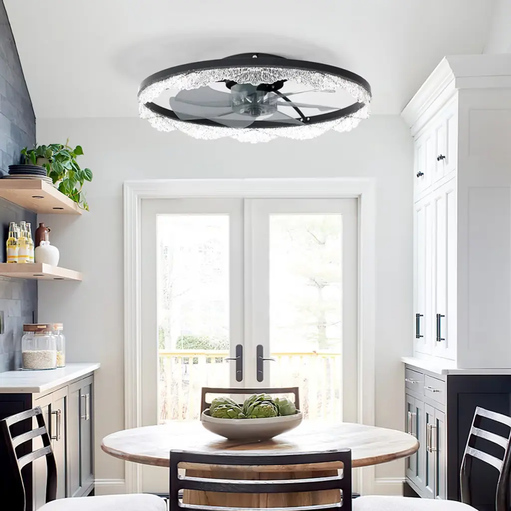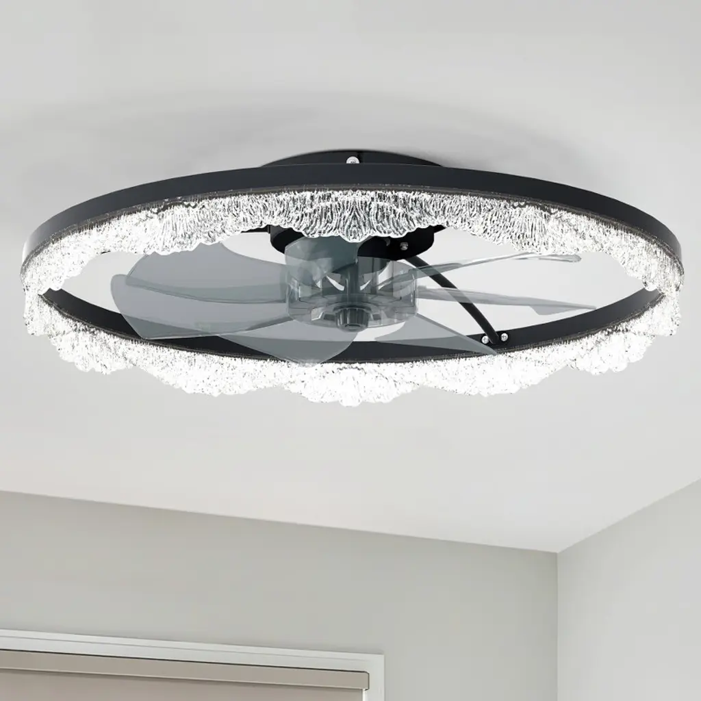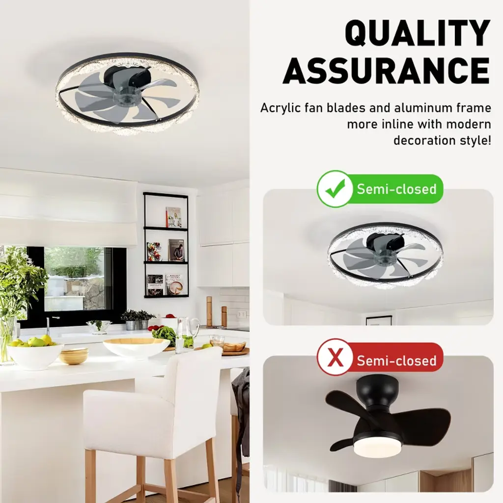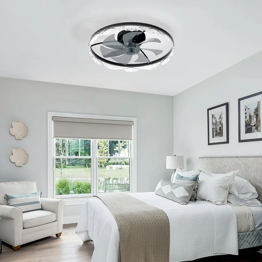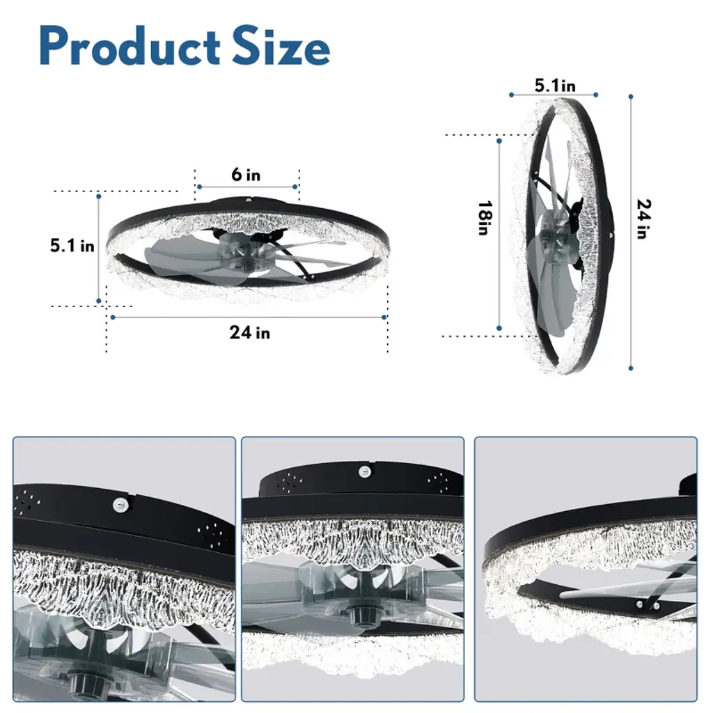 Bring cooling comfort and crystal charm to your space with this flush ceiling fan with light¡ªa perfect blend of style and practicality. Whether for the bedroom, nursery, kitchen, or study, this modern ceiling fan is available in three sizes: 16", 20", and 24" to suit different room needs. Hidden fan blades and a sleek flush mount ceiling light design save space, while the integrated LED light kit delivers dimmable lighting with three color temperatures. Control it all with a remote or app¡ªlight, wind, and timer, all at your fingertips. Perfect for modern homes with low ceilings, this ceiling fan with light and remote adds both elegance and efficiency.