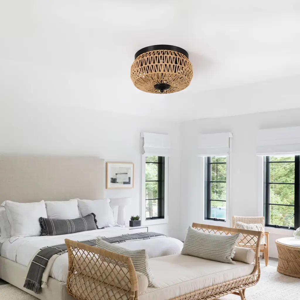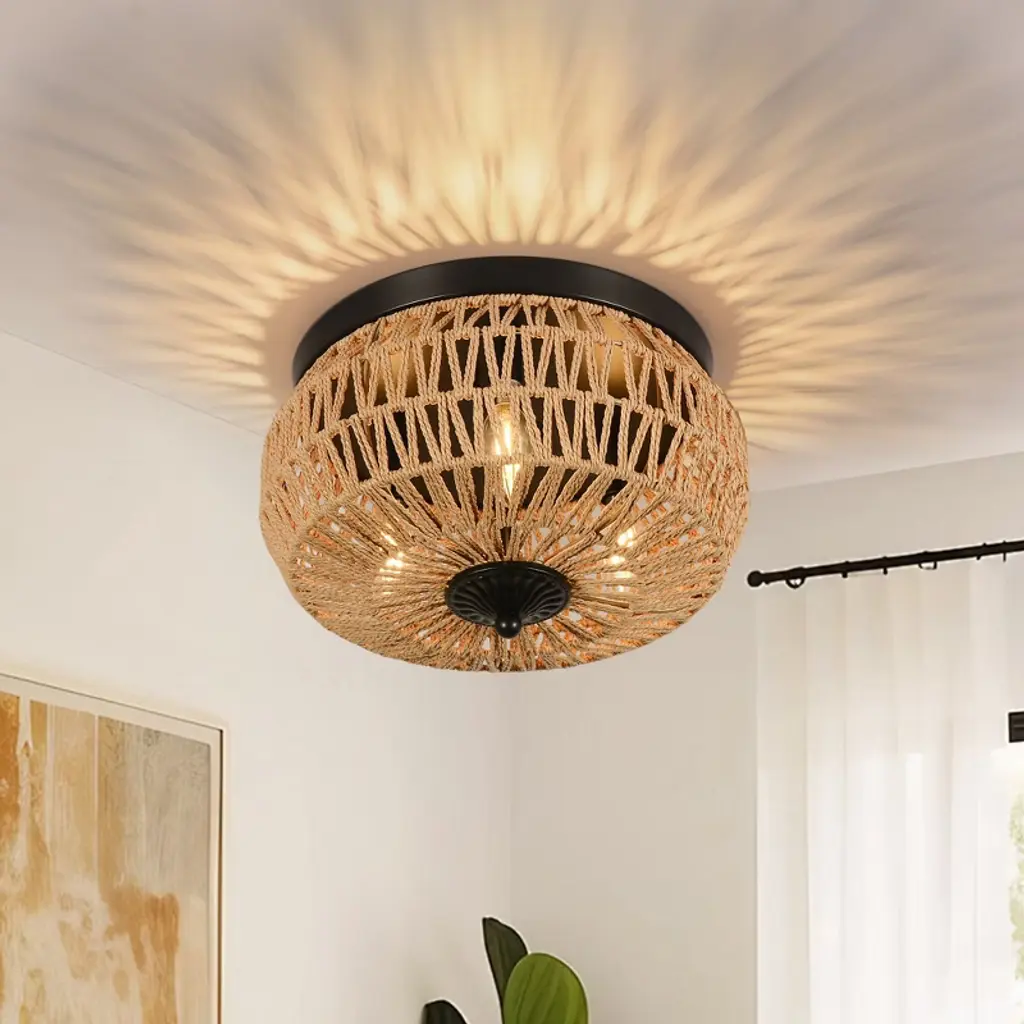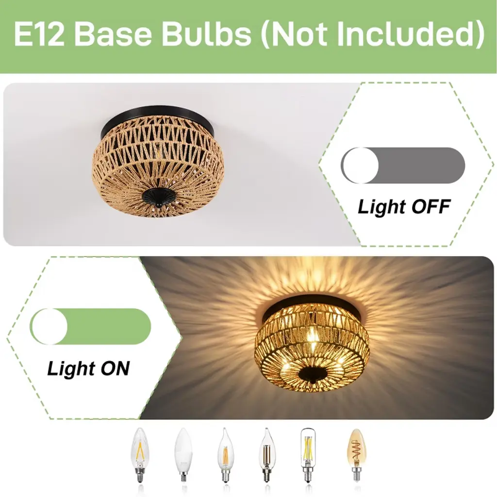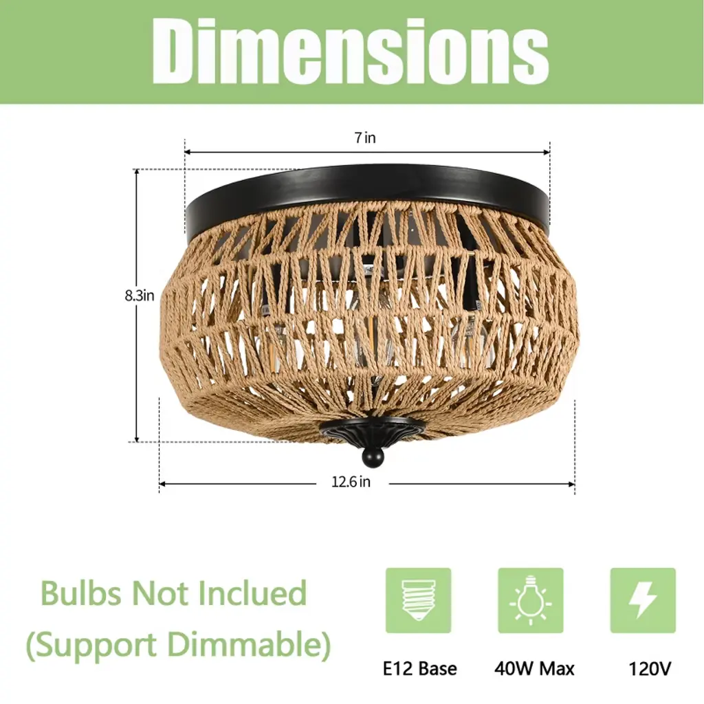 100% Handcrafted Woven Rattan: This exquisite flush mount ceiling light features a beautifully woven rattan shade, meticulously crafted by skilled artisans. Its hollow design allows light to spill in all directions, creating a stunning interplay of light and shadows that infuses your space with warmth and charm. Each fixture is one-of-a-kind, showcasing the artistry of hand-woven craftsmanship.