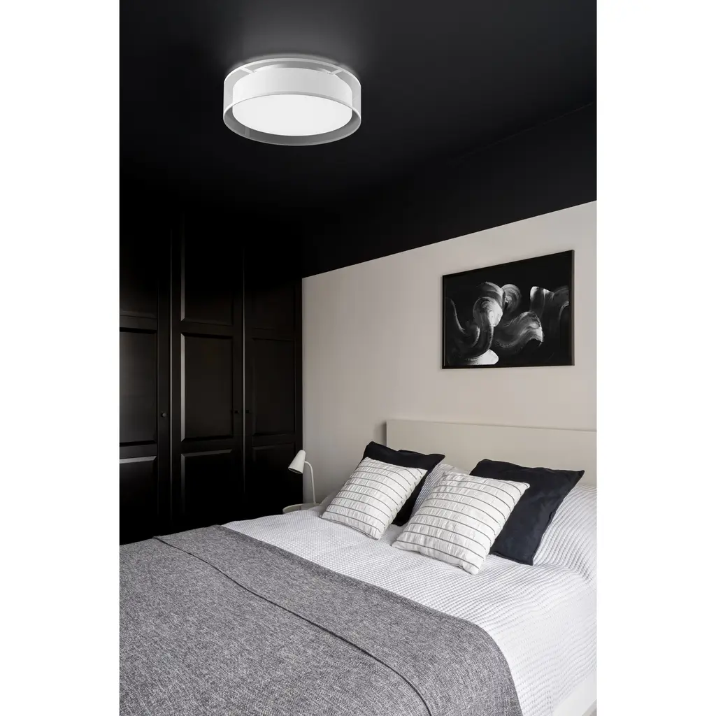 An organza or textured linen band surrounds a concentric polymeric diffuser spreading even light from the LED source. Finely hand-tailored, the fabric shade contributes a soft sophistication to the modern interior. Applicable as a flush mount, pendant and in numerous sizes and fabric colors to suit your context.