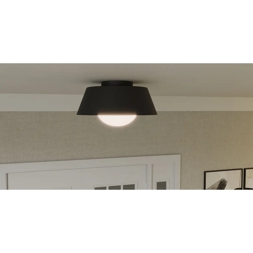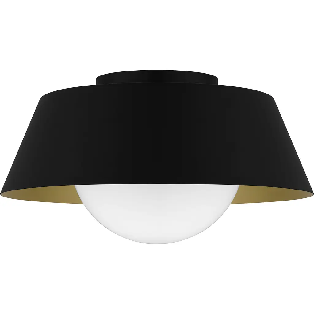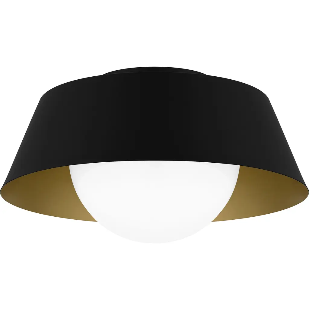 The transitional style of the Damascus flush mount is both sleek and modern. A simple drum silhouette is finished in matte black on the outside, painted with a warm brass interior for optimal illumination. An opal glass globe completes the overall look, making Damascus a perfect choice in any space.
