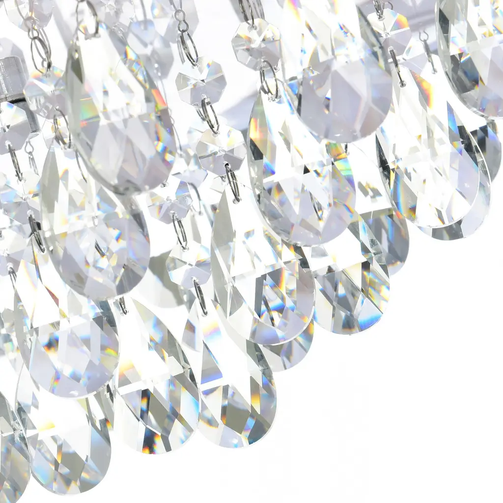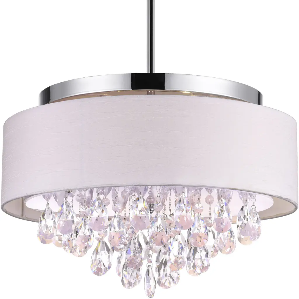 This breathtaking Dash 18'' 4-Light Drum Shade Flush Mount with Chrome Finish and Off-White Shade brings a clean, refined elegance to low-ceiling or compact spaces. Designed with an 18-inch drum shade in off-white fabric and a hidden canopy, this flush mount fixture features strands of sparkling faceted clear crystals that catch and reflect light beautifully. A perfect choice for adding visual openness, softness, and glamour to bedrooms, hallways, or entryways. E26 bulbs not included. Finish: Chrome Light Count: 4 Light Source: E26 Base (Bulbs Not Included) Shade Color: Off-White Material: Fabric, Metal, Crystal Style: Transitional / Glam / Contemporary